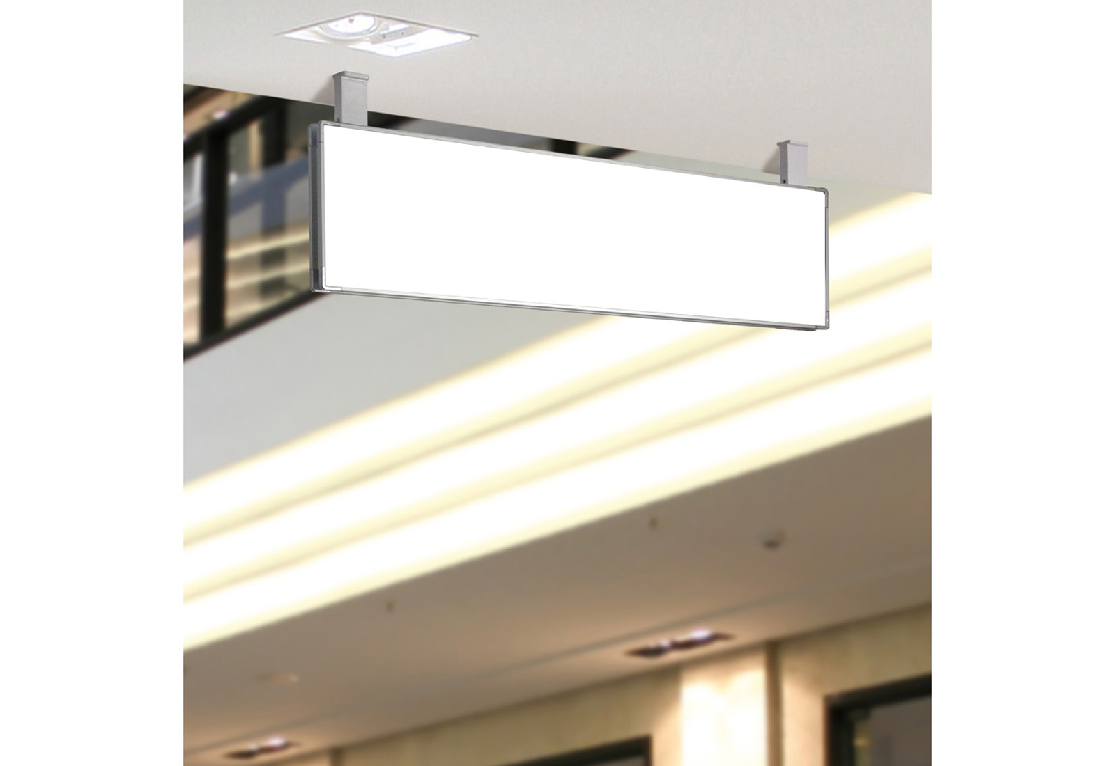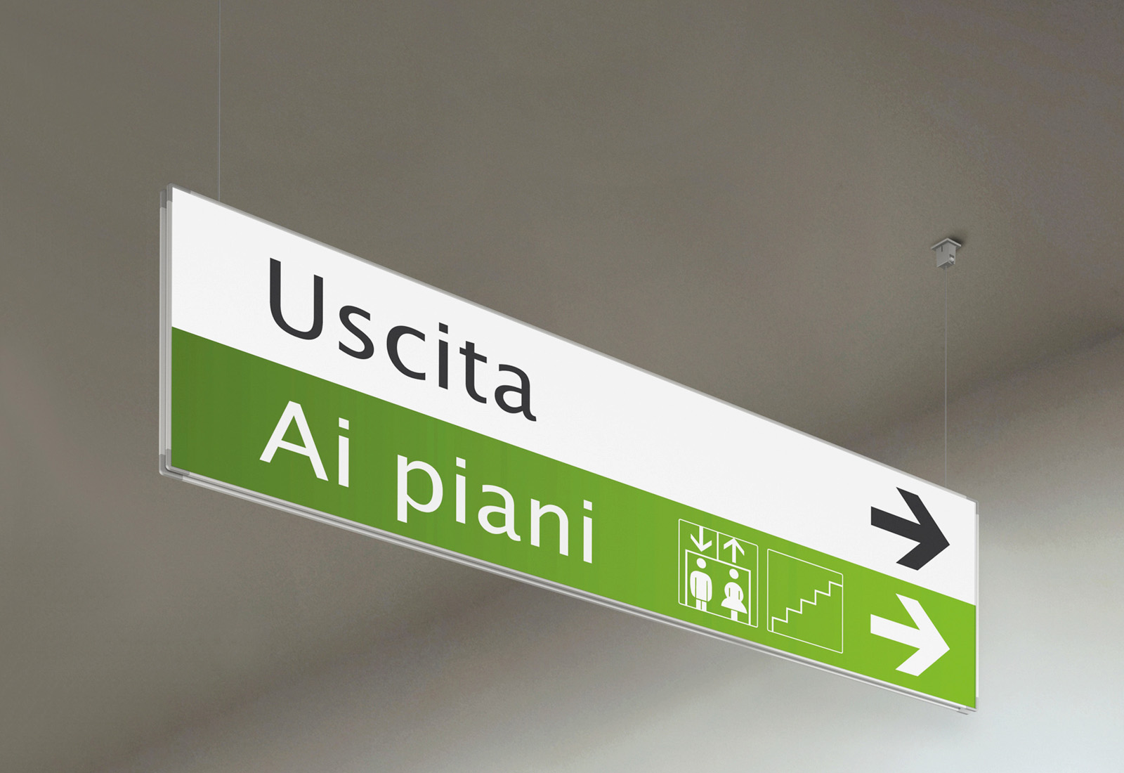 Die signcode Beschilderungsserie ist der Bestseller im Bereich Wegleitsysteme. Das Hängeschild signcode ceiling besteht aus silber eloxierten Aluminiumprofilen. Es ist in vielen Grössen, ein- oder doppelseitig als Wand-, Decken- oder Fahnenschild erhältlich. Damit macht signcode Ihre moderne und flexible Gebäudebeschilderung komplett. Das abgehängte Wegweiserschild signcode verfügt über eine transparente PS-Abdeckung, in die selbst ausgedruckte Papierseiten ganz einfach eingelegt und wieder ausgetauscht werden können. Der Austausch der Informationen ist schnell und ohne Werkzeug möglich. Natürlich kann die Abdeckung auch direkt bedruckt oder mit Folie beklebt werden, was ein das Öffnen der Hinweisschilder durch Unbefugte verhindert. Ein gephaster, diskreter Rahmen und die silber beschichteten Ecken aus ABS machen signcode zu einem variablen und eleganten Hingucker. Die Wegweisschilder der signcode-Linie sind geeignet zur Beschilderung von öffentlichen Einrichtungen, Krankenhäusern, Bürogebäuden und allen weiteren Gebäuden, in denen sie den Besuchern und Kunden dir richtige Orientierung geben.