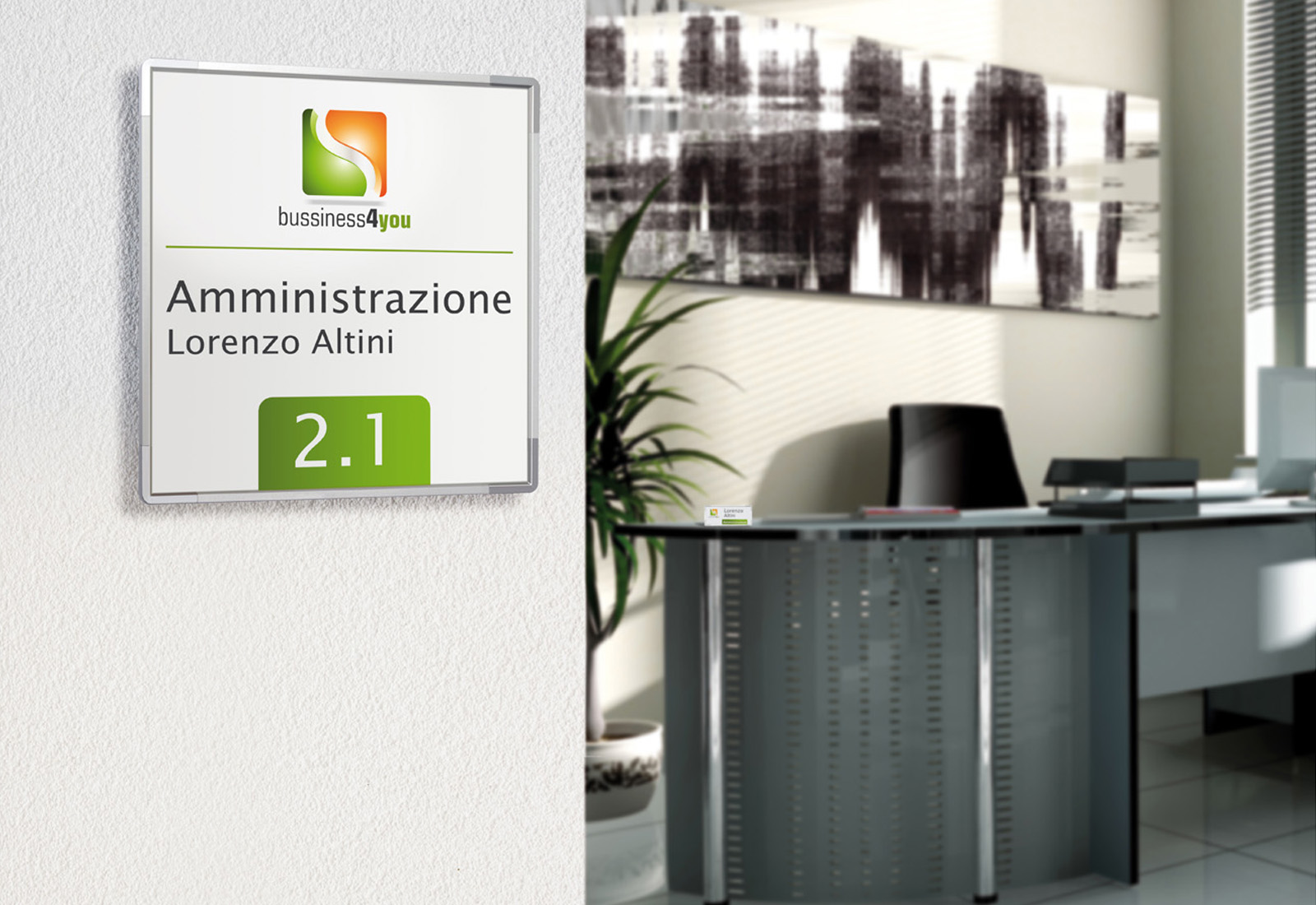 Das Wandschild signcode wall aus der Beschilderungsserie signcode ist in vielen Grössen erhältlich. Damit macht signcode Ihre moderne und flexible Gebäudebeschilderung komplett. Das a Wegweiserschild signcode wall verfügt über eine transparente PS-Abdeckung, in die selbst ausgedruckte Papierseiten ganz einfach eingelegt und wieder ausgetauscht werden können. Der Austausch der Informationen ist schnell und ohne Werkzeug möglich. Natürlich kann die Abdeckung auch direkt bedruckt oder mit Folie beklebt werden, was ein das Öffnen der Hinweisschilder durch Unbefugte verhindert. Ein gephaster, diskreter Rahmen und die silber beschichteten Ecken aus ABS machen signcode zu einem variablen und eleganten Hingucker. Die Wegweisschilder der signcode-Linie sind geeignet zur Beschilderung von öffentlichen Einrichtungen, Krankenhäusern, Bürogebäuden und allen weiteren Gebäuden, in denen sie den Besuchern und Kunden dir richtige Orientierung geben.