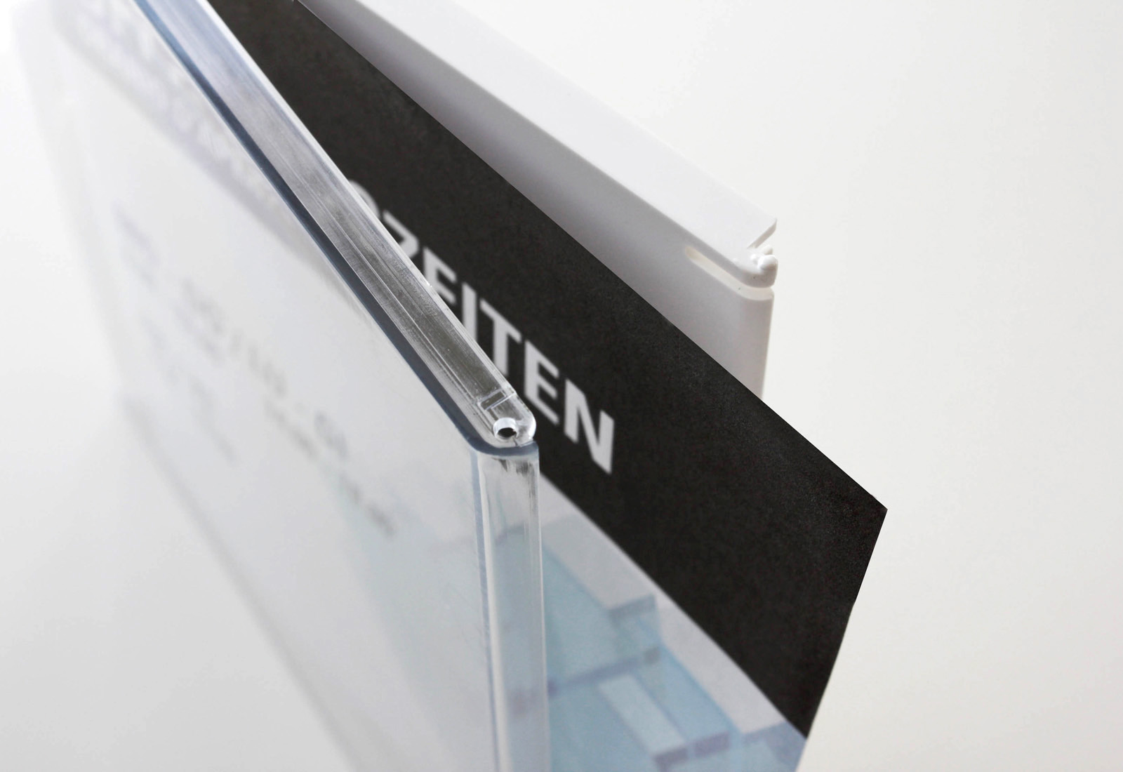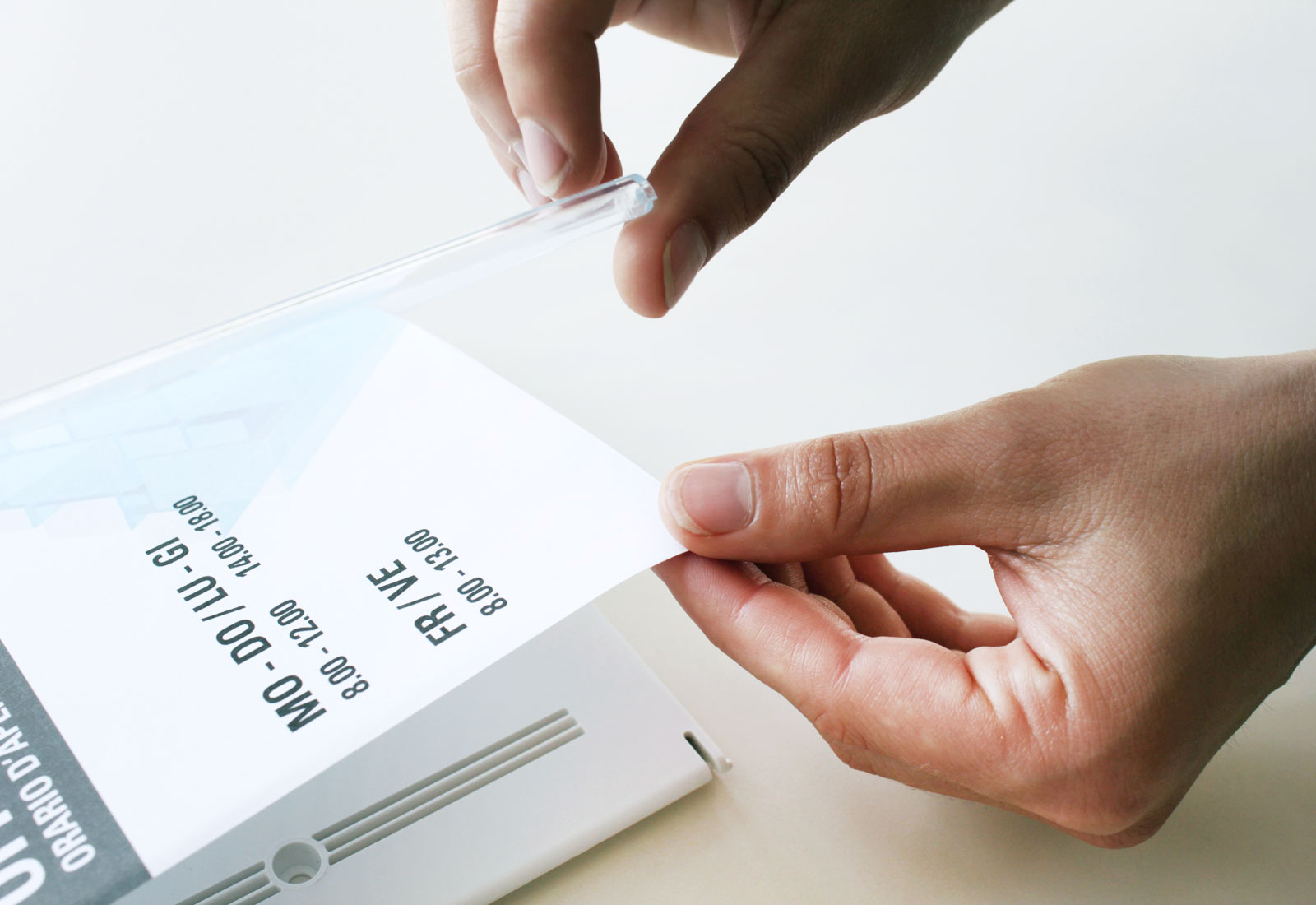 Das Türschild smartquick ist klein, praktisch und schnell montiert. smartquick besteht aus hochwertigem Polycarbonat Spritzguss lässt sich einfach und schnell an der Wand montieren. Ob mit Schraube und Dübel oder doppelseitigem Panzerband auf glatten Oberflächen - der smartquick ist überall dort im Einsatz, wo Informationen rahmenlos und staubgeschützt präsentieren werden sollen. Zum austausch öffnet sich das transparente Cover nach links oder rechts. Die Rückwand ist weiß und bildet den perfekten Hintergrund für alle eingebrachten Informationen.