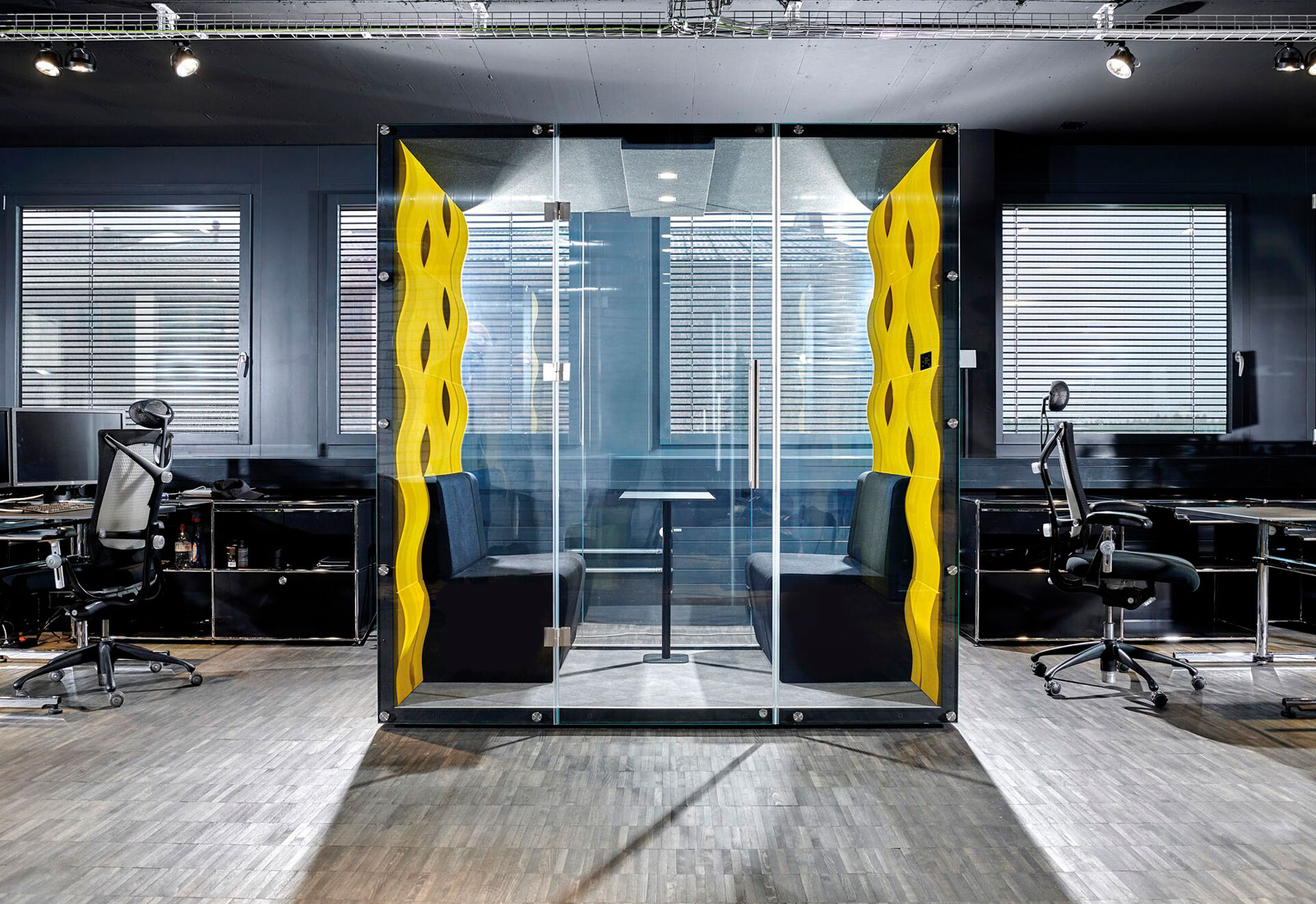 Auch das Glas der Türen besitzt hohe Schalldämmwerte. Je nach Benutzerpräferenz können unsere Akustikboxen mit einer oder zwei Glaswänden ausgestattet werden.