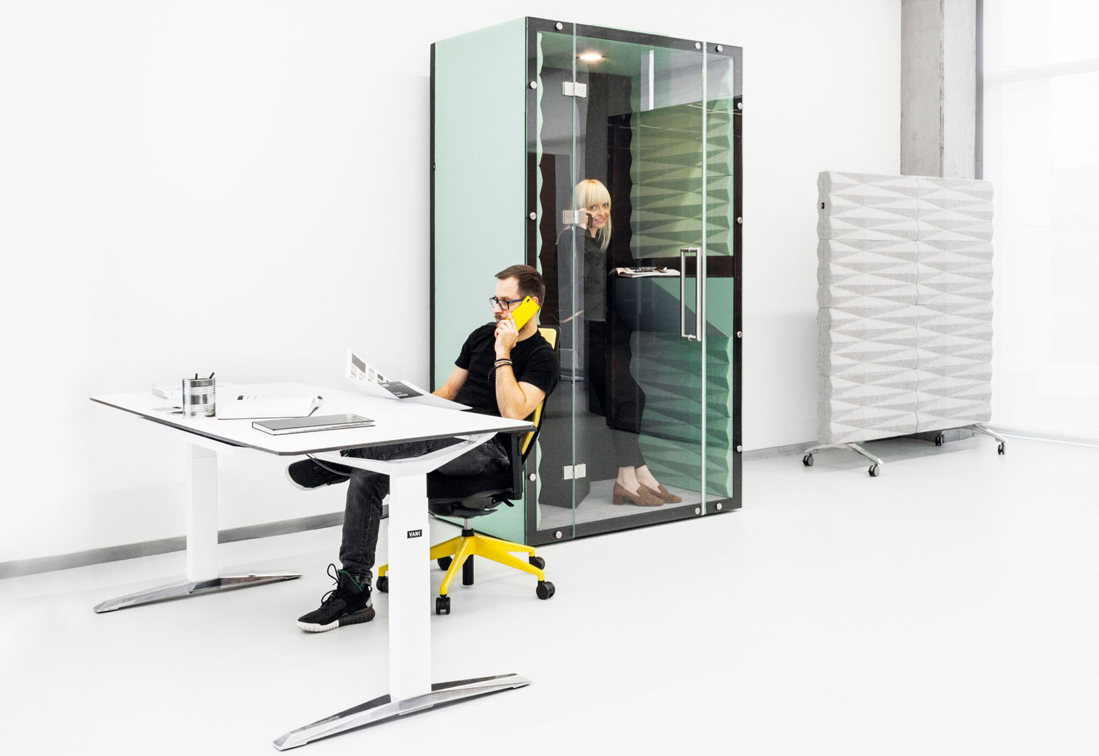 VANK Akustikboxen sind eine Oase der Ruhe in Großraumbüros und bei "open space" Bürokonzepten. Unsere Akustikboxen bieten als Raum-in-Raum-Lösung entspanntes, schallgeschützes Arbeiten - auch wenn es drumherum turbulent zugeht. Die Akustikboxen gibt es in verschiedenen Größen, sodass bis zu 6 Personen diese schallgeschützte Raum-in-Raum-Lösung nutzen können. In der Ausführung für eine Person kann sie für Telefongespräche oder als Rückzugsort für Momente besonderer Konzentration dienen. Größere Akustikboxen lassen sich für vertrauliche Videokonferenzen oder als Besprechungsraum einsetzen.