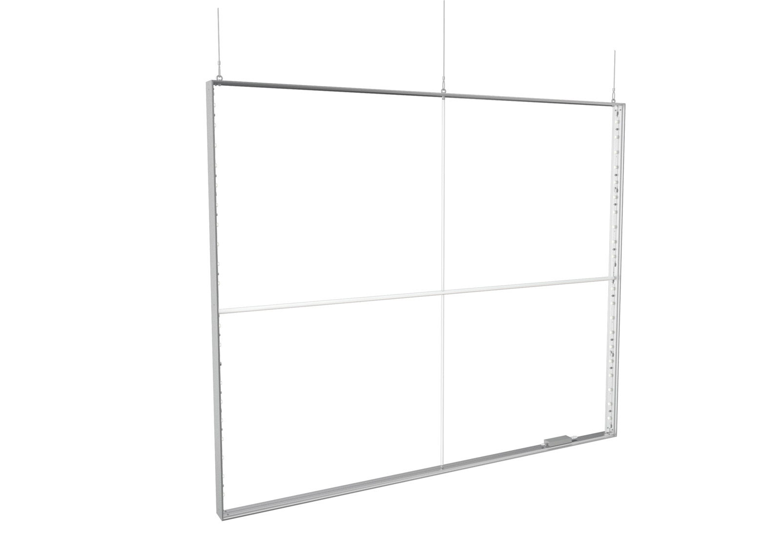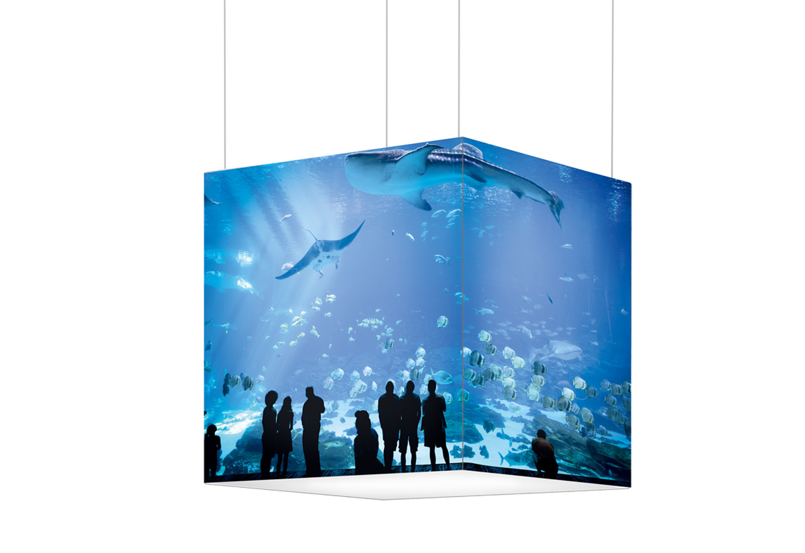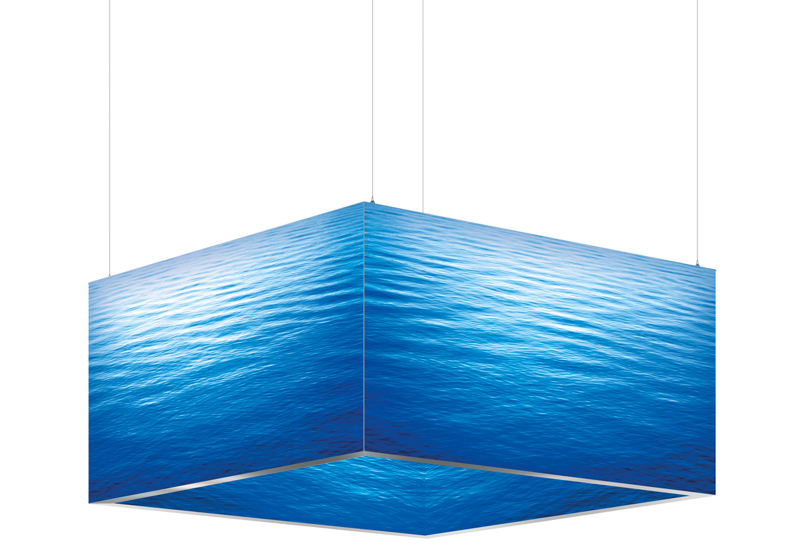 With the Cube, the light cube, large ceiling surfaces are suspended. Due to the low weight, edge lengths of up to 2.5 meters are possible.