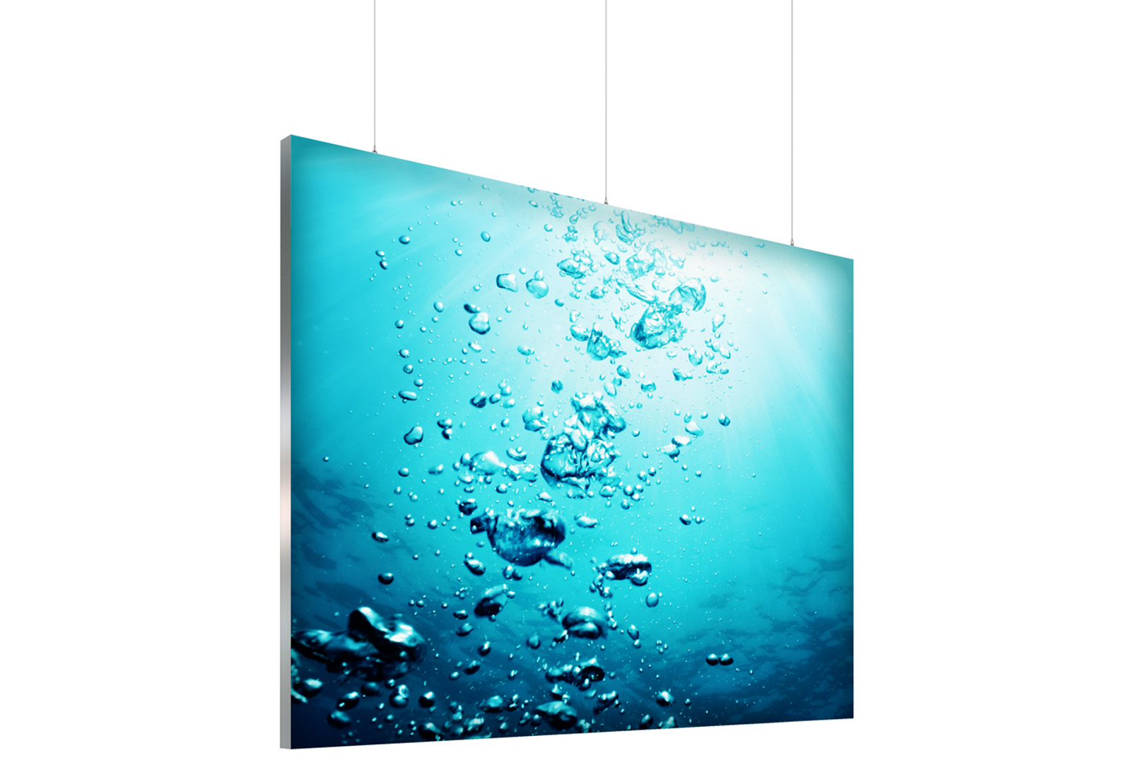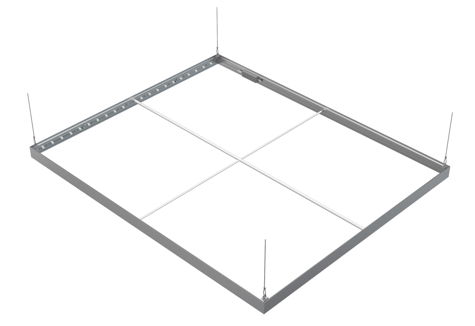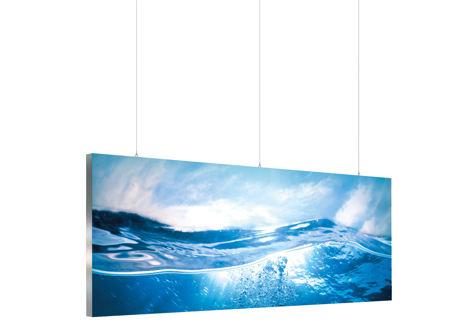 With the Cube, the light cube, large ceiling surfaces are suspended. Due to the low weight, edge lengths of up to 2.5 meters are possible.