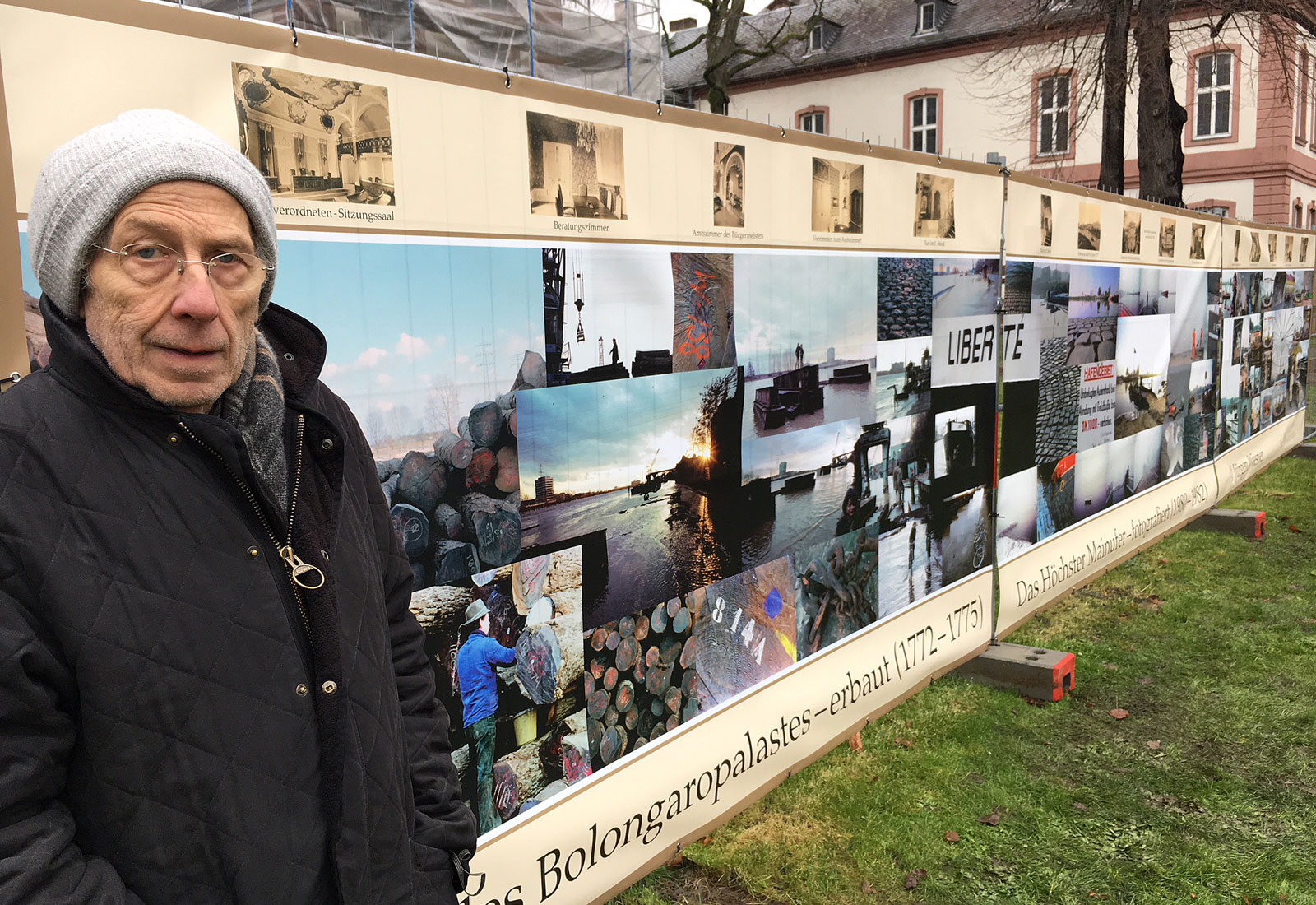 In the morning and evening light, Jürgen Wiesner photographed the events from 1980 to 1982 on the banks of the Main. In 1981 the harbor was closed. The pictures by Jürgen Wiesner show a kaleidoscope of the everyday, which can not be seen as it is today: the old yaw ferry, a street sweeper with swans, loading cranes in the fog, wet cobblestones, timber for the furniture factories, rusted anchor chains. With his "wall of thought", the photographer accompanied the demolition of the Grossmarkthalle at the ECB construction site. In the garden of the Bolongaro Palace, the "wall of thought" now covers the fence - complemented by historical photographs of the interior of the palace from the time when it was still the town hall of the city of Höchst.