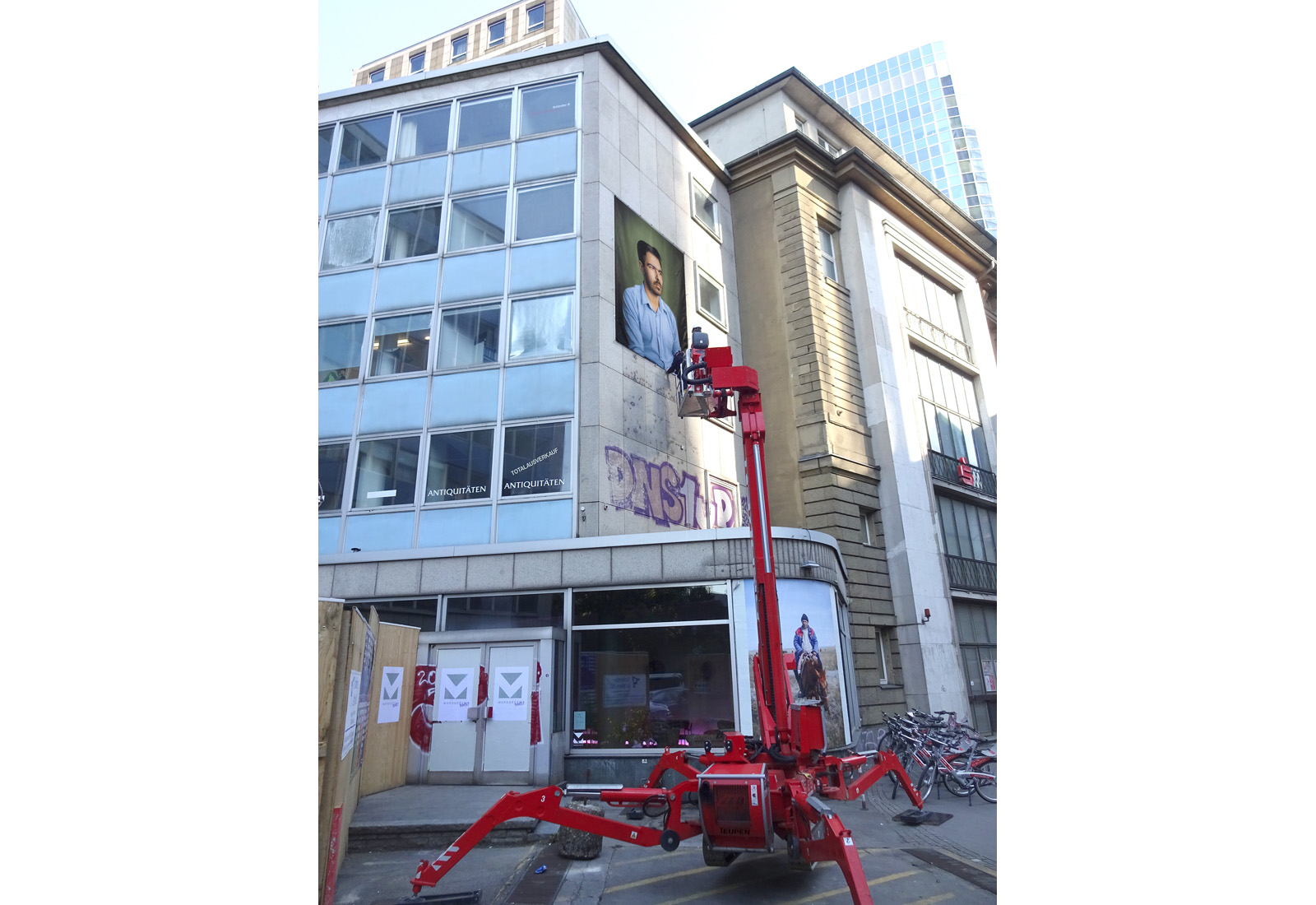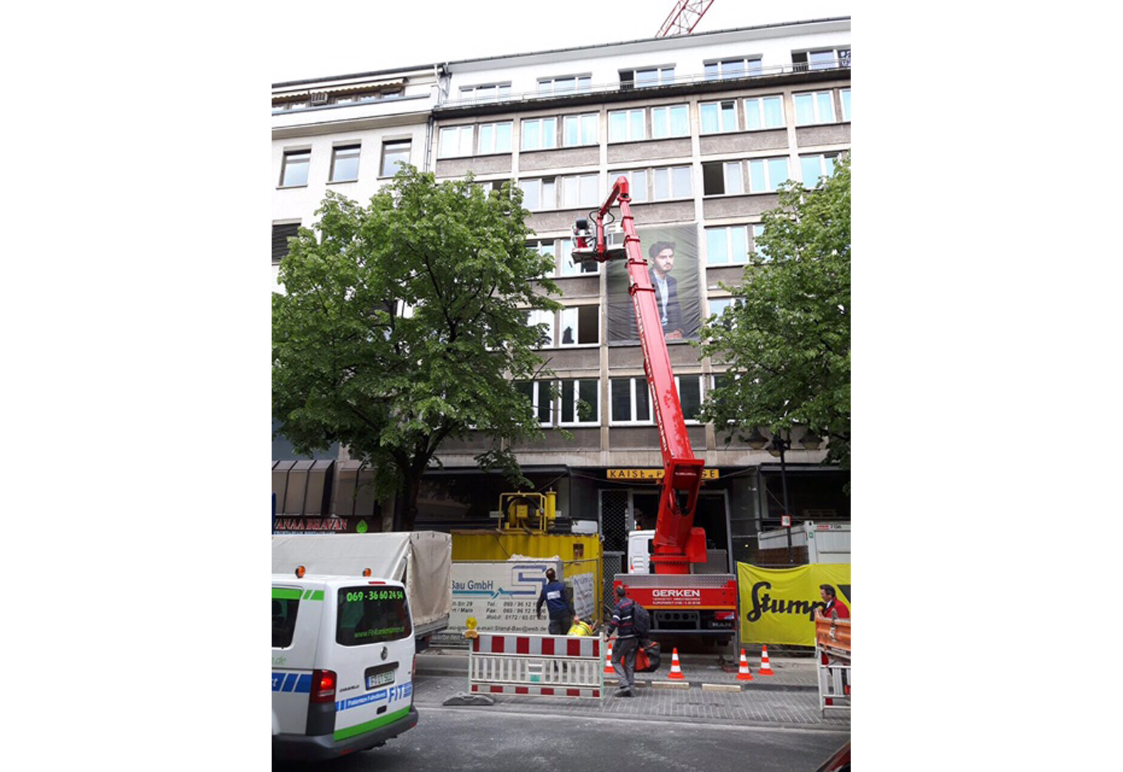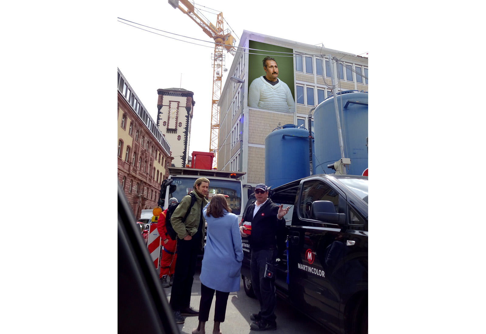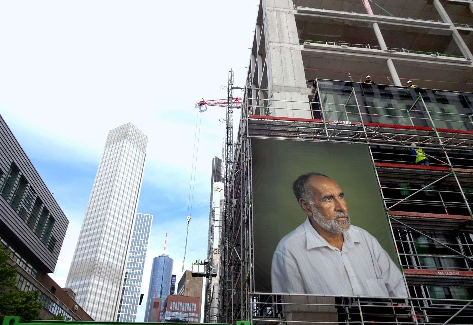 At the moment, 13 of his portraits can be seen as large formats on facades across Frankfurt. The art project titled "New Citizens" aims to bring those who arrived in Frankfurt from anonymity and give them a face. MARTINCOLOR supported this project as a sponsor, made all façade banners and installed them in the following locations: St. Matthew's Church, Holy Trinity Church, Literaturhaus, WINX-Tower, Kornarkardenmarkt, Friedberger Anlage Synagogue, Kaiserpassage, Schweizer Straße 5, Neue Mainzer Straße 57, Frankfurter LAB , Universitätsbibliotek Bockenheim, Central Station.
