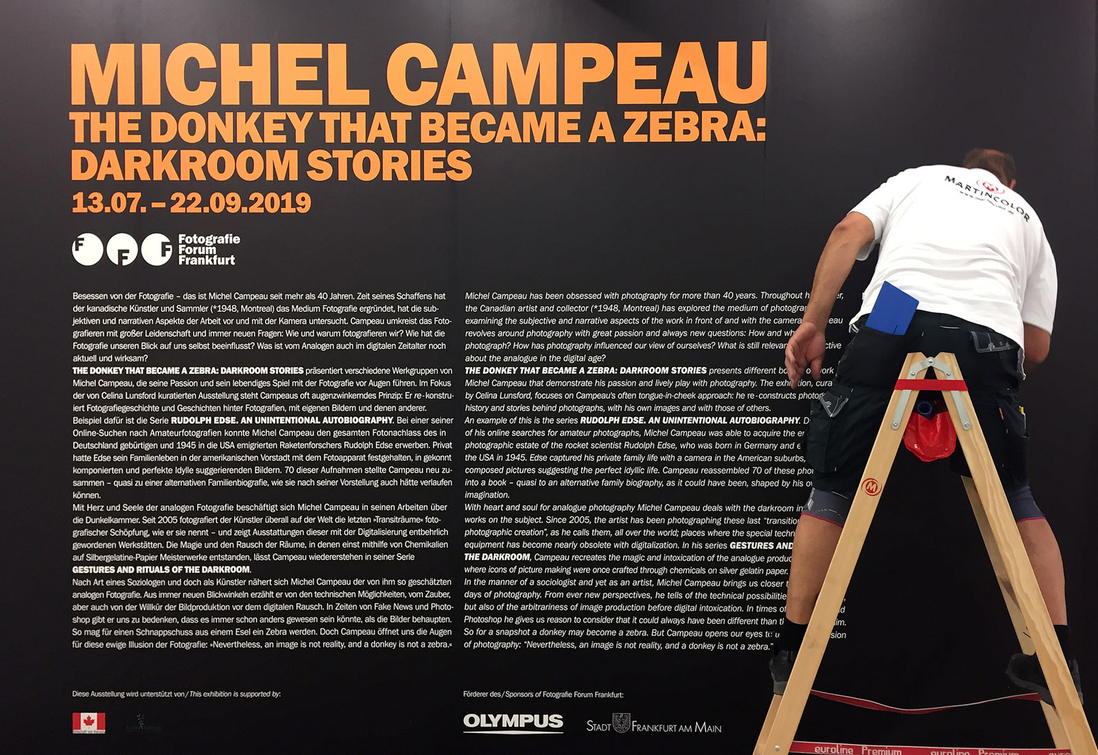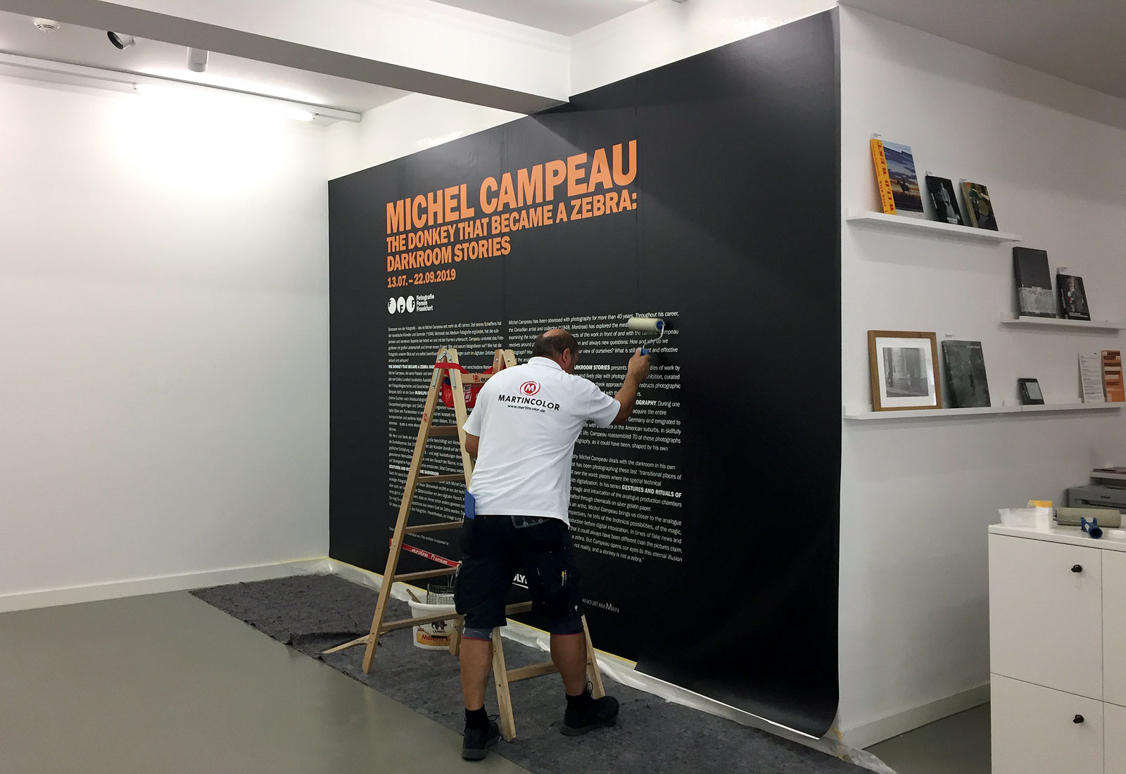 Under the title THE DONKEY THAT BECAME A ZEBRA: DARKROOM STORIES, the Fotografie Forum Frankfurt presents works by the photographer Michel Campeau. The Canadian artist has repeatedly explored and analyzed photography throughout his entire creative period. MARTINCOLOR produced textile banners that were suspended from the ceiling, large-format wallpaper and lettering advertising technology for the entrance area of the photo exhibition. For more information, please contact our experts for exhibition productions on +49 (0) 69 756080-0.