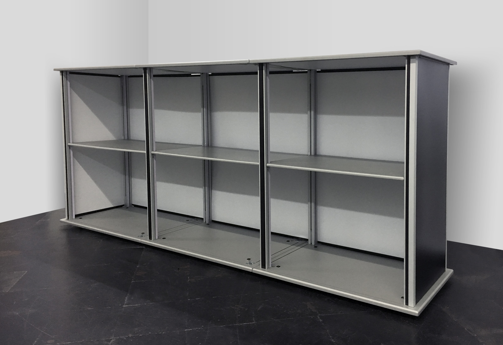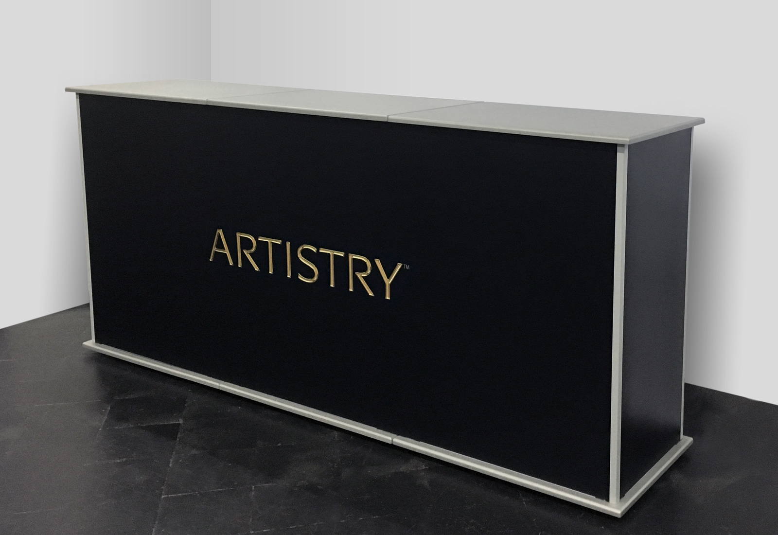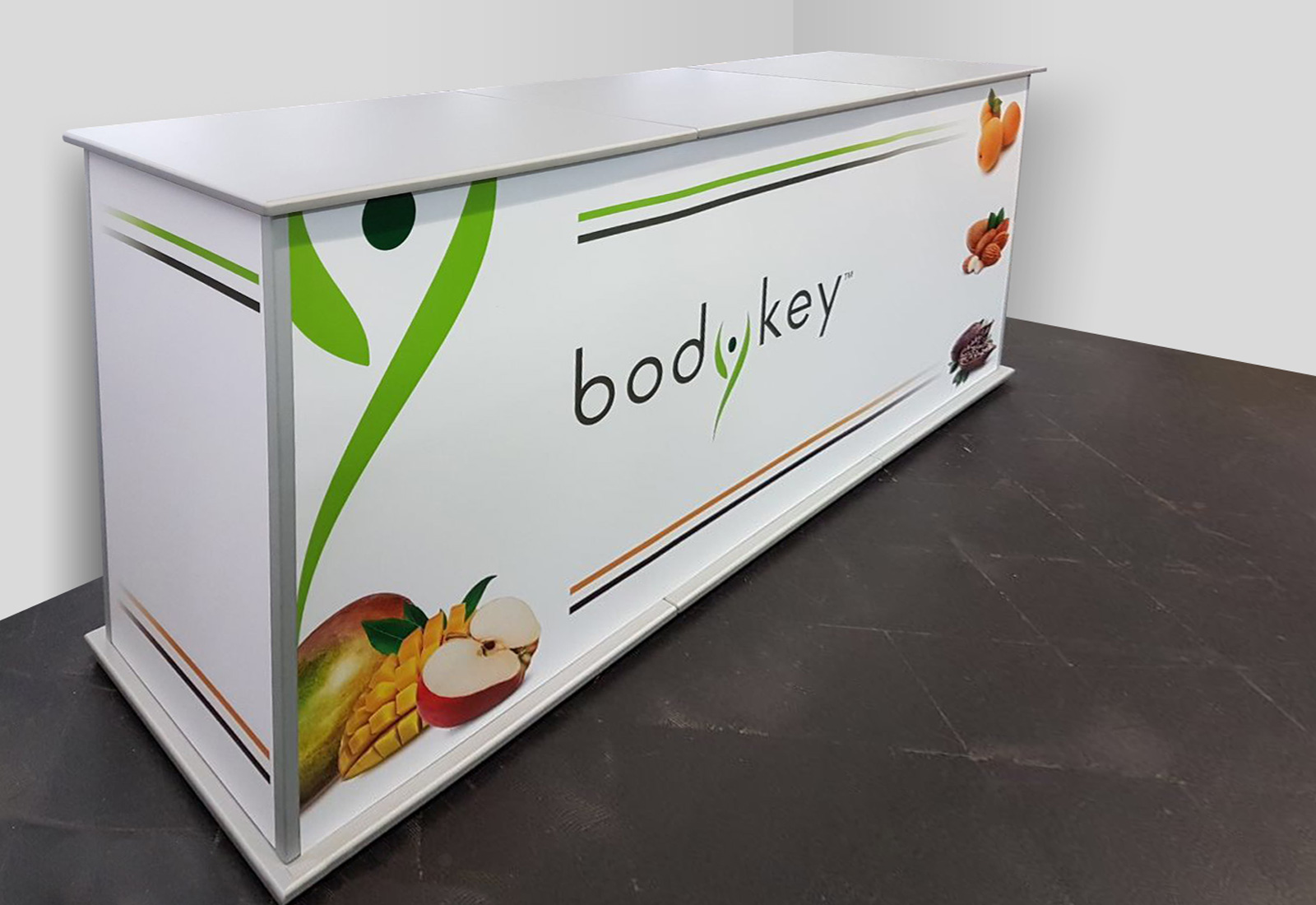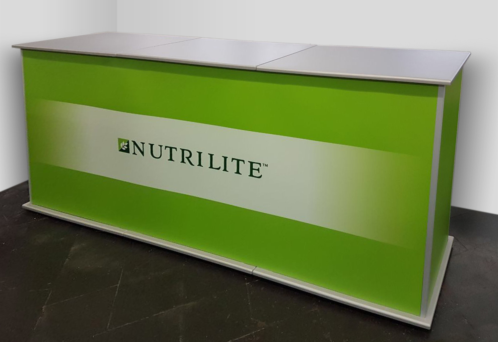 It was important for the American direct marketer Amway to use a counter model that is modularly expandable for product presentations at the trade fair. The choice fell on the bar model ISObar. The ISObar counter is available in straight and curved design. In addition, corner and end elements are available. This can be used to build individual counter sizes depending on the application. For Amway the straight counter module was used. For covering with individual graphic printing, the finished printed and laminated graphic panels are equipped with magnets on the back and then magnetically applied to the frame element of the counters. Thus, a single basic model can be provided with different advertising information.