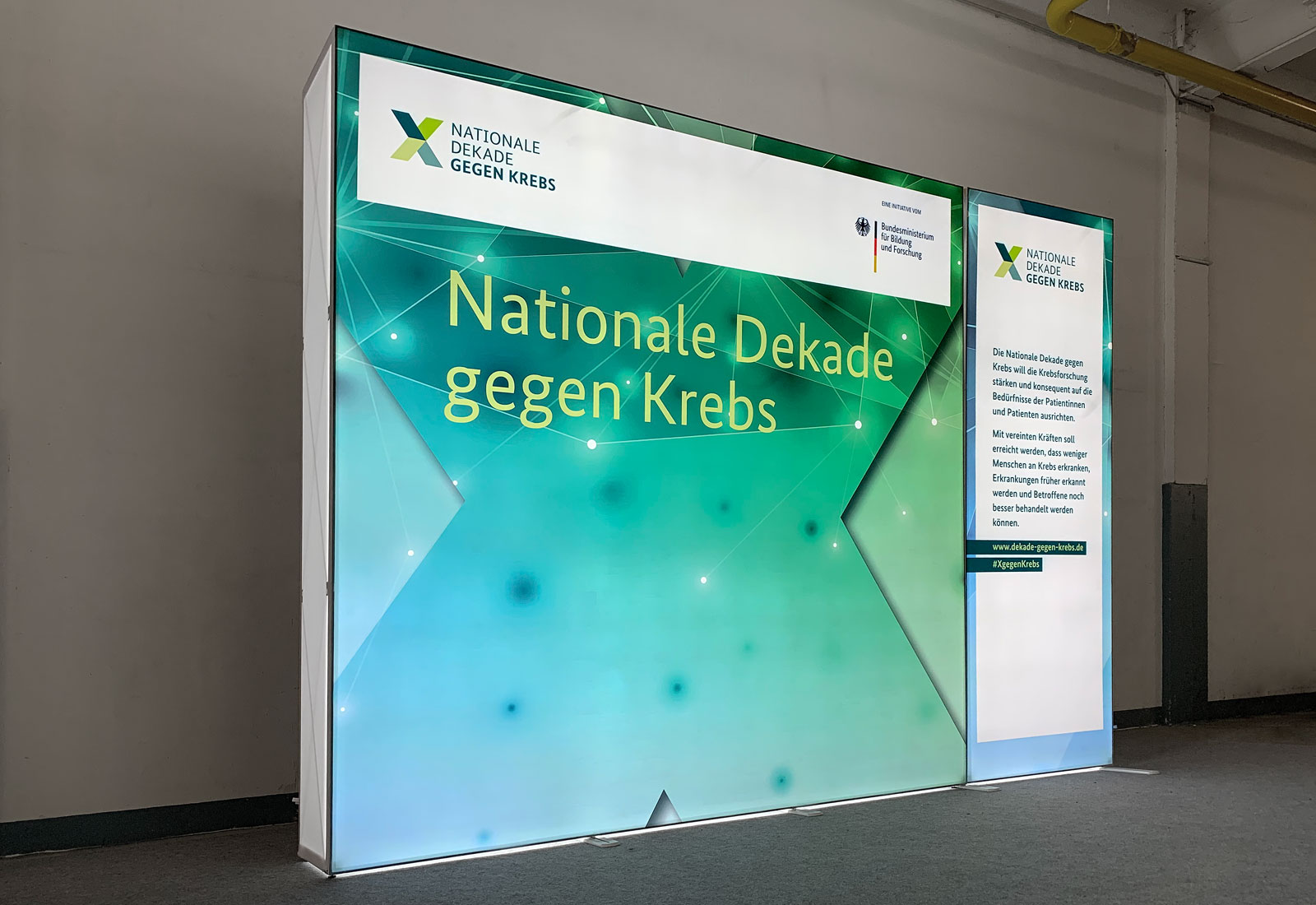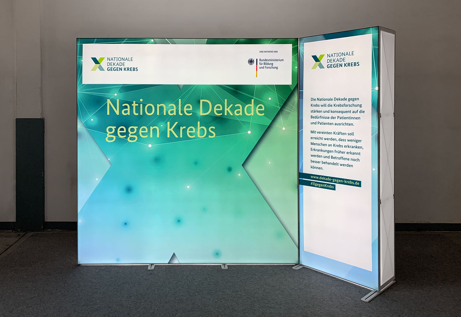 On behalf of the PR PETUUM agency, we produced the modular and mobile LED exhibition wall GRID Lightbox for the Bundesministerium für Bildung & Forschung. Just like the well-known folding displays, the GRID Lightbox consists of a scissor grid and can be "popped up" in no time at all. The system now becomes an illuminated wall thanks to rollable LED curtains that are hooked into the scissor grid structure. All that remains is to insert a textile slide cover at the front and back - and the illuminated wall is ready. Our GRID Lightbox illuminated walls are available in five different formats up to a width of 375 cm. All walls can be modularly combined with each other to create a large LED exhibition stand. Transportation is also impressive. All illuminated walls can be folded up small and transported in a handy trolley.