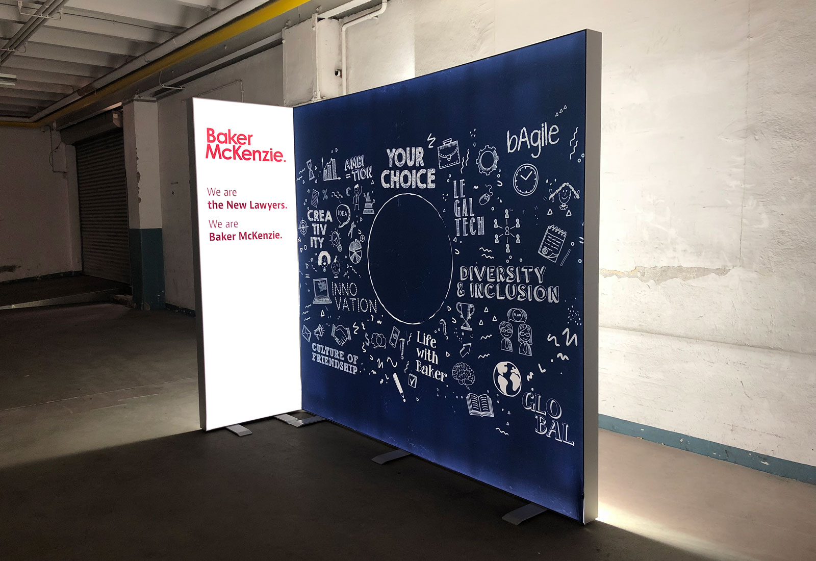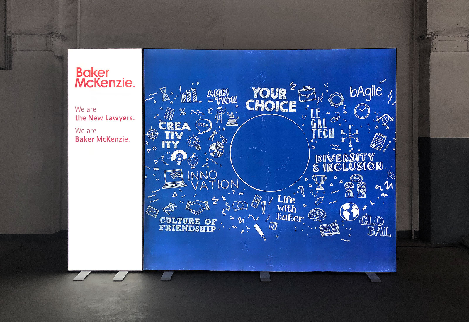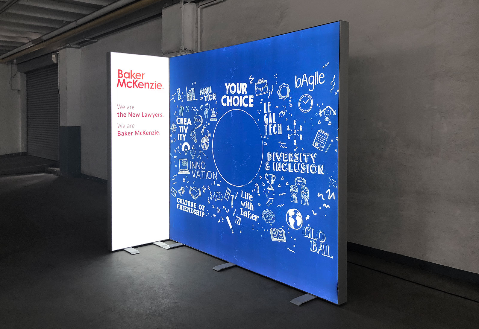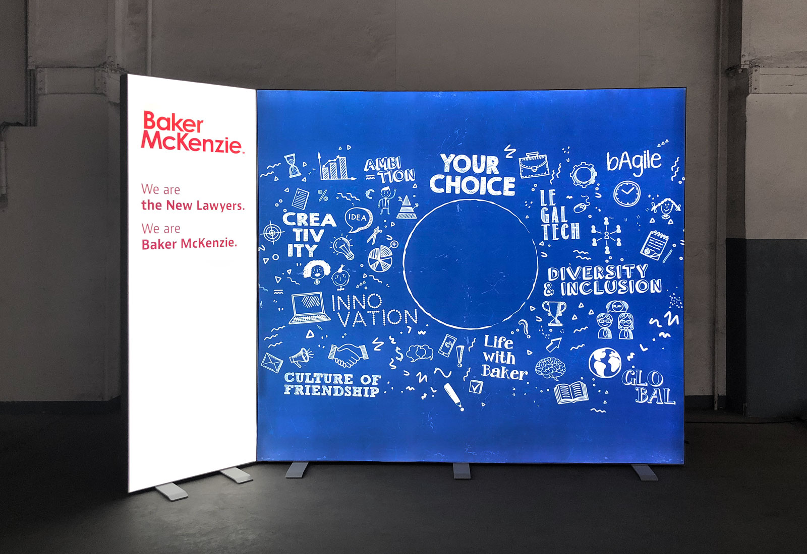 For the career fairs of the international law firm Baker McKenzie we produced a luminous exhibition stand. The system is OCTAlumina luminous walls, which were connected to each other at a corner. The luminous exhibition stands OCTAlumina can be produced in any desired size and construction. The system is made entirely of aluminum and makes a particularly noble appearance. OCTAlumina luminous walls can be equipped with diagonal voltage on both sides, so that this system technology is also very suitable for individualized partitions in the interior design and furnishing of office and event rooms.
