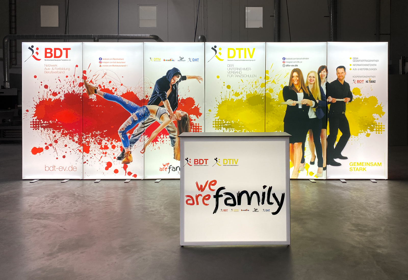 MARTINCOLOR produced ALU LightUp LED light frames in the size 100 x 230 cm for the customer “BDT Berufsverband Deutscher Tanzlehrer e.V.” This LED trade fair system is very suitable for a bright and colourful company presentation at any event, whether at a large exhibition centre or at a smaller event. The 8 cm wide aluminium frame is easy to assemble, even without tools. The power LEDs are already pre-assembled and only need to be connected to the power supply. The lighting effect is already in action. Of course, these frames can be extended and the individual textile prints can be replaced at any time. The GRID Lightbox counter in the middle is also equipped with power LEDs. Just like the light frames, the foldable scissor-grid framework is easy to assemble and dismantle and practical to transport.