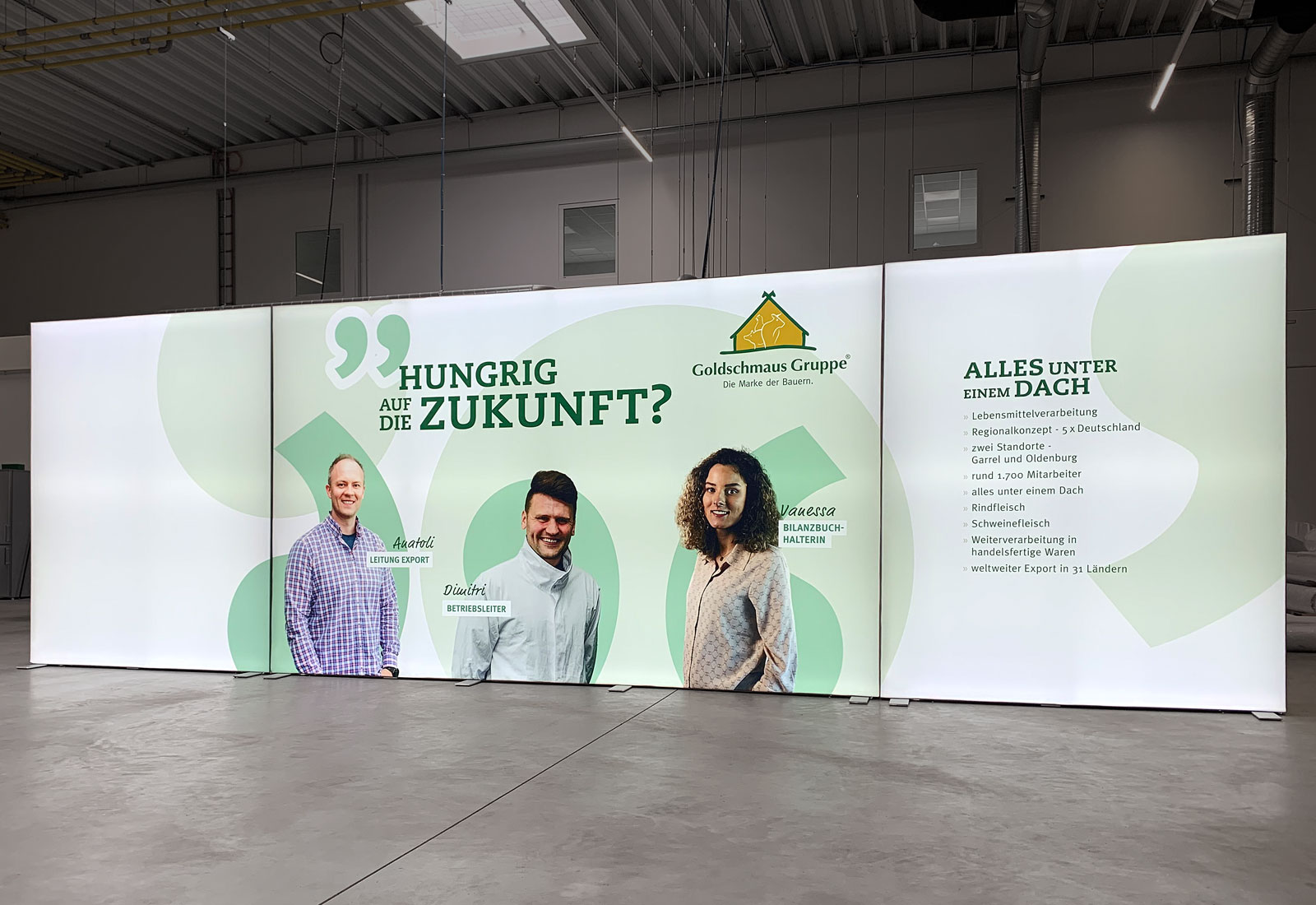 The ALU STAR LED exhibition wall is currently one of the most popular exhibition systems. Our customer Böseler Goldschmaus GmbH & Co. KG also made this choice, and rightly so! It is and remains an ideal system combination for a big and brilliant appearance! The walls, which are up to 500 cm wide, can be easily attached to each other and placed next to each other or across corners. Our customer preferred the variant of lined-up ALU STAR LED walls. The covering, which is printed on special textile slides, enables the individual graphic to continue to run across several systems. This guarantees a strong impression! It is guaranteed that the system can be set up and dismantled without any problems and only by one person. You don't need any tools, at most a step stool, to reach the system height. The individually printable textile covering is simply clamped into the groove of the system, which is made of high-quality aluminum. The ALU STAR LED wall system is available in various heights and widths and can be neatly stowed away and transported effortlessly in a robust carrying case. To add even more pizzazz, you can add screens to the system with monitor mounts. We would be happy to inform you about this! Contact us on +49 (0) 69 756080-0 or info(at)martincolor.de and together we will find your ideal exhibition stand solution.