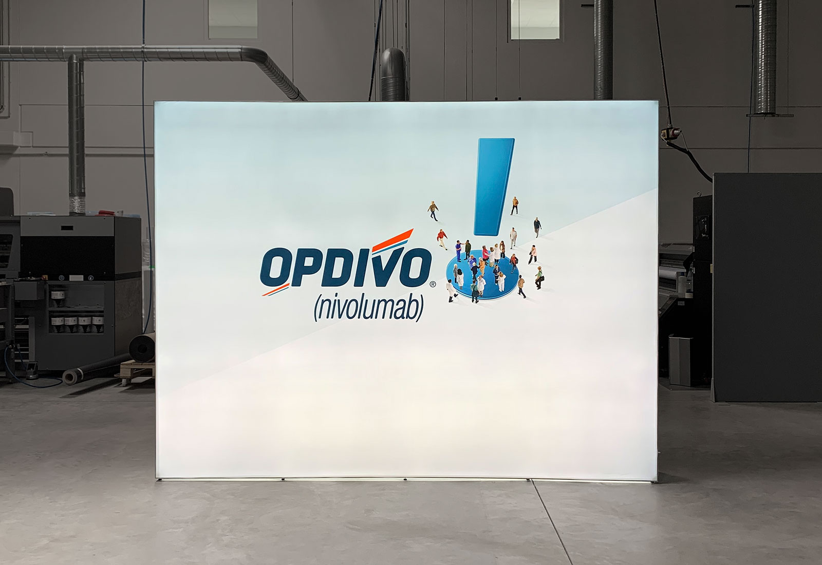 MARTINCOLOR produced a GRID Lightbox for the American pharmaceutical company Bristol-Myers Squibb. The LED exhibition wall can be set up quickly and easily. LED curtains are then hung in. The 400 cm long and 300 cm high scissor lattice system was covered with a meaningful covering made of textile slide material and got its imposing impakt through the radiant effect in the front and side area of the system. The rubber piping allows the fabric to be clamped easily and without creasing. The system struts are not visible while light up because they are white. The textile material with the individual graphic can be folded up small. Together with the remaining components, everything can be packed and transported in a trolley. If you are interested in equipping your exhibition stand with this attractive exhibition solution, then contact us on +49 (0) 69 756080-0 or at info(at)martincolor.de. We are happy to help!