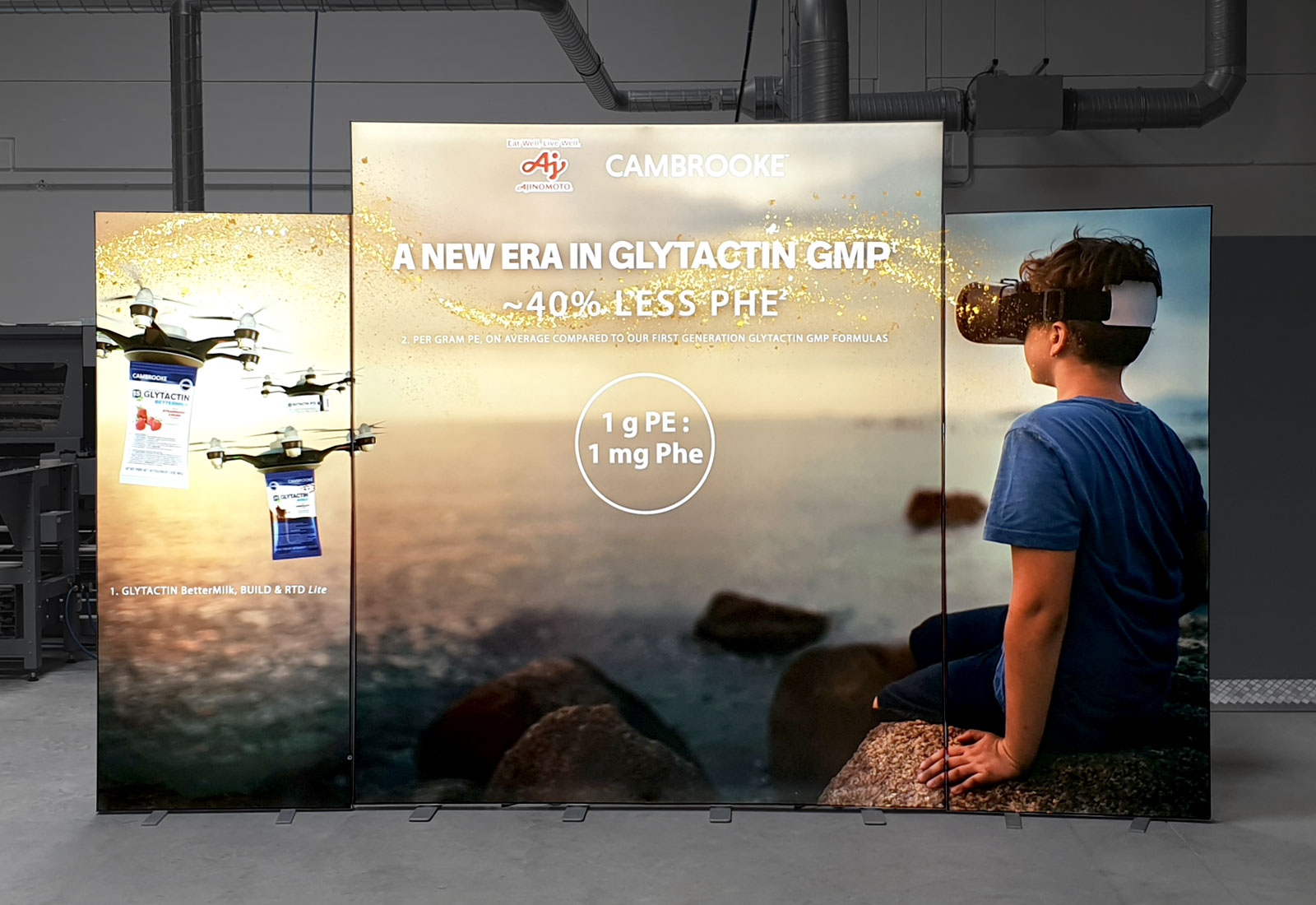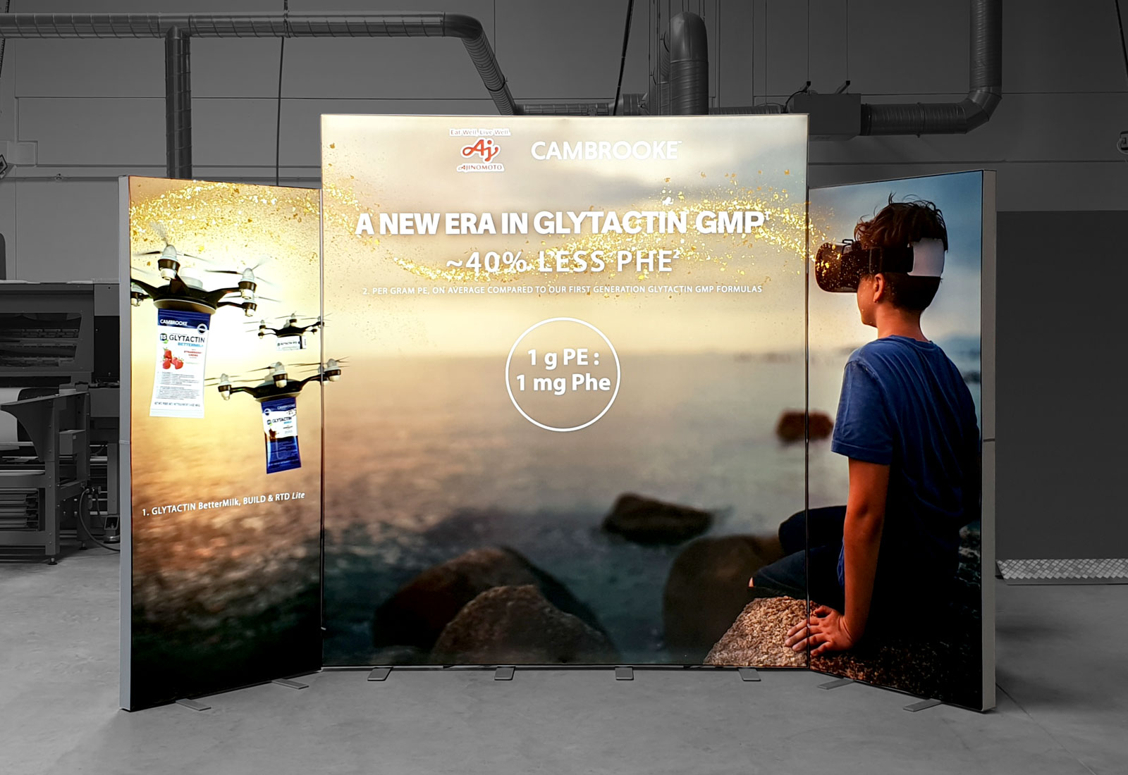 We offered and produced the large-format ALU LightUp light wall and two PIXLIP POPs for our customer "Cambrooke Therapeutics International LTD" for the upcoming trade fair. The ALU LightUp system is available in different widths and heights (up to 250 cm) and the PIXLIP POP in 85x200 cm. The customer thus achieved a memorable "light show" on the premises. The light walls are equipped with stable 8 cm wide aluminum profiles in which power LEDs are already installed. In this way, the foldable slide materials are illuminated "from all angles", as we can see very well here. Have we piqued your interest?