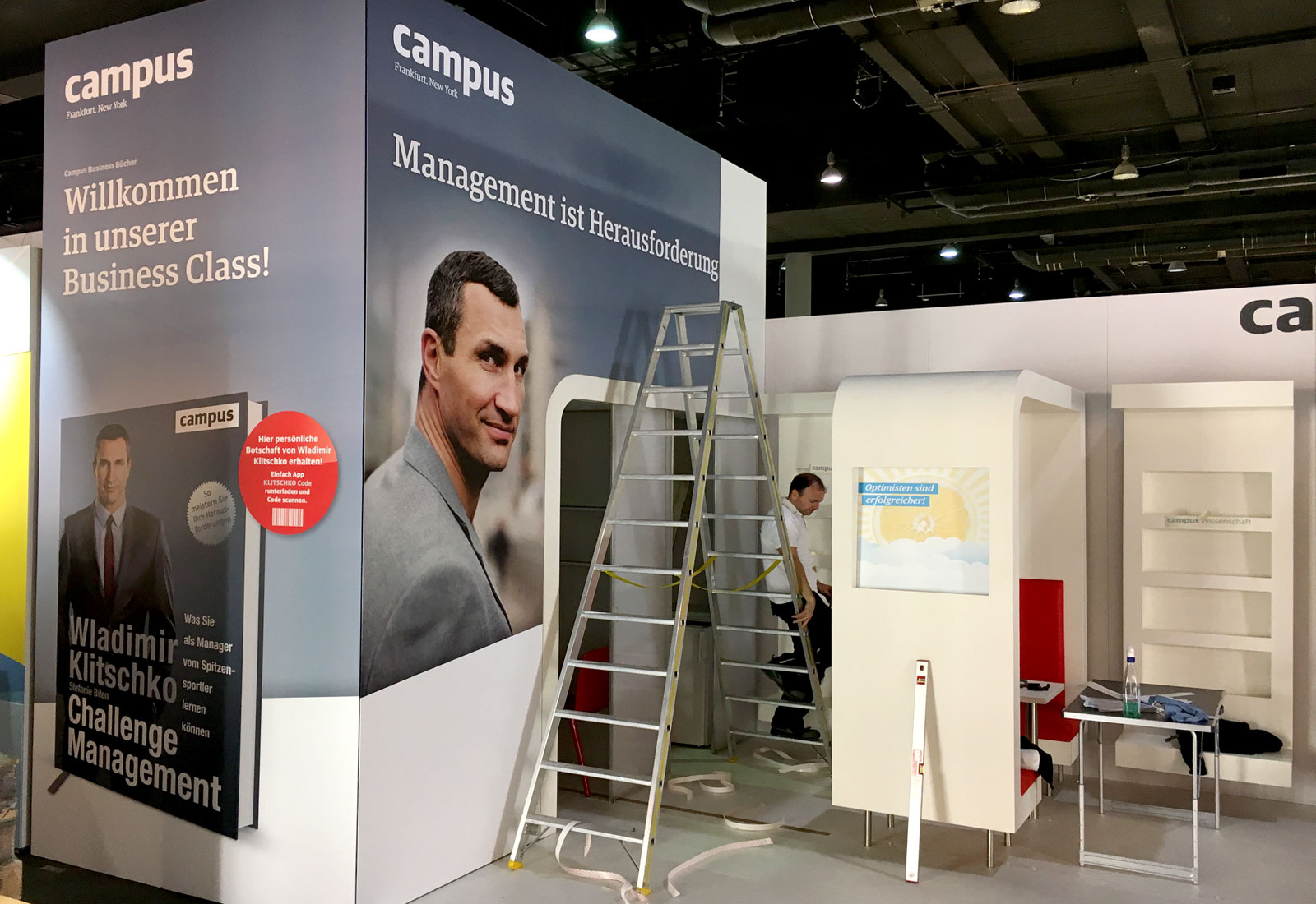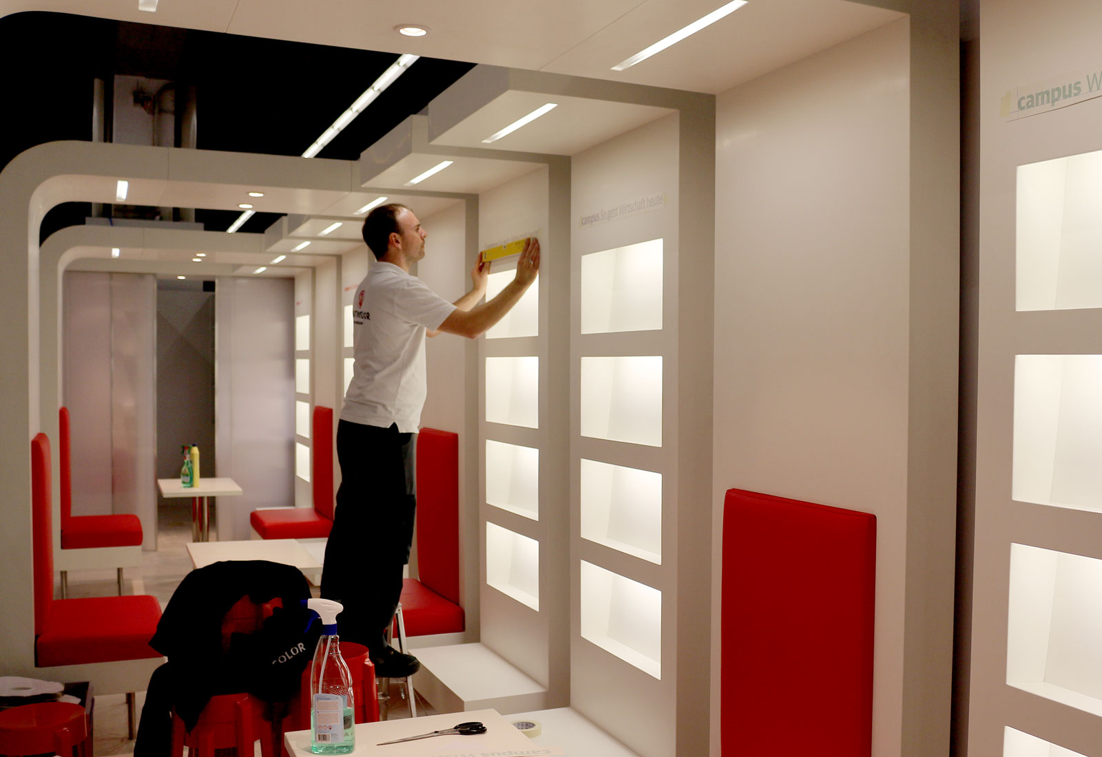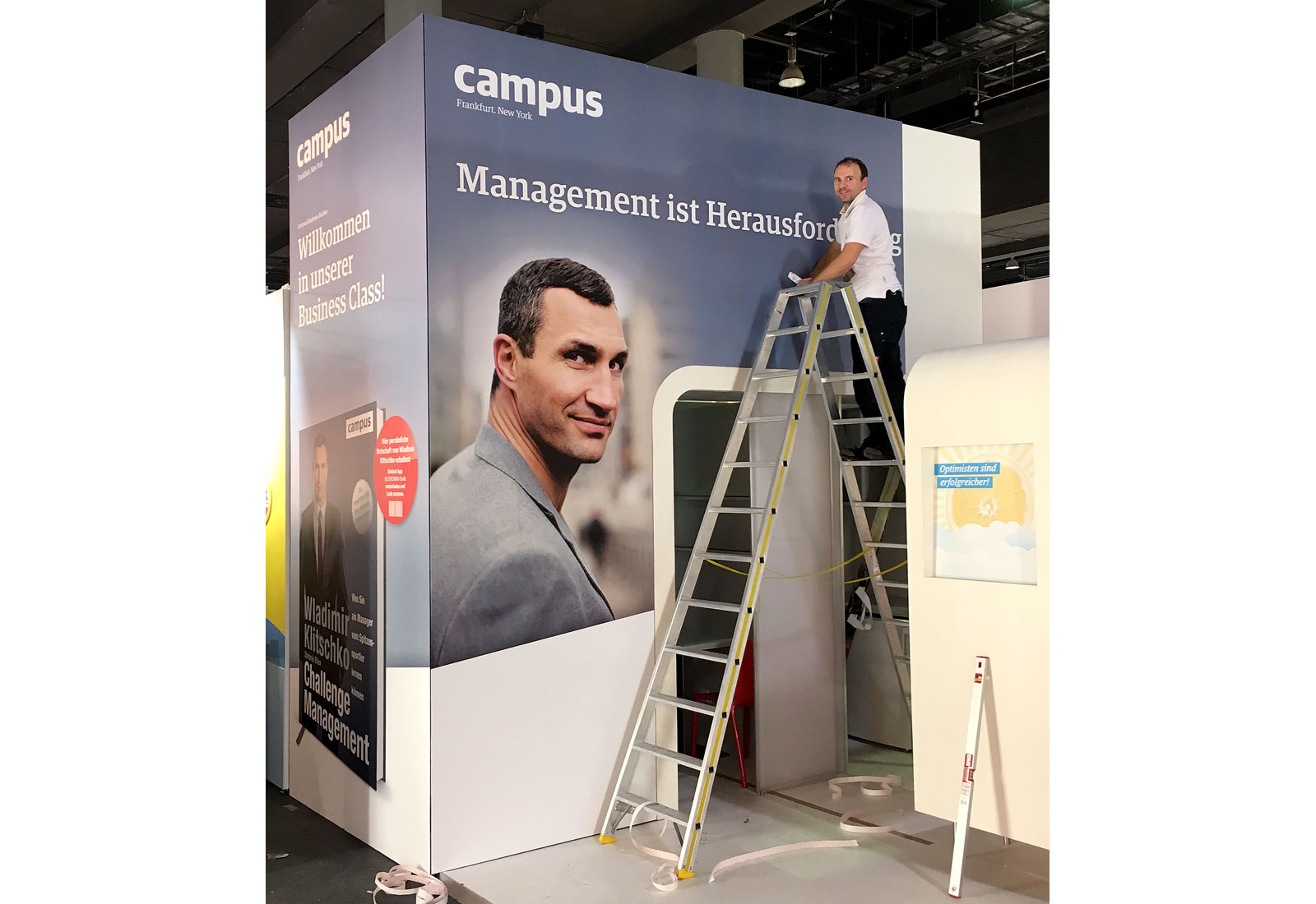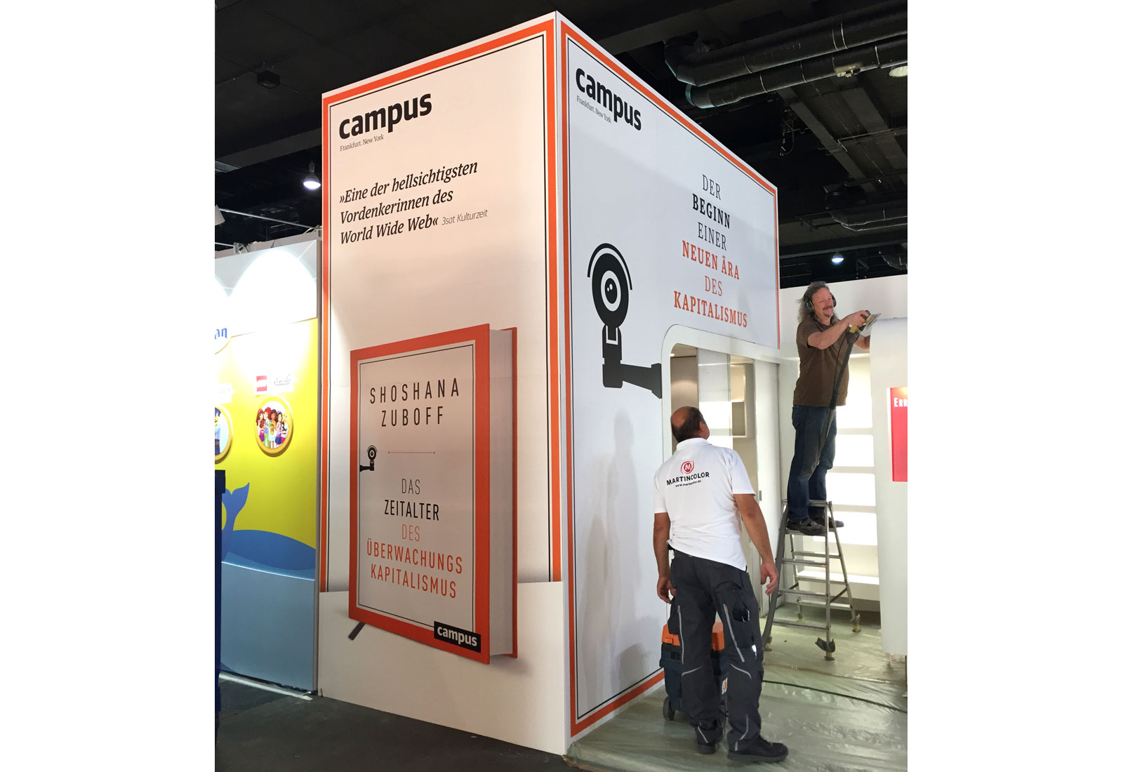 For the exhibition stand of the Campus Verlag at the Frankfurt Book Fair, MARTINCOLOR produced large-format large prints, which were glued on site at the exhibition stand. In addition to large-format motifs, numerous plotting books were also made. Adhesive, plotter or cutting markers are cut out of colored adhesive films, applied to transfer film and then applied to walls, windows, doors or similar. Straps applied. They are used as personalization of advertising or stand space, to label products or as a guide. More information is available here.
