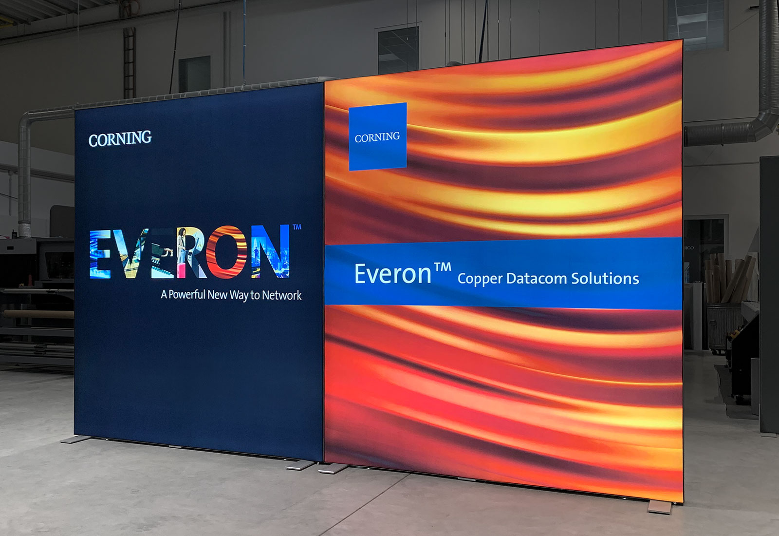 Here you can admire the illuminated walls ALU STAR. Our customer CORNING has opted for this LED exhibition wall innovation. With this size (2x 200 cm wide and 230 cm high) a great play of light is guaranteed. The walls are covered with different motifs on both sides and become an absolute luminous spectacle with the LEDs built into the profiles. The LED lighting systems can be placed end to end, individually or across a corner, just as you wish. Assembly and disassembly is practical and easy, just child's play! In addition, all components are neatly and carefully stowed in a robust transport case that fits in any car trunk.