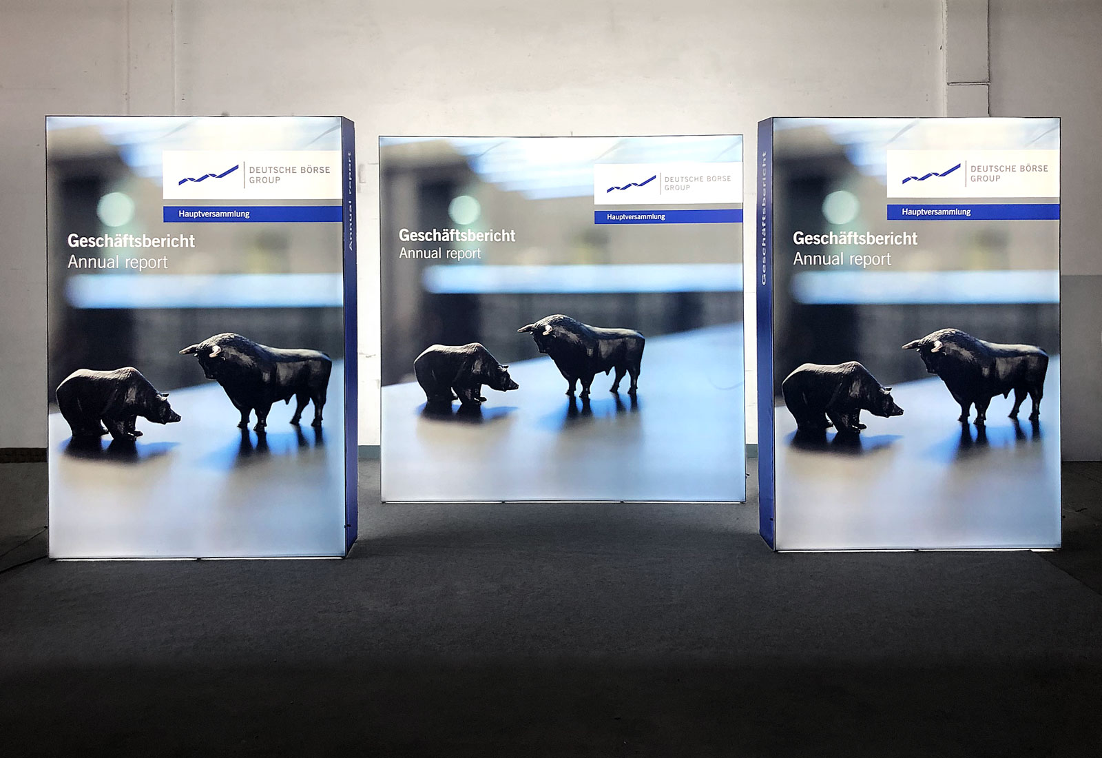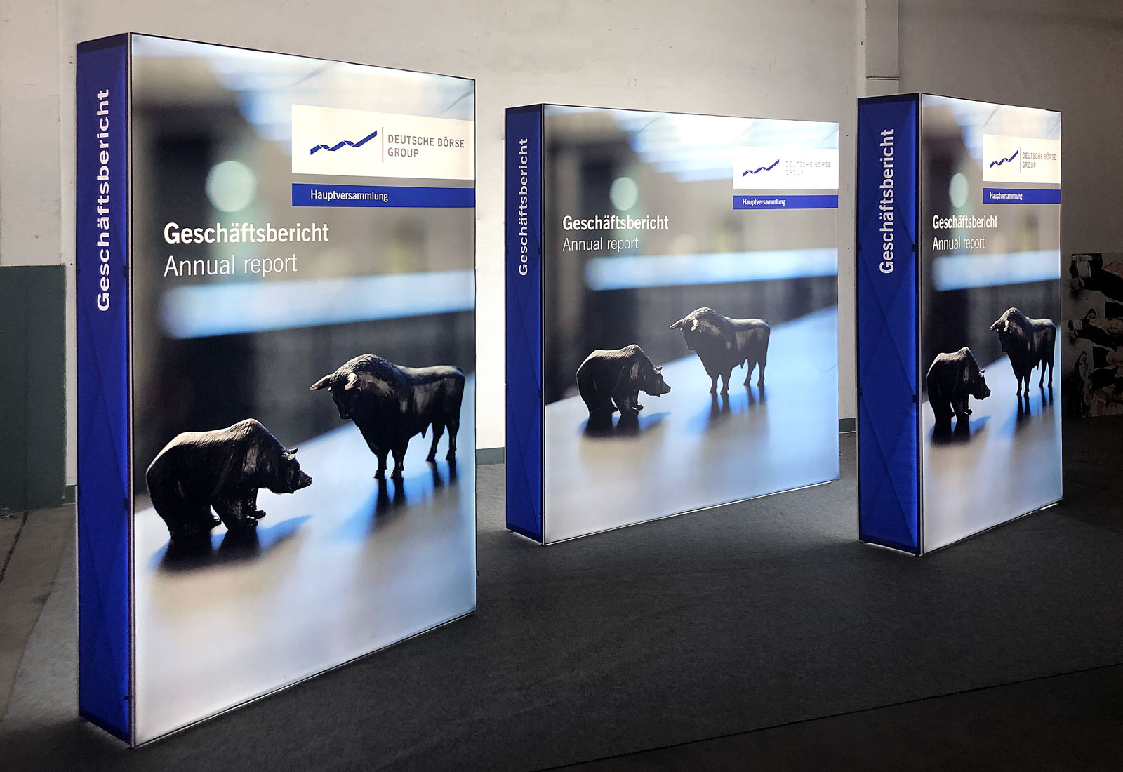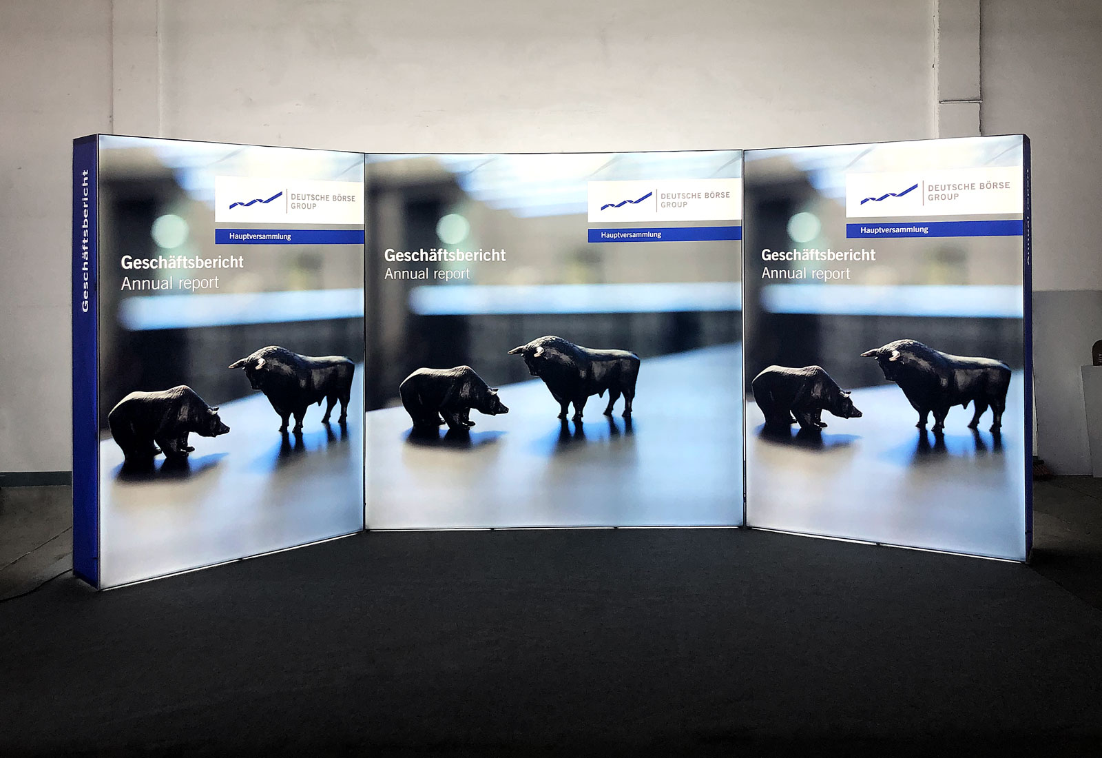 At the Annual General Meeting of the Deutsche Börse, a special highlight could be seen this year. The GRID Lightbox by MARTINCOLOR. The foldable LED luminaire wall can be strung around with large-format light slides and thereby also positioned in the center of the action. The illuminated side panels make the GRID Lightbox look more like a furnishing object than a trade fair wall. But of course, several GRID light walls can also be combined into a booth that attracts attention everywhere. The GRID Lightbox is transported folded in a practical transport trolley. A construction video of the GRID Lightbox you can see here.