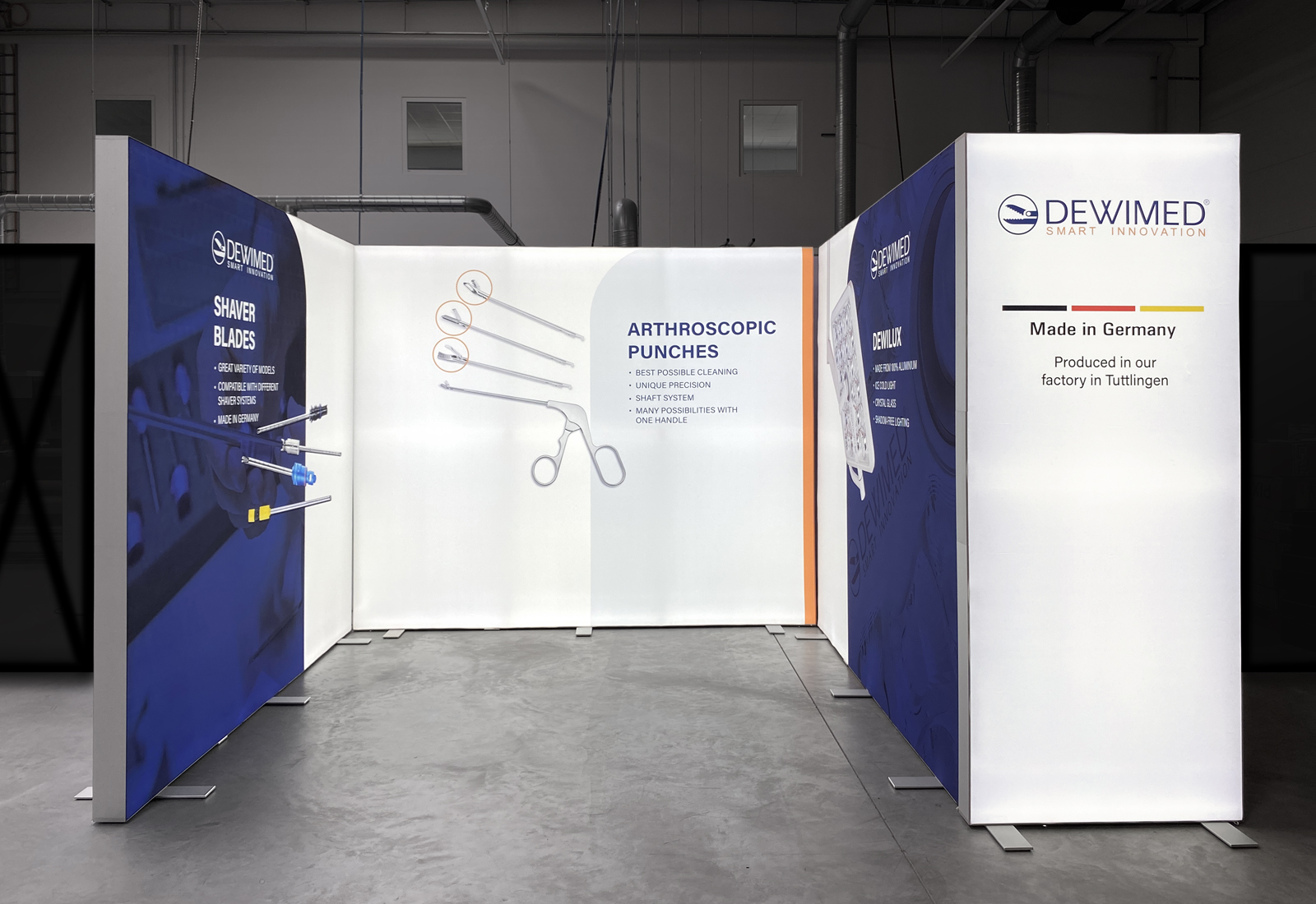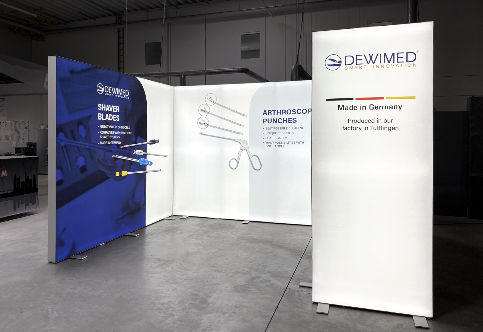 For its trade fair appearance, the Tuttlingen Dewimed Medizintechnik GmbH relies on our modular exhibition stand ALU STAR. ALU STAR is our bestselling LED exhibition stand, where illuminated walls of different sizes can be put together to form a complete exhibition stand. DEWIMED decided on three LED exhibition walls measuring 300x248 cm and one LED exhibition wall measuring 100x248 cm. All walls can be combined with each other to create new standing areas. For example, a 6 m wide, illuminated exhibition back wall can be constructed from two 3 m wide walls. Stable corner stands can also be installed using system-specific corner connectors. The ALU STAR family also offers a wide range of accessories that can be used to equip an LED exhibition stand. New are the flexible door modules that can be connected to any illuminated wall. Practical monitor holders are available for multimedia presentations.