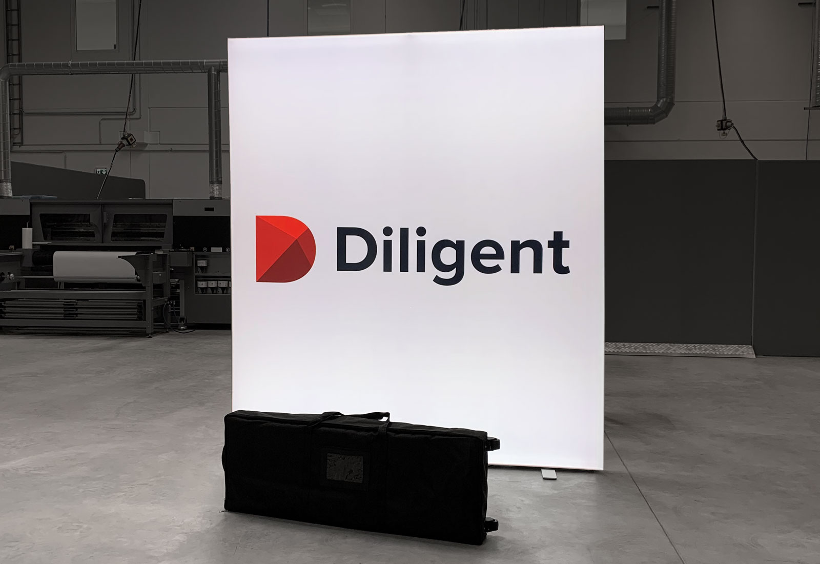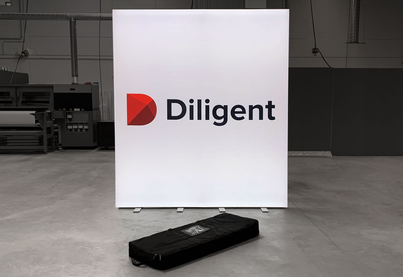 Simple and concise! Our customer "Diligent Boardbooks GmbH" places the company logo large and centered on the entire printable area of the ALU LightUp illuminated wall. The bright LEDs bring this out powerfully and radiantly. These are already pre-assembled in the 8 cm wide aluminum profiles. The slide covering can be easily inserted into the surrounding system groove and covered without creases. As you can see from the pictures, the entire LED lighting system with the printed textile material can be "shrunk" so that it fits into a robust, high-quality case. Nothing stands in the way of a handy transport.