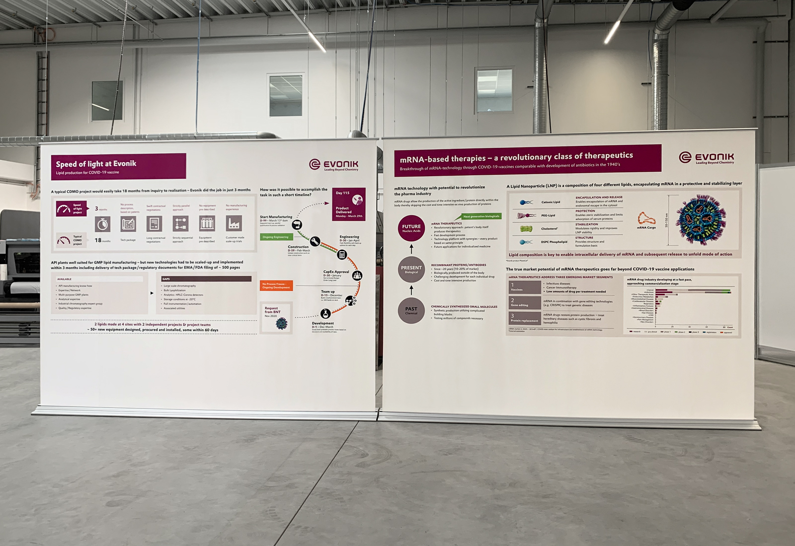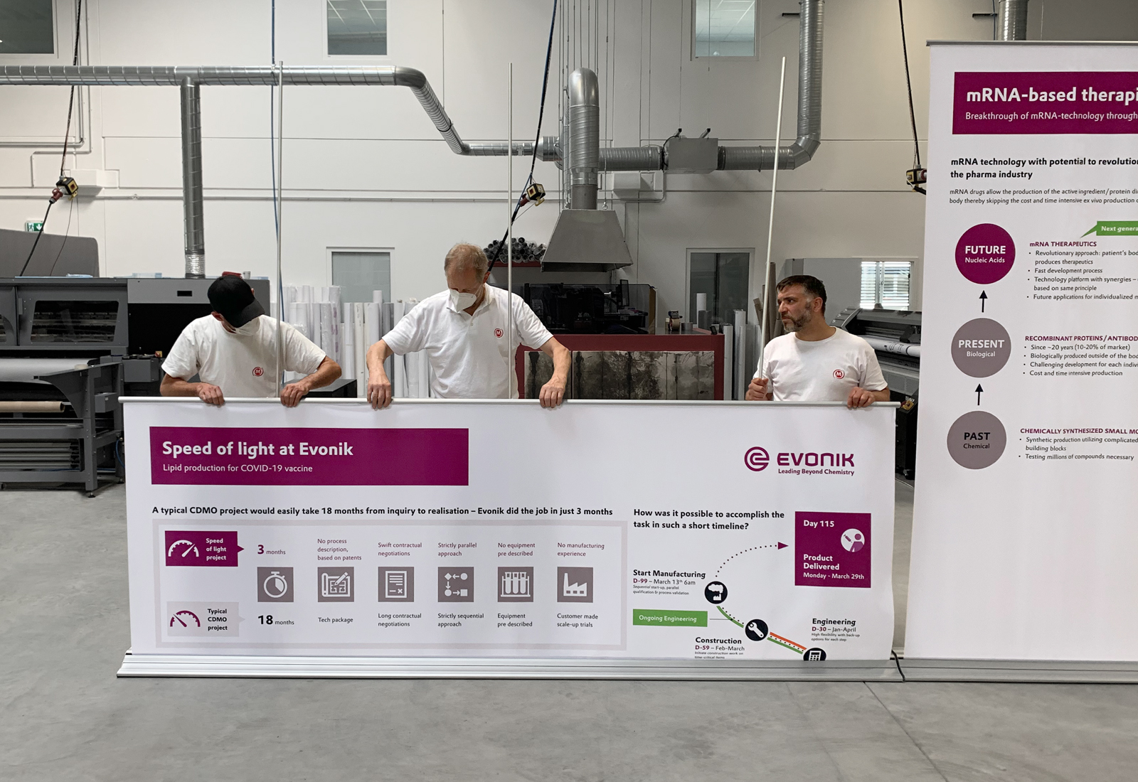 Our customer "Evonik" has opted for the high-quality display Mega RollUp. The impressive size sets the scene for the individually designed large print formats. Here we can clearly see that the maximum system width of 317 cm does not lose stability. This is ensured by 3 rods on the back. The graphic can be changed as required. This gives you the opportunity to update your appearance at any time. You can quickly set up the display by simply pulling up the bar. Side by side, staggered or at right angles - depending on space availability. The silver base is made of aluminum and gives the whole thing an elegant touch. Additional lighting from halogen spotlights can be mounted on the rear bars if required.