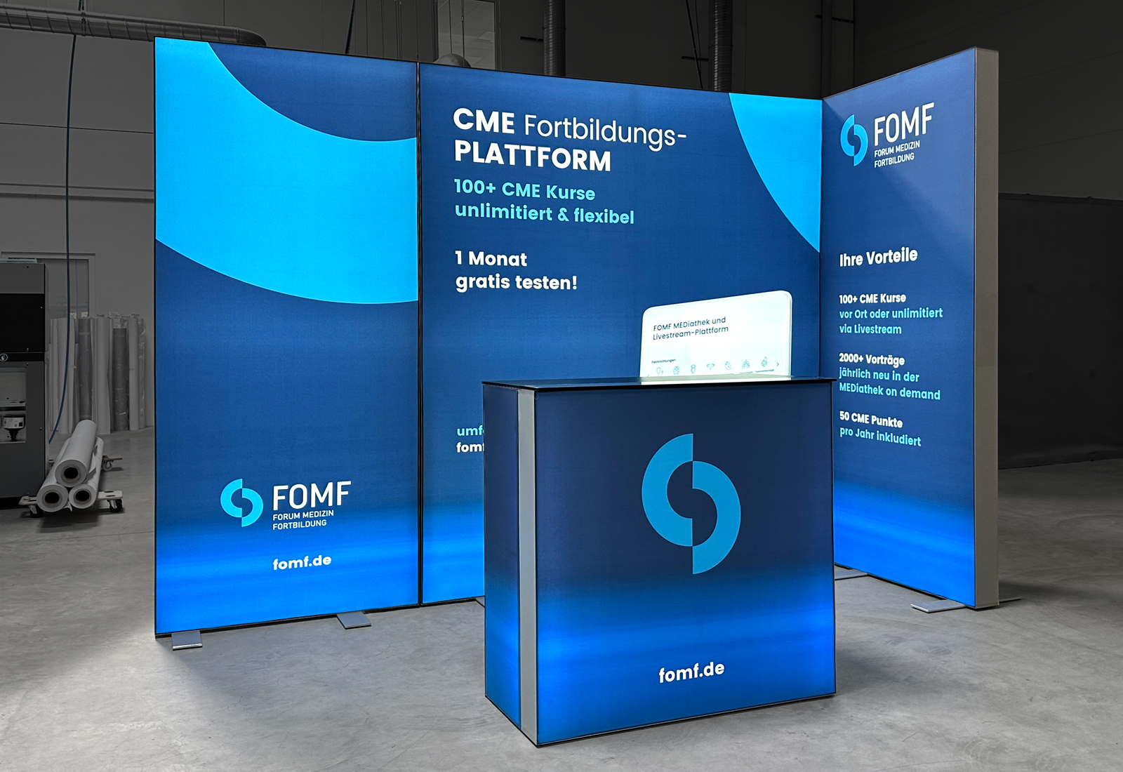 The ALU STAR illuminated wall is the absolute eye-catcher on the fairground. The high-quality aluminium frames are available in various sizes and can be set up in different ways depending on your preference. Either side by side, as a corner or offset. Just as the space in the room allows. Individual textile graphics can easily be inserted into the circumferential system groove of the aluminium profiles, even on both sides. Everything can be set up and taken down quickly and easily. Another eye-catcher is the ALU STAR LED illuminated counter, which likes to be shown in the foreground. This can also be covered on both sides with textile slides. The complete exhibition system fits into practical high-quality cases or bags and is easy and convenient to transport.