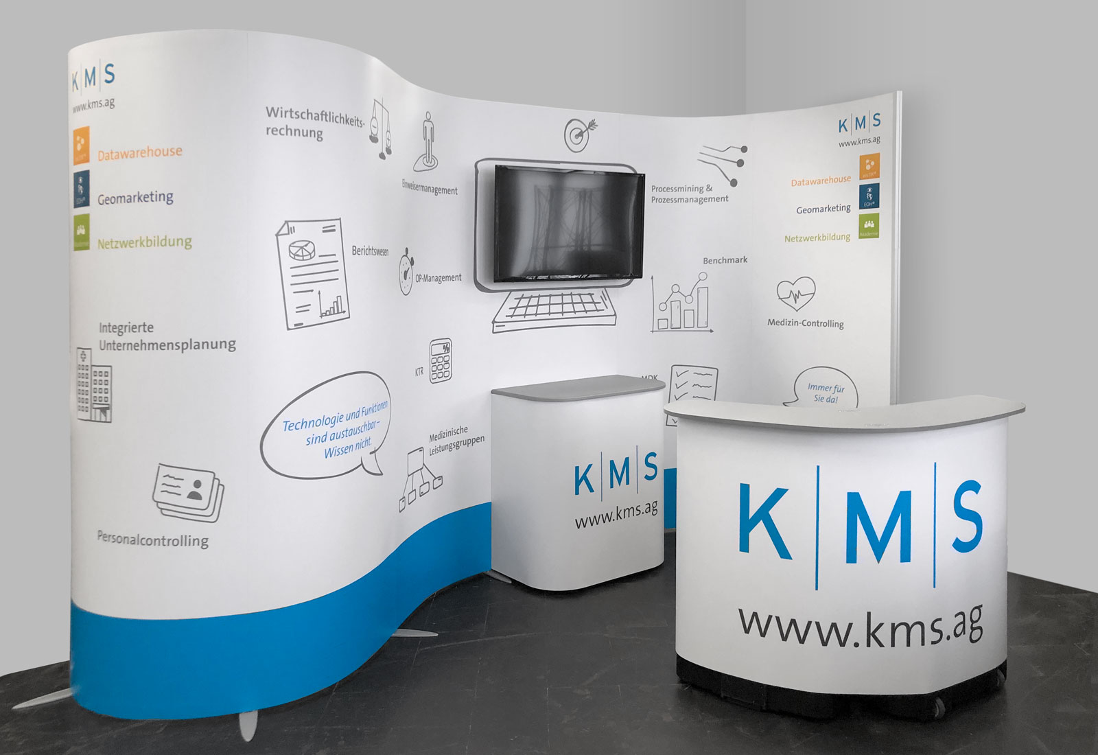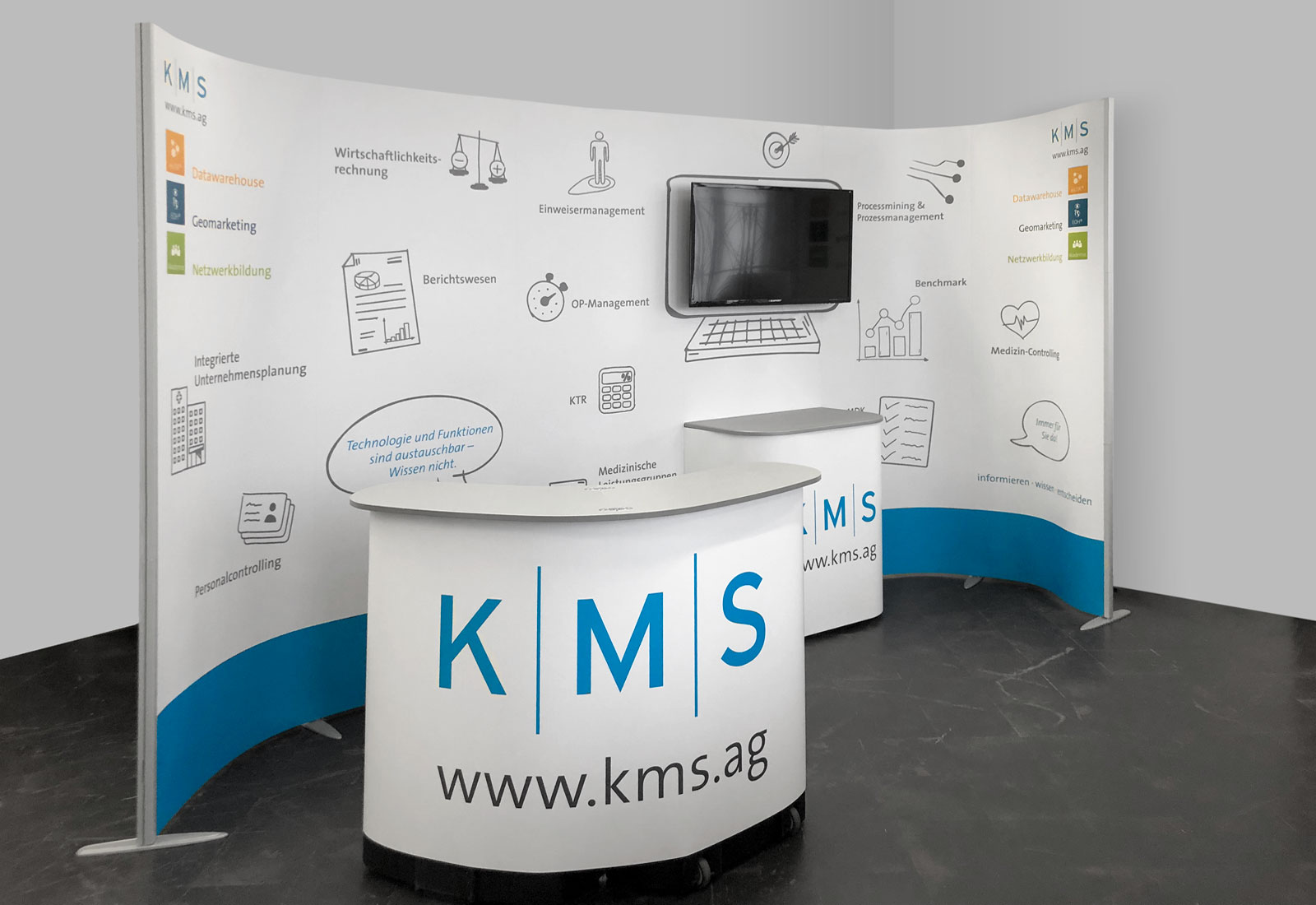 The exhibition system ISOframe Wave is the perfect exhibition stand if you would like to exhibit at different sized trade fairs and adapt your stand to the respective conditions. ISOframe Wave offers all the advantages you can imagine: 1. Thanks to the patented Flexi-Link, ISOframe Wave can be bent flexibly into any shape. So you do not have to decide in advance whether you need a straight, wavy or curved exhibition wall. 2. ISOframe Wave consists of 80 cm wide single tracks, which create a wall when put together. By adding or omitting single lanes, the system can be individually scaled up or down. 3. ISOframe Wave has many accessories such as shelf, display case, monitor support, truss, bridge and counter modules to which the exhibition system can be extended. Of the many advantages, our customer KMS was thrilled. We will gladly prepare a 3D visualization of your individual ISOframe Wave concept in advance. Find out at +49 (0) 69 756080-84.