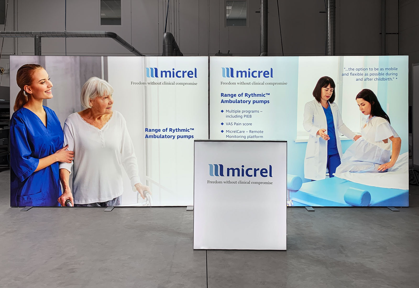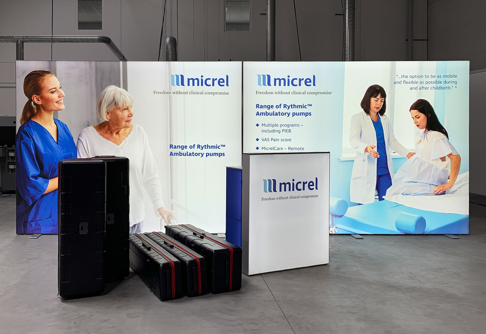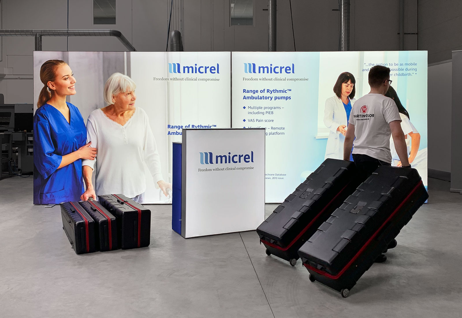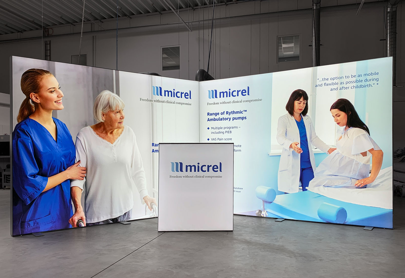 Our customer "Micrel Medical Devices" achieved a great effect with the combination of the LED exhibition stand ALU STAR with the ALU STAR MAX LED counter! Large-area and evenly illuminated, the advertising message printed on a textile diabescence is shown to advantage on a grand scale at the event or function. This is ensured by the highly luminous LEDs that are already integrated in the 12 cm wide aluminum profiles. The high-quality ALU STAR MAX LED counter, equipped with a particularly large front surface, appears as an elegant additional element on the exhibition stand. Everything can be perfectly stored and locked if desired, with the lockable door set. Not to forget the quite convenient transport possibility of the complete exhibition stand in a practical and durable trolley. Would you like to receive more information about this LED exhibition system? Then call us at +49 (0) 69 756080-27.