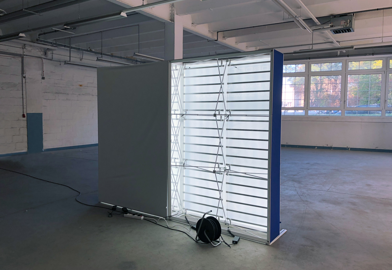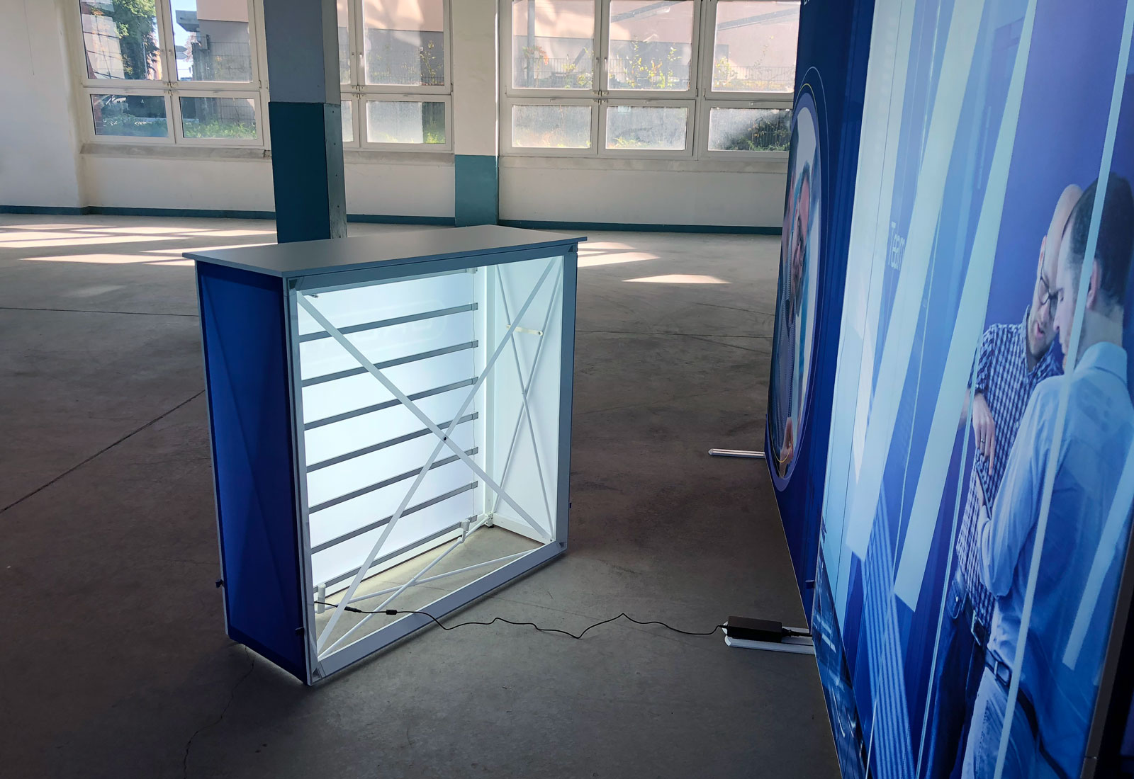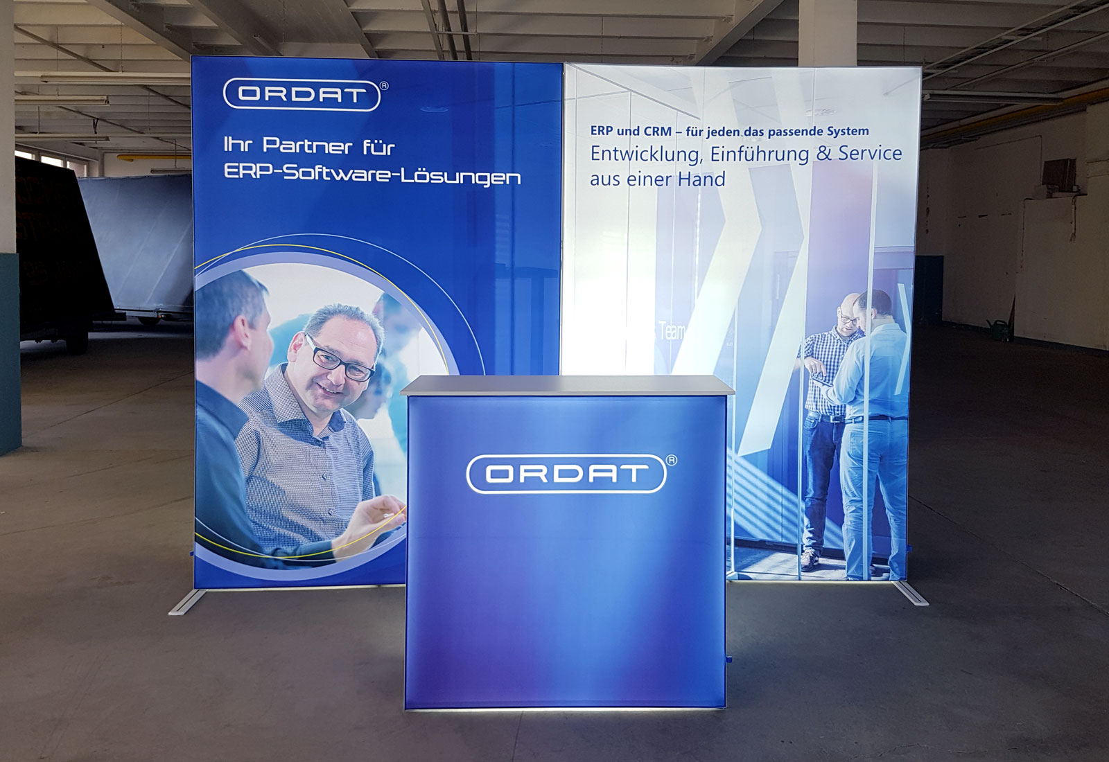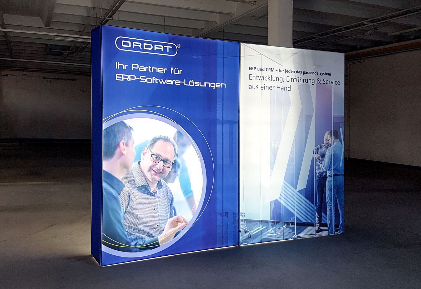 MARTINCOLOR produced a modular and luminous exhibition stand for ORDAT GmbH & Co. KG. Here was the requirement to create a small exhibition stand, which can be used as a small, 1.5 m wide light wall or as a 3 m wide light wall. The foldable GRID Lightbox is available in 5 different wall formats so that walls of different sizes can be combined. With special adapters you can connect the light walls "over corner" or straight with each other. A clever combination to the light wall is the luminous GRID counter. Like the GRID lightbox, the basic structure is a folding scissor lattice that can be "populated up" in a matter of seconds. On the reverse, the clamped graphics print is illuminated by a powerful LED curtain. The counter top of the GRID illuminated counter is available in silver and white.