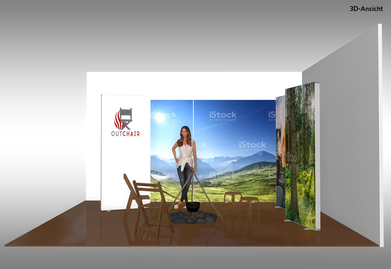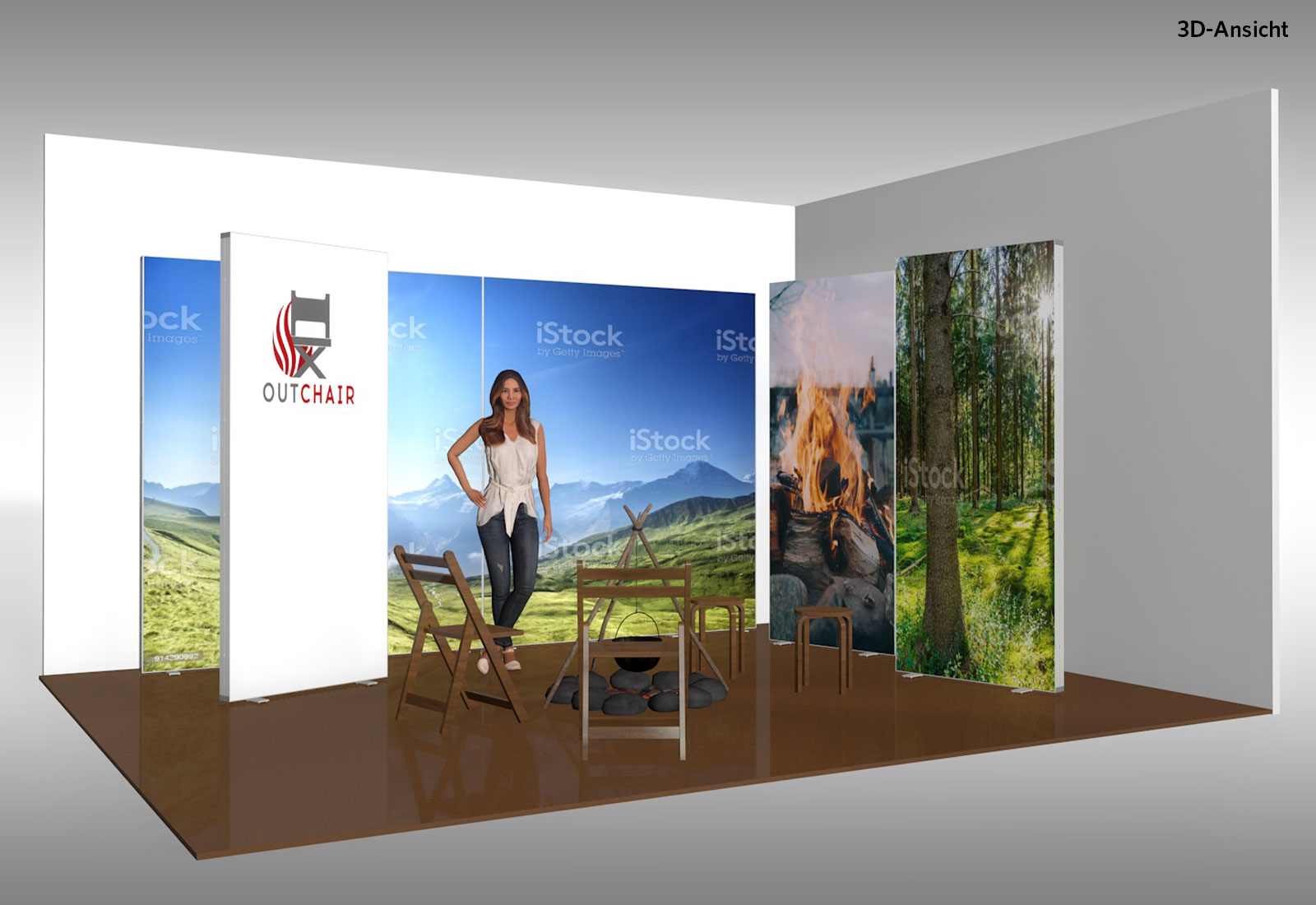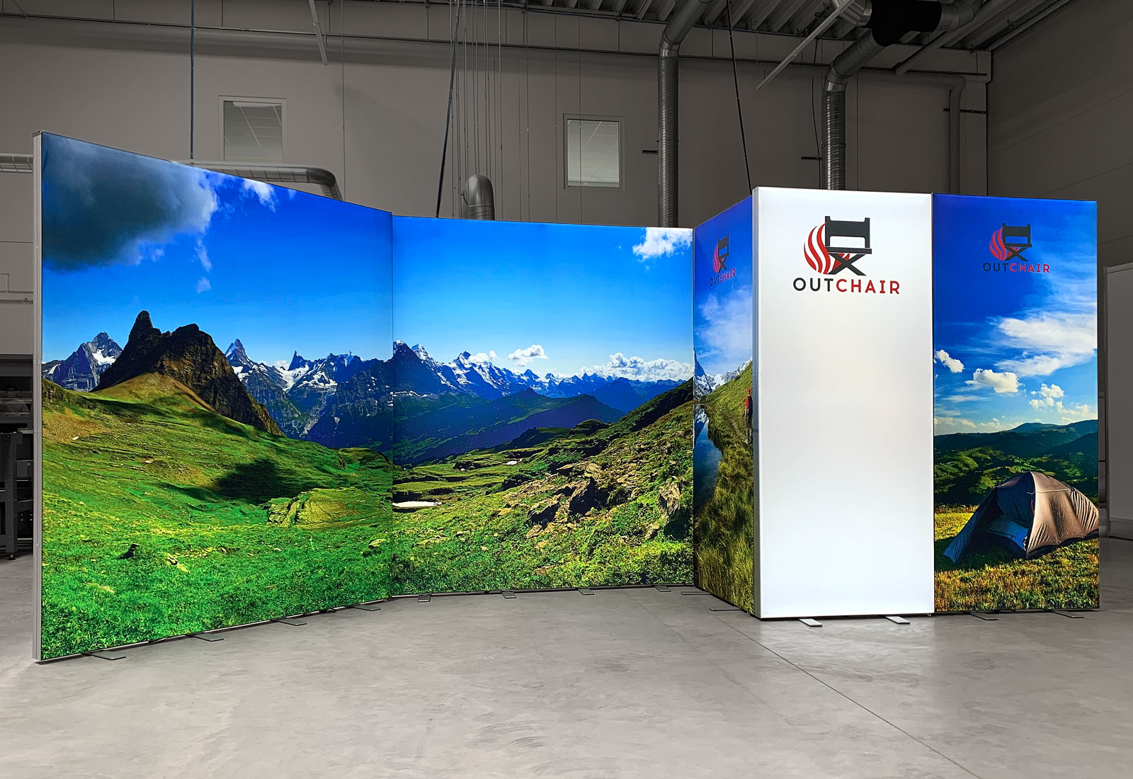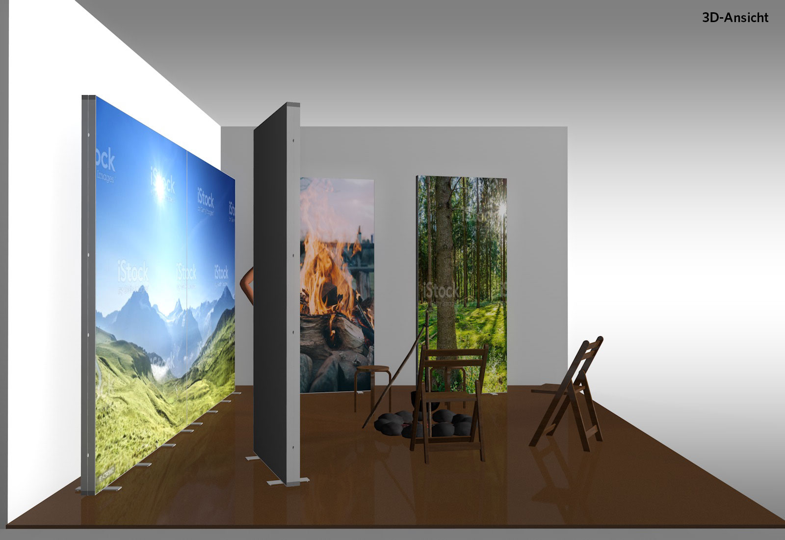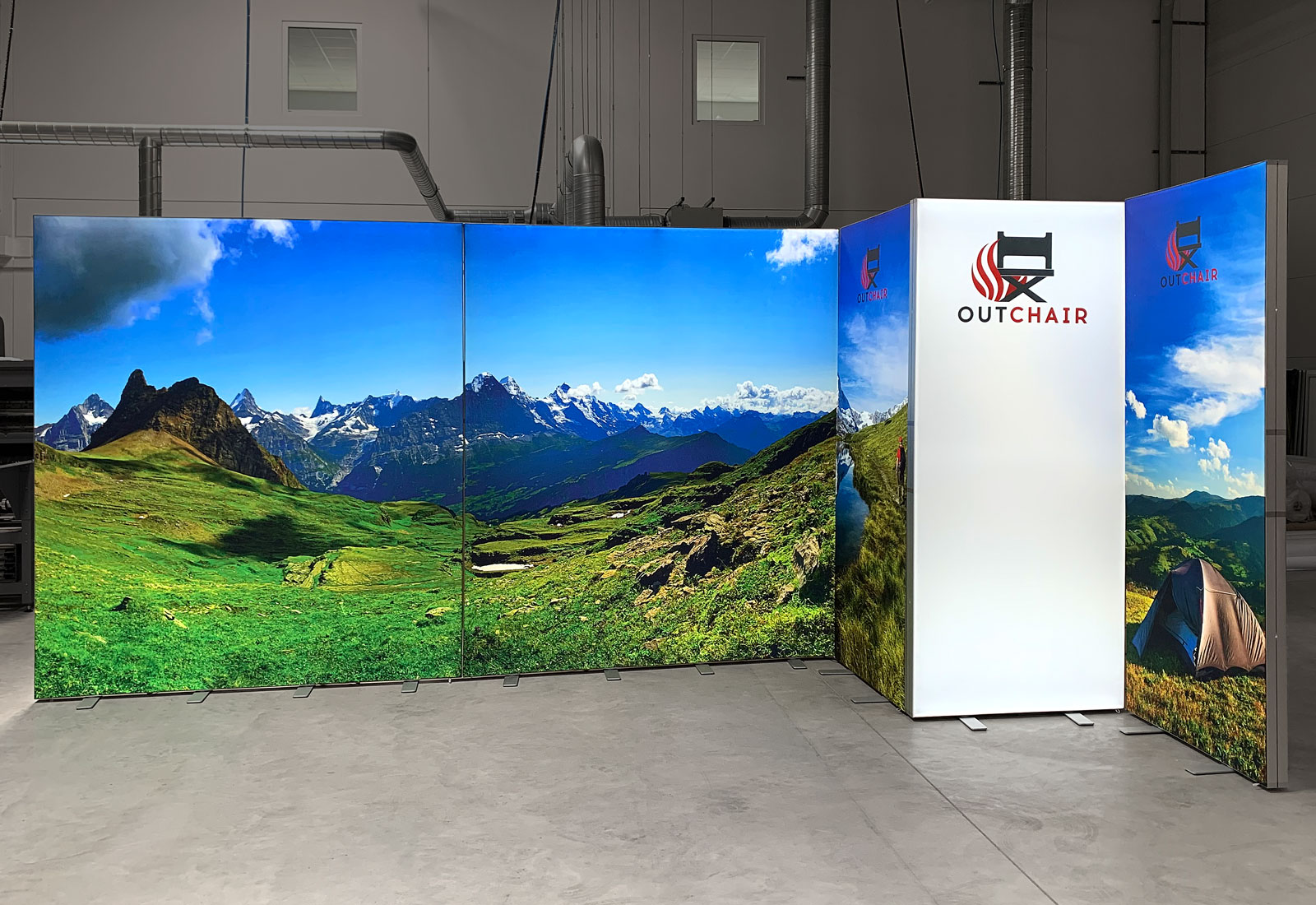 To make the nature experience highly tangible, our customer "Outchair GmbH" has chosen our attractive illuminated walls ALU LightUp. This is the LED exhibition stand with the best price-performance ratio! The LED trade fair walls, which are placed next to each other in different widths, also around the corner, create a natural oasis for the trade fair visitors. The covering of the light frame modules was printed on textile diamond material. The individually designed motifs are uniformly illuminated by the LEDs located in the aluminum frame profiles. One immediately gets the feeling of being in the middle of nature. A true play of light! This mobile and cost-effective LED exhibition wall made of aluminum is ideal for self-assemblers. It can be set up quickly and without the use of any tools. In addition, everything can be wonderfully stored and transported in a practical transport trolley. Contact us if you have acquired a taste for it.