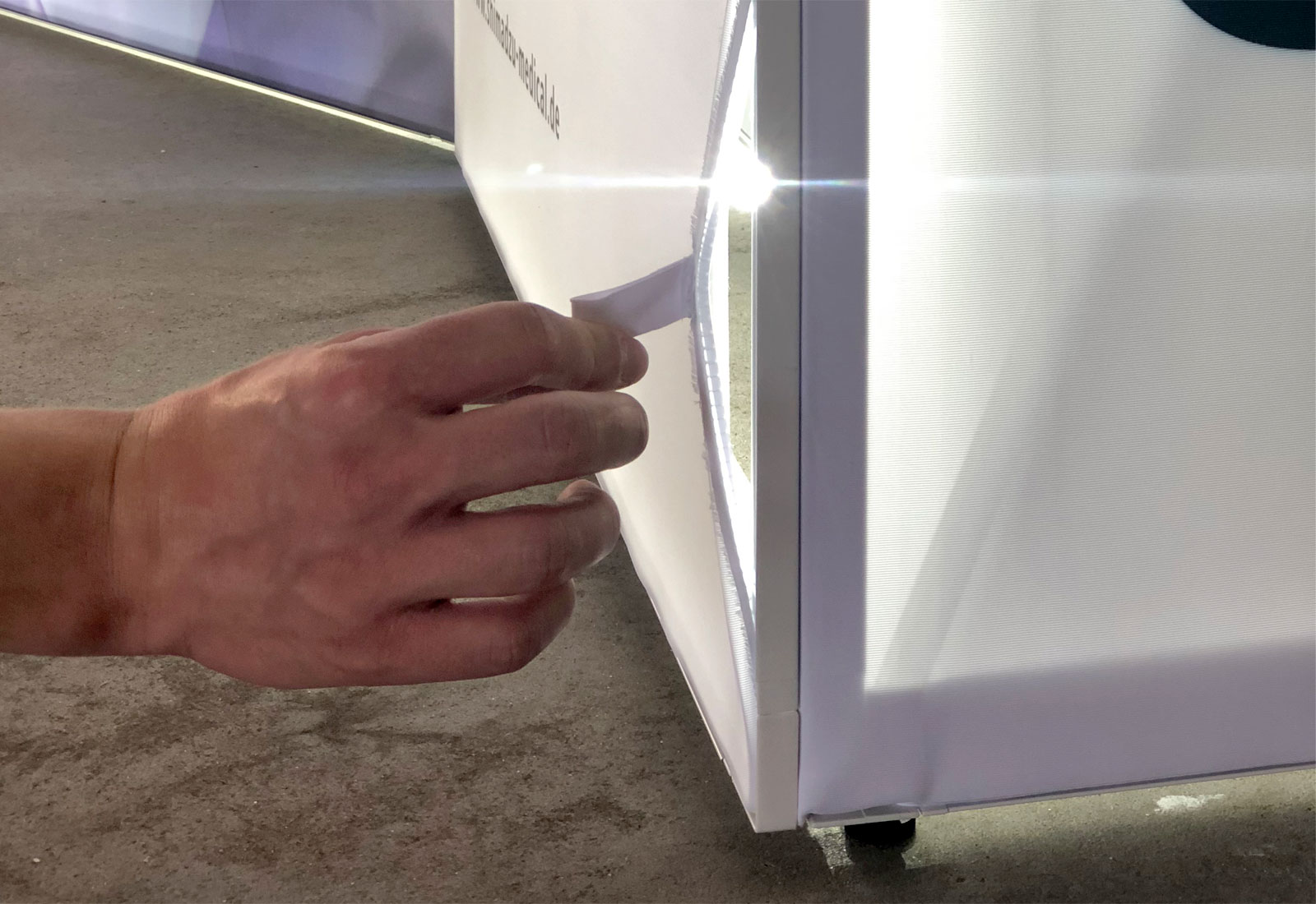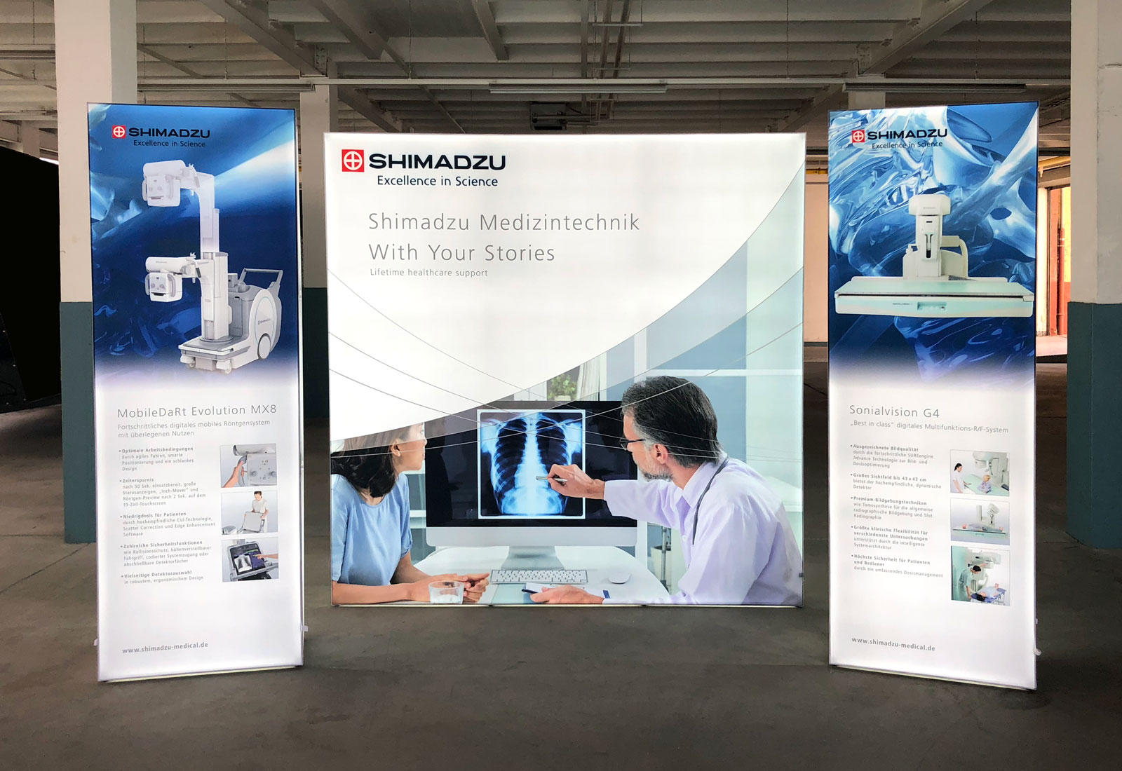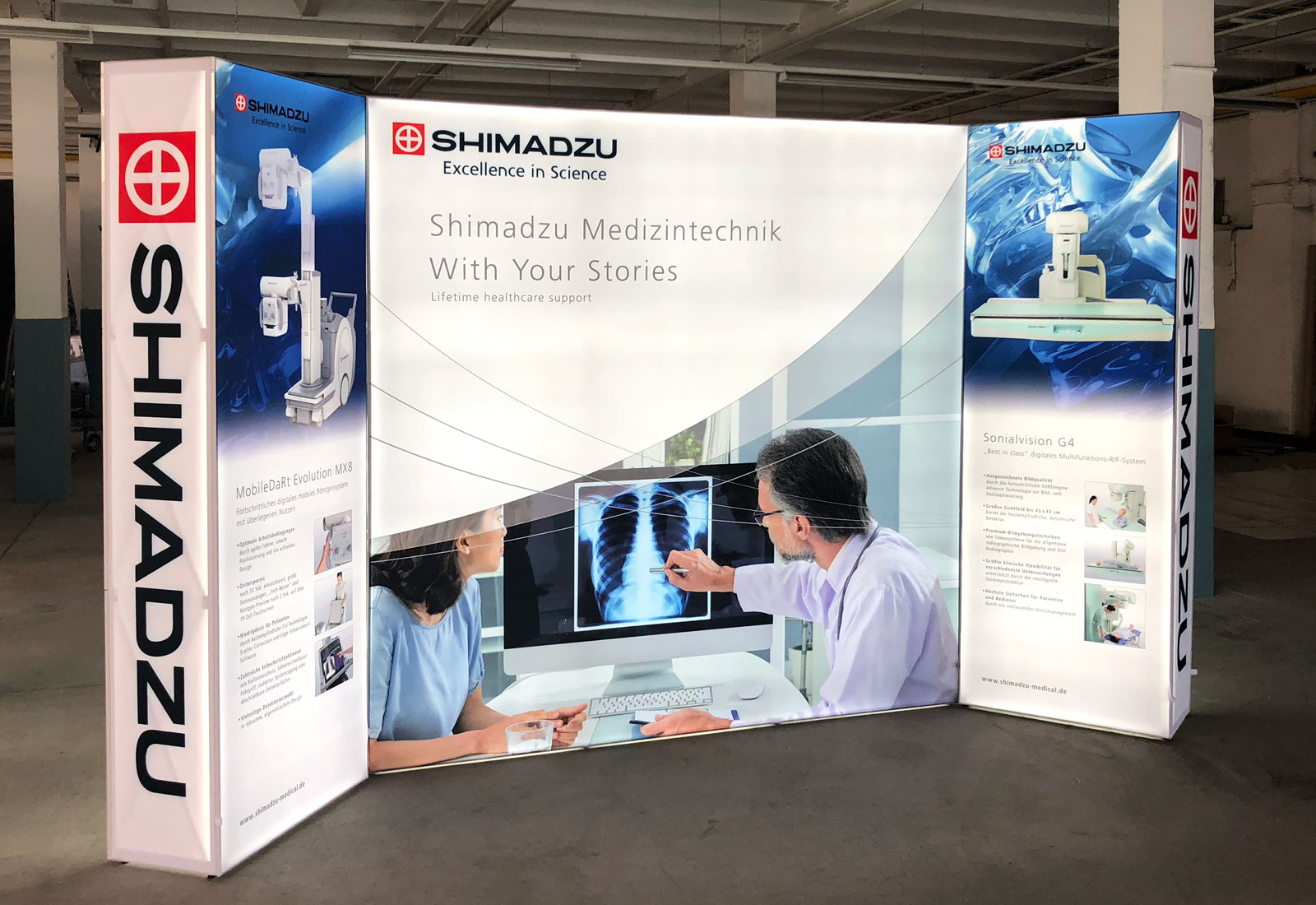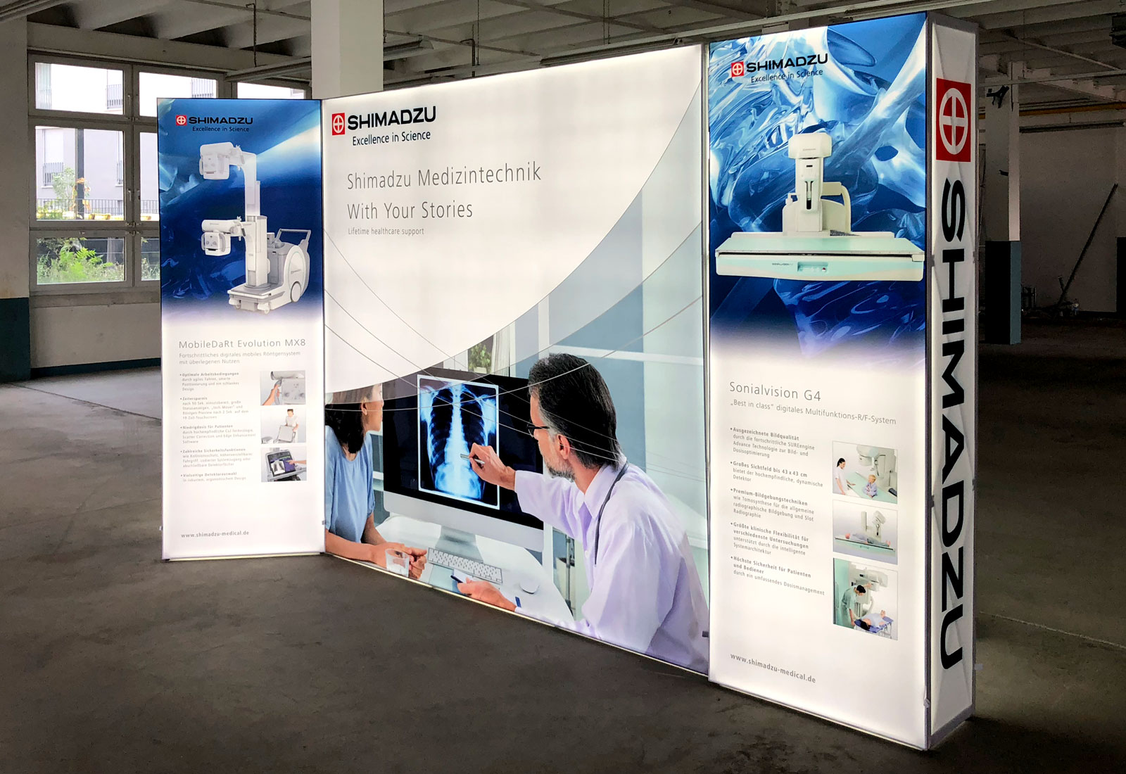 For the Duisburg medical technology company Shimadzu, MARTINCOLOR produced a mobile illuminated exhibition stand. Shimadzu chose one of the most innovative trade fair systems in our product range - the GRID Lightbox. All exhibition stands from the GRID product family are foldable and can be transported in rollable transport trolleys. The special feature of the GRID Lightbox is the combination of a foldable basic frame with rollable LED curtains, which are hooked into the system from the back and radiate through the exhibition wall system with light. For Shimadzu, three interconnected exhibition walls were produced. This Shimadzu is variable in the structure of his booth. The GRID Lightbox walls can be used to build a U- or L-shaped exhibition stand or a large rear wall - individually adapted to the respective stand surface.