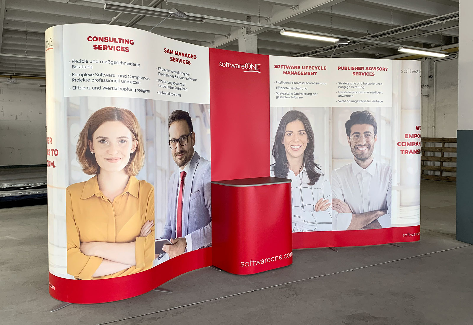 Our most flexible exhibition system is the ISOframe Wave back wall - because it can be bent in any direction and shape! Thanks to its modular design, ISOframe Wave can also be used in different sizes, depending on the space at the place of use. So you can only build ISOframe Wave with 2 graphic path modules or with 4, 5 or many other modules. A wide range of accessories is available for the ISOframe Wave exhibition wall, such as a monitor module, various counter, showcase and shelf modules. Due to its flexible construction, ISOframe Wave can also be used as a variable back wall for video conferences and the like. Use online meetings via Zoom, Skype or Teams. For more information, please contact us at any time on +49 (0) 69 756080-84.