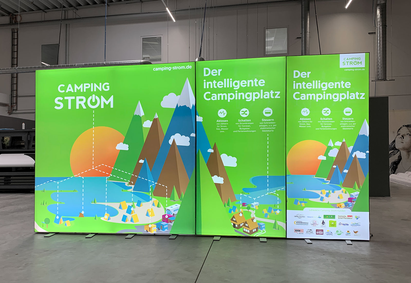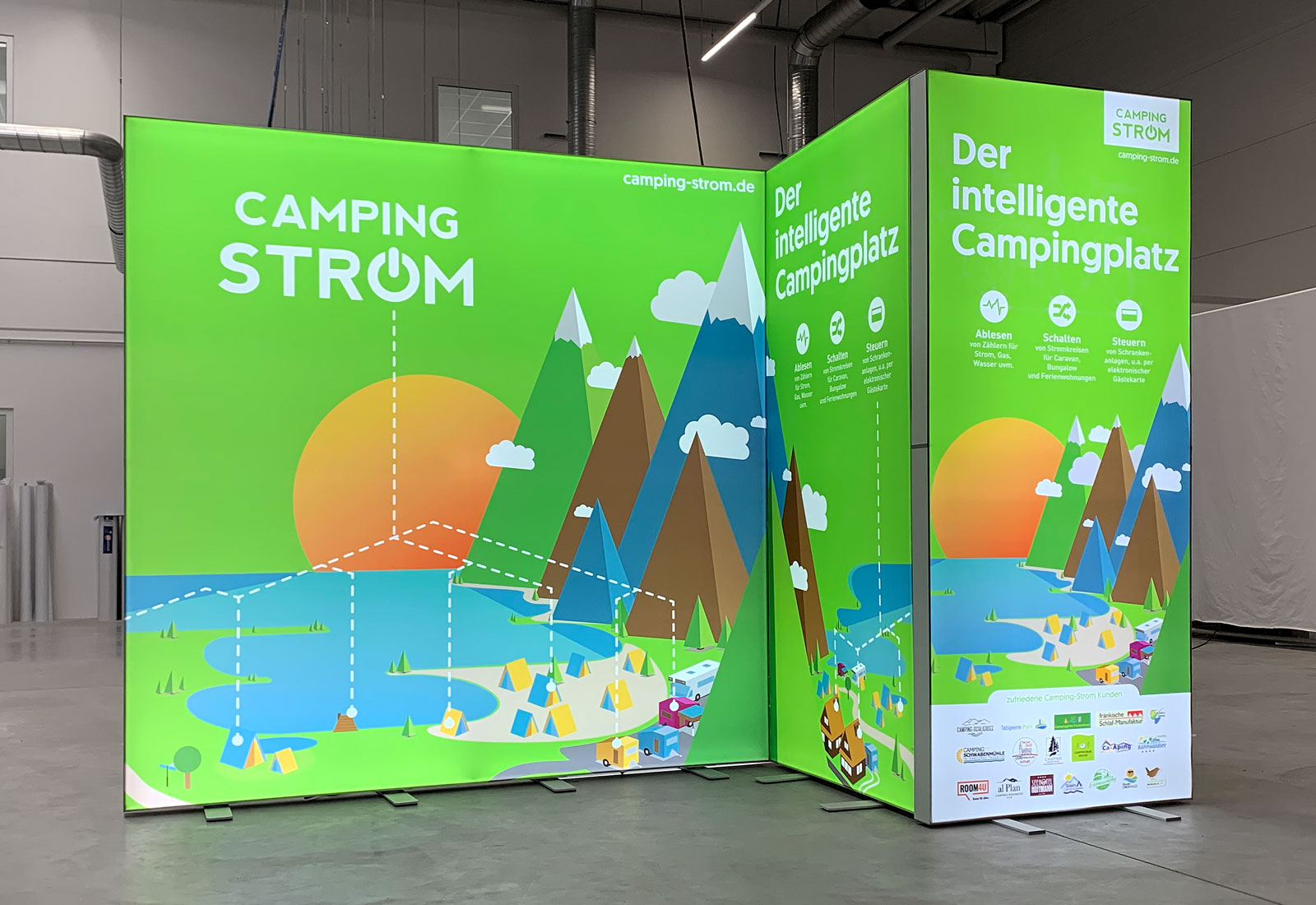 For our customer TREFON electronic GmbH it was especially important to use a mobile LED exhibition stand that can be transported in a car. With our LED exhibition wall system ALU LightUp this is possible. The booth shown here, for the TREFON product CAMPING STROM, fits into a normal car!