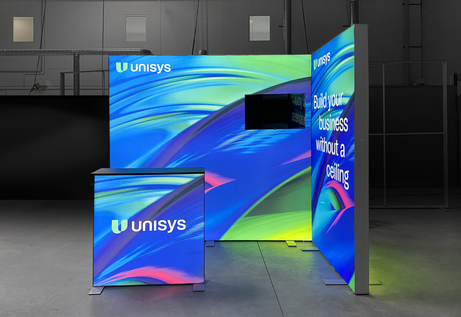 For the customer "Unisys Deutschland GmbH" we produced large-format ALU STAR illuminated walls in two different sizes. The LED illuminated systems, made of fine aluminium, were equipped with a colorful slide cover on the front and back. This resulted in an impressive color scheme, a real eye-catcher on the entire exhibition grounds. The easily adjustable illuminated systems can be set up in a flash, without any tools! The pre-assembled, bright power LEDs are located in the 12 cm wide profiles. The various positioning options for the LED walls (as a corner, at any angle, next to each other, offset, etc.) create an optimal interior design. The whole thing was upgraded with an elegant ALU STAR LED counter that also lights up on both sides.