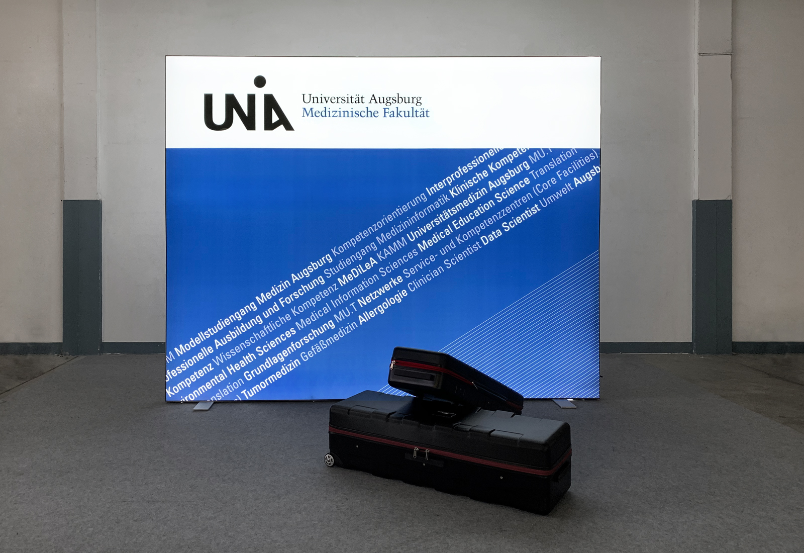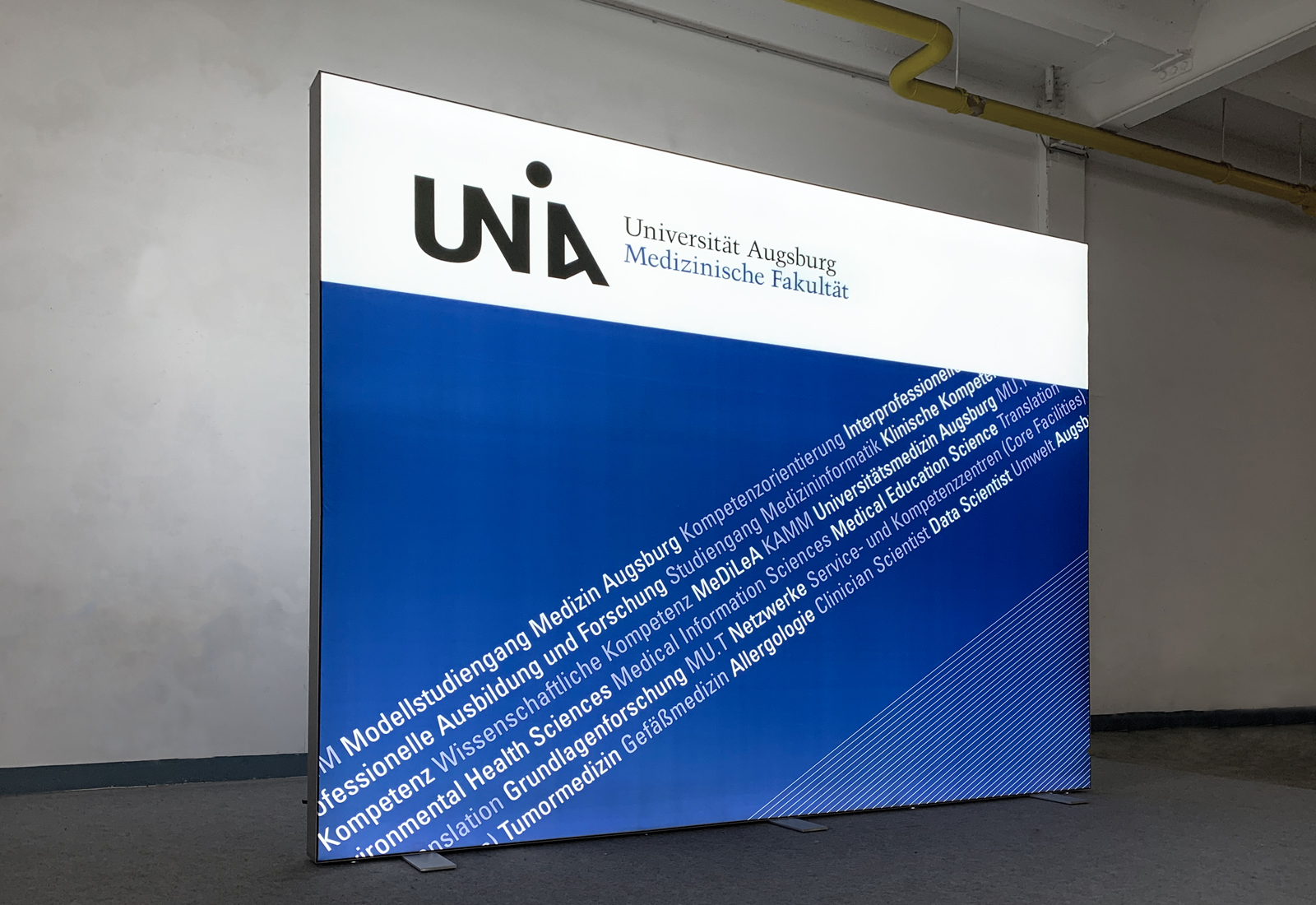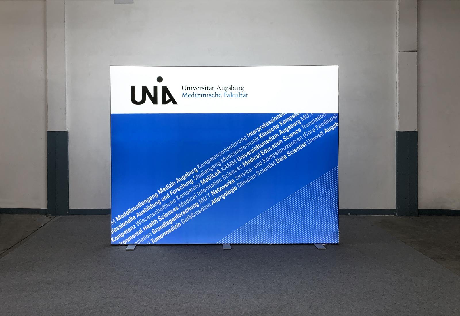 For the Universität Augsburg we produced a large-format, 3 m wide ALU STAR luminous wall. This high-quality LED exhibition wall is particularly stable and is elaborately manufactured. This is particularly noticeable in the construction of the trade fair system. The 12 cm wide aluminum profiles are pushed into each other with an exact fit and, provided with corner brackets, create the frame for the luminaire wall. The high-brightness LEDs are already assembled in the profile and only need to be supplied with power. Subsequently, the entire light wall is covered with a one-piece, large-format Textildia. This can be reprinted over and over again, so that the luminous wall can always be recorded with current topics. Of course, ALU STAR light walls can not only be used at a trade fair. They can also be perfectly positioned as eyecatchers in the reception area - as used by the University of Augsburg. More information about the ALU STAR illuminated wall can be found here.