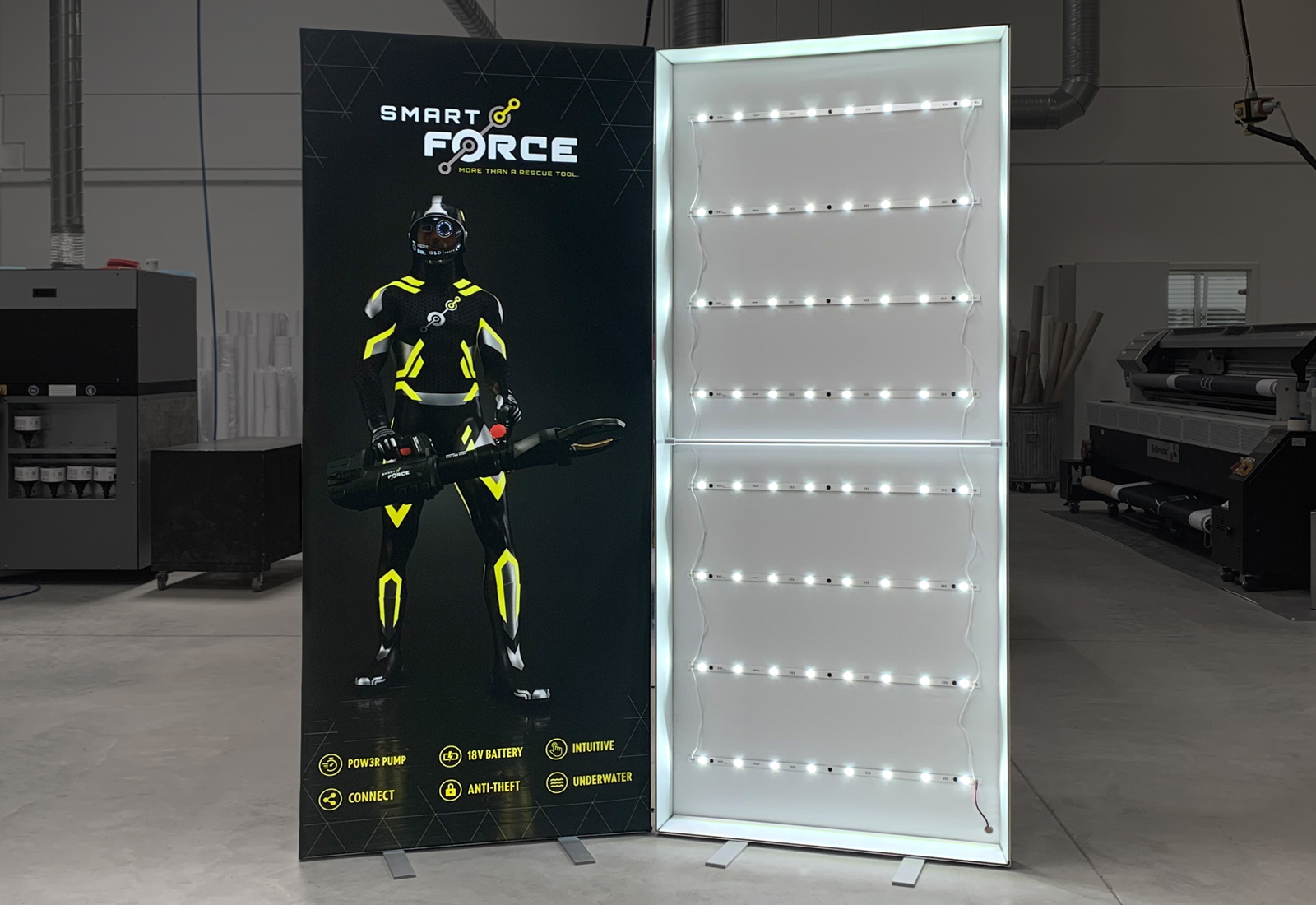 As you can see in the photo, the company "WEBER-HYDRAULIK GMBH" decided to use the PIXLIP POP LED system as an advertising banner. The illuminated frame is very easy to assemble without the need for tools, by plugging the 8 cm deep aluminum profiles together. The individually designed textile print is stretched directly onto the frame on the front, just as easily and, above all, crease-free. Behind it is a flexible panel with narrow LED strips that light up the entire system. This can also be rolled up in no time at all and packed in a carrying bag with the remaining plug-in elements and the printed panel. It is very convenient to hang over the shoulder and store in the trunk of any car.
