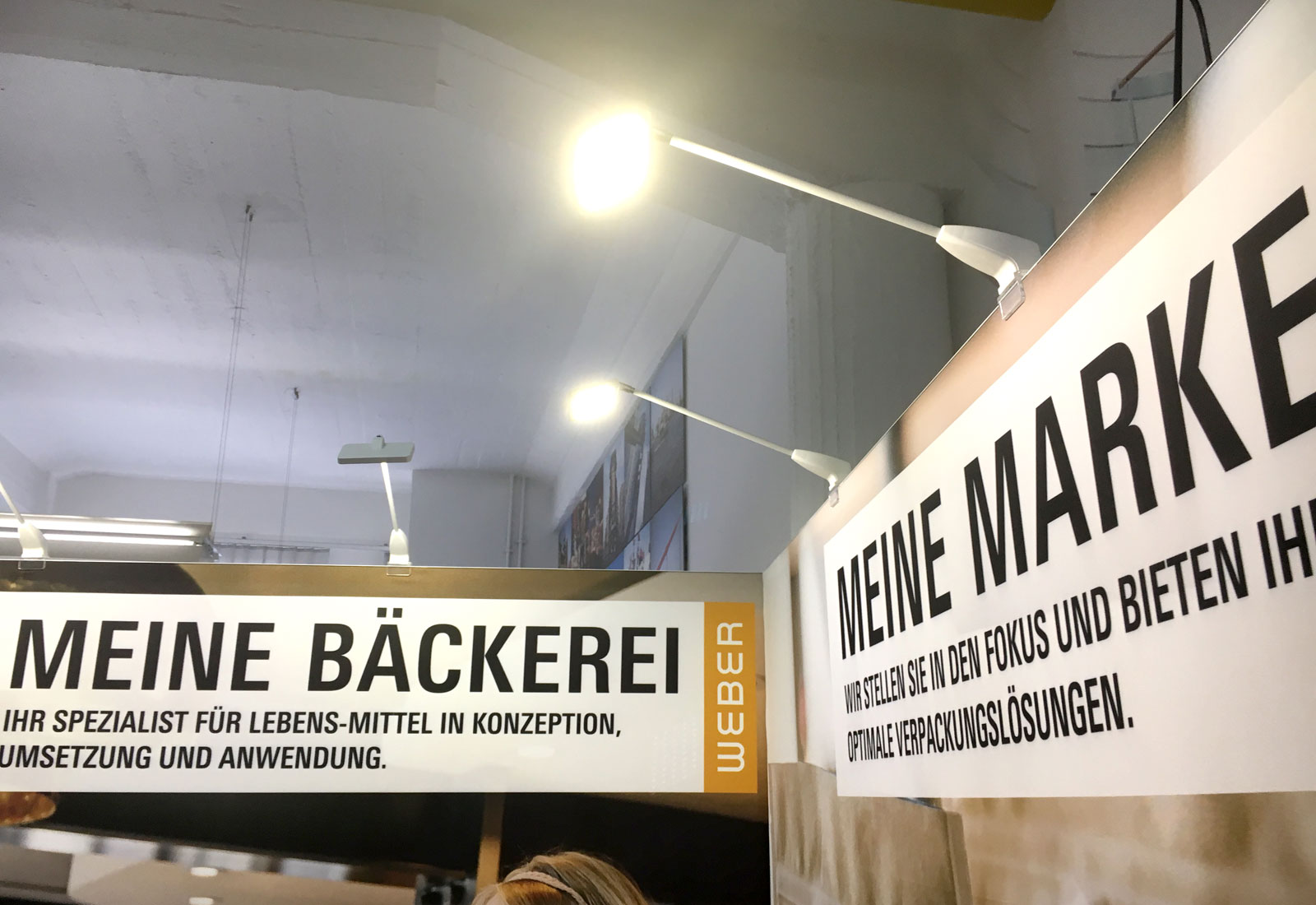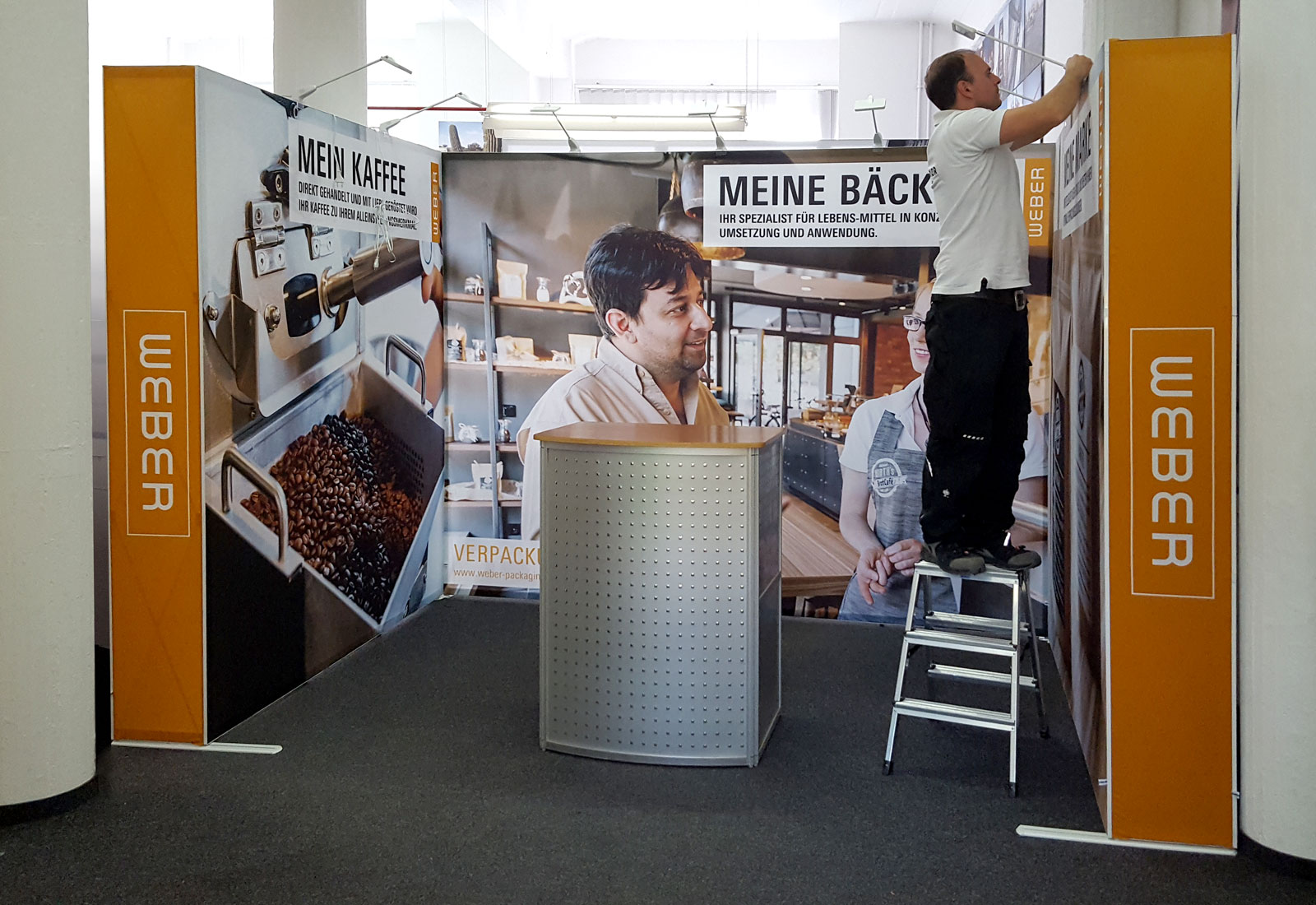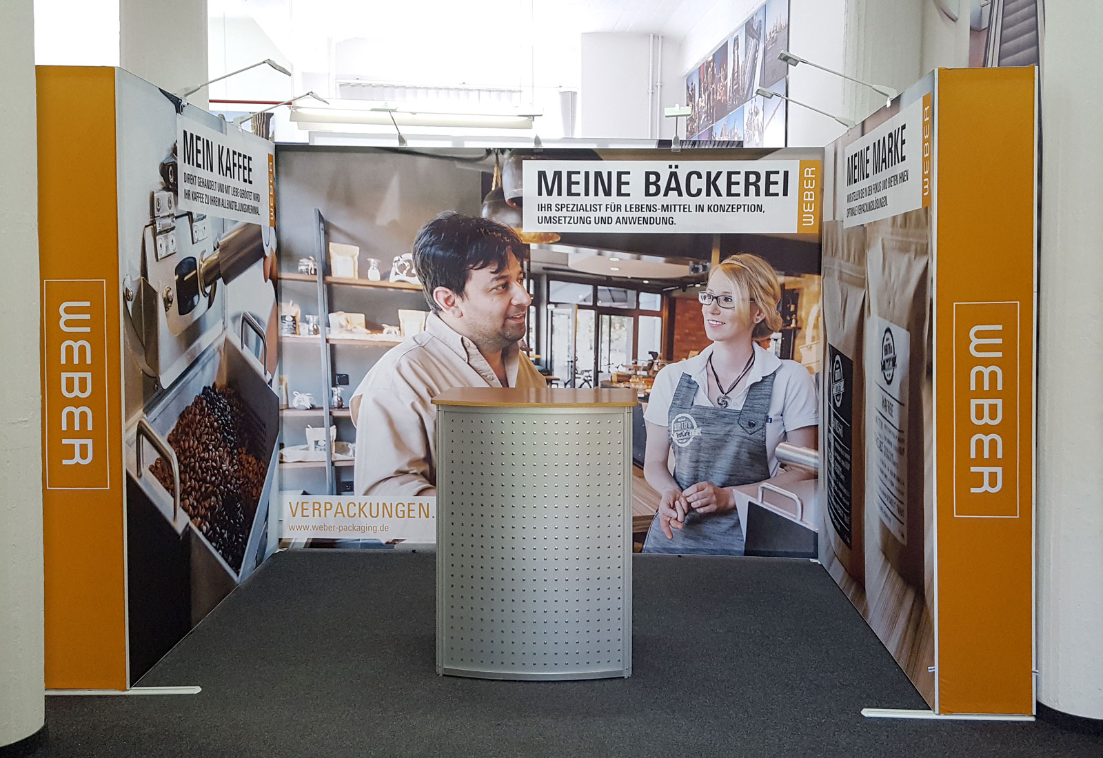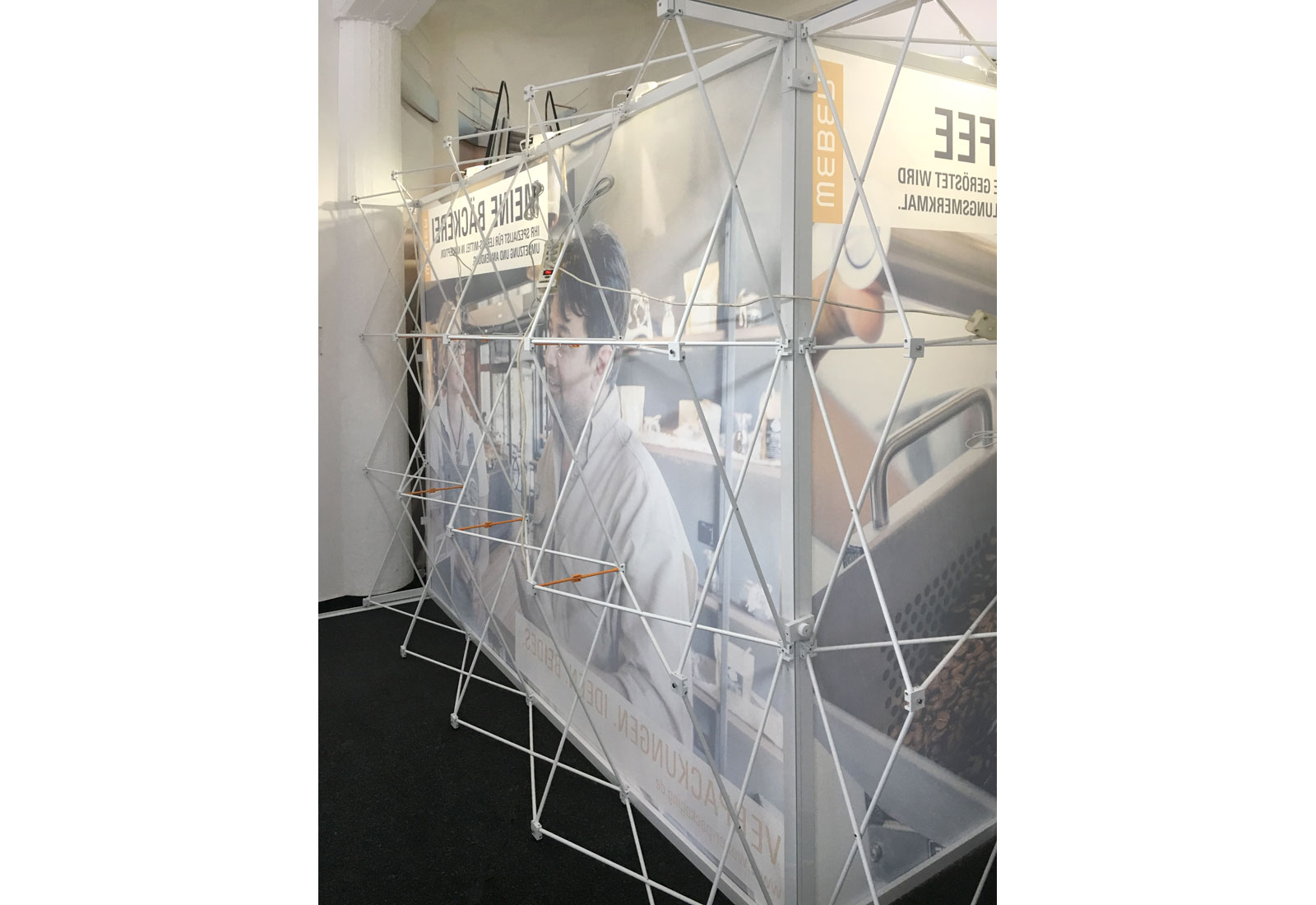 The exhibition stand for our customer WEBER Packaging is an implementation of our new exhibition stand GRID. GRID is a scissor lattice or PopUp system, which is available in different heights and widths. The PopUp system has a circumferential system groove in which the individually printed, textile graphic covering is inserted with a rubber spring. The construction of a folding wall is quick and easy, so that several display walls are built up within a short time. Thanks to stable system adapters, multiple PopUp walls can be connected "over corner" or straight, creating a fully-fledged booth. The structure is so simple that it can be done even by untrained person. Especially convenient is the transport. Each folding wall is transported separately in a trolley that is no larger than a golf bag.