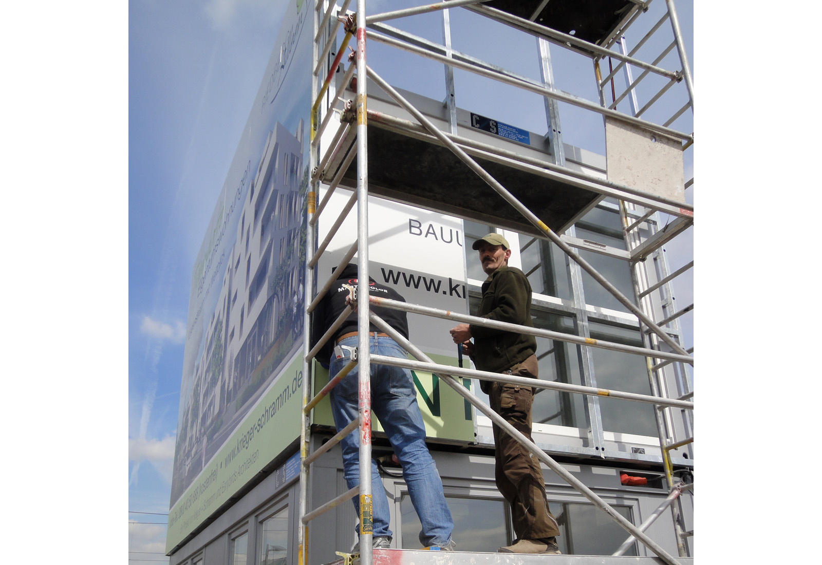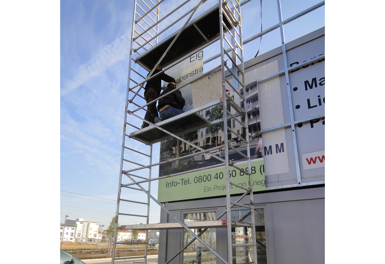 In the west of Frankfurt, a large new construction area was developed. One of the major project developers involved is the Digelstadt company Krieger & Schramm. This commissioned MARTINCOLOR with the design, production and installation of large format construction signs, façade banners, project information boards and posters. The scaffolding on site was also implemented by MARTINCOLOR. For more information on building signs, please contact our team of specialists on tel. +49 (0) 69 75 60 80-85.