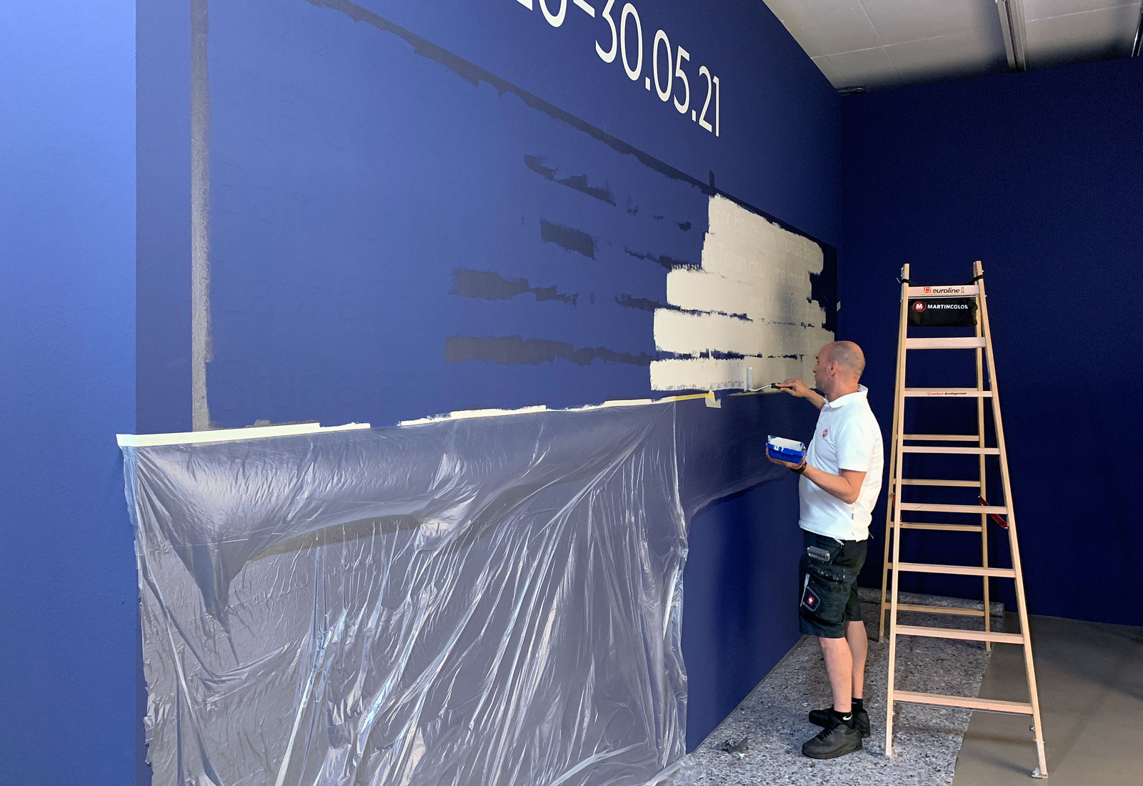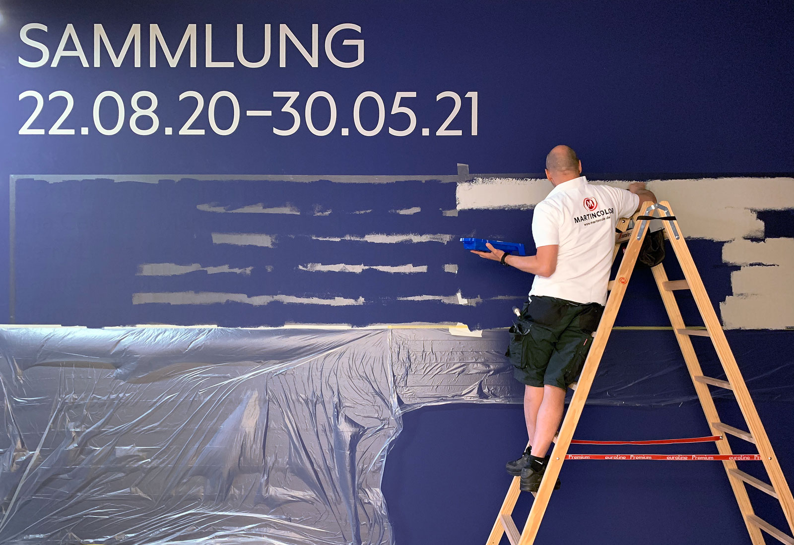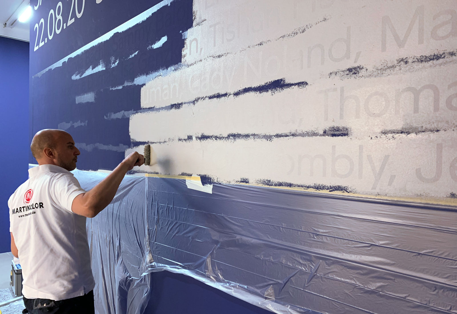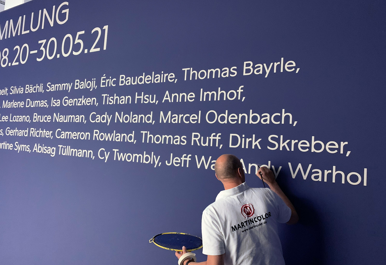The exhibition in the TOWER MMK shows works from the museum's collection from the early 1960s to contemporary and newly acquired works. The labeling for the exhibition was done by MARTINCOLOR. Adhesive or plotter fonts are normally used for exhibition labels. However, for this exhibition, special background colors should be used and the labeling should be done using stencils. For this purpose, a negative plot was made on our cutting plotters, which was then applied to the exhibition walls in the TOWER MMK. The negative plot was then painted over with wall paint and removed after the paint had dried. For more information about this technology, please contact Eric Zies on +49 (0) 69 75 60 80-85.