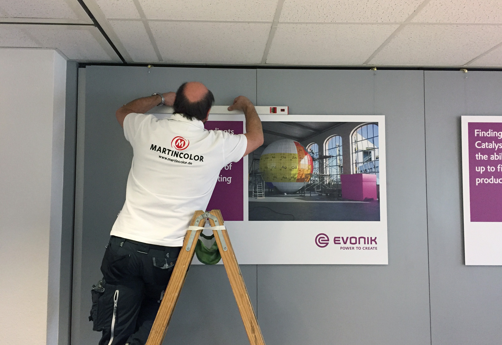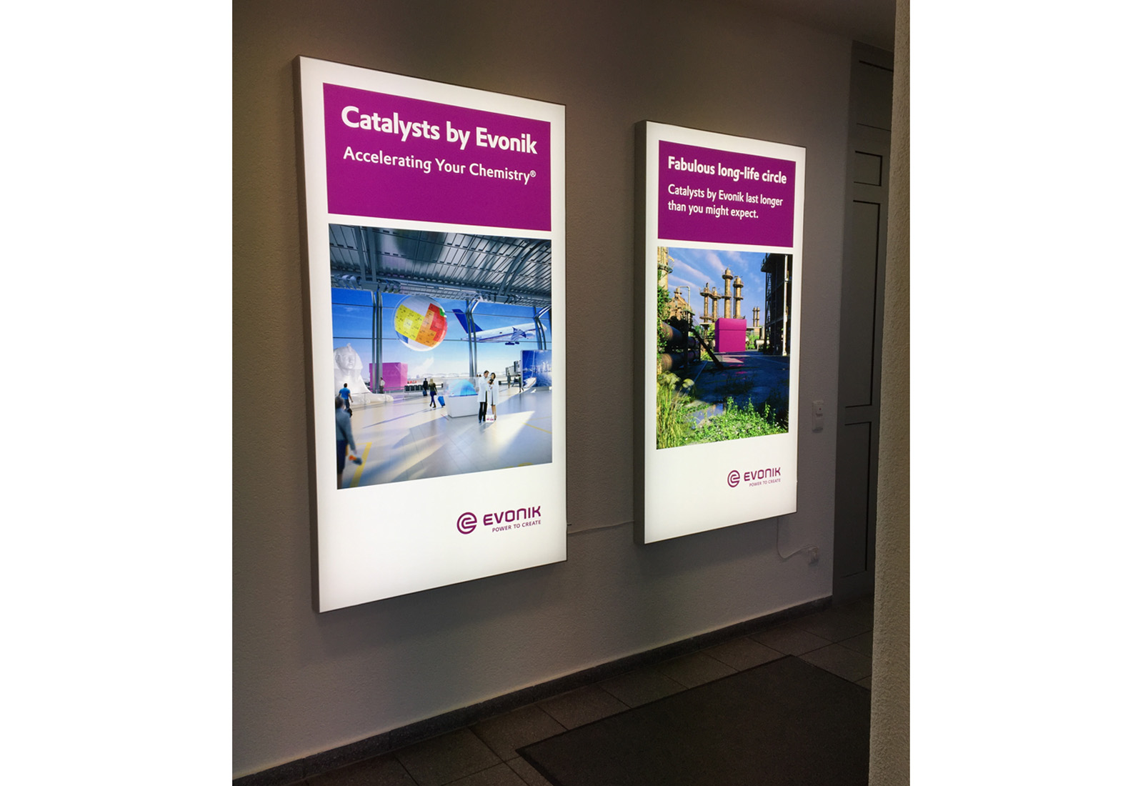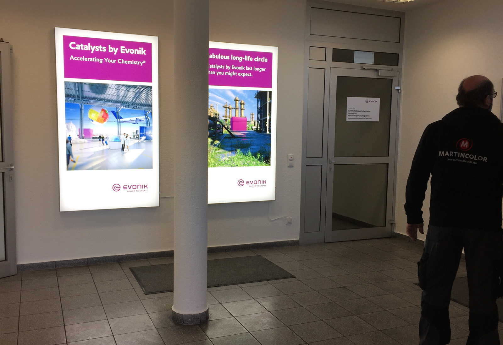 MARTINCOLOR manufactured numerous LED light boxes in the format 100 x 180 cm for Evonik, which were installed at the Evonik location in Hanau-Wolfgang in the stairwell. Due to the small depth of our LED light boxes you lose just in confined spaces very little space. The large-format light boxes were fitted with HD textile fabrics, which impress with their brilliance and luminosity. The MC assembly team also carried out the entire on-site assembly and completed the necessary electrical connections.