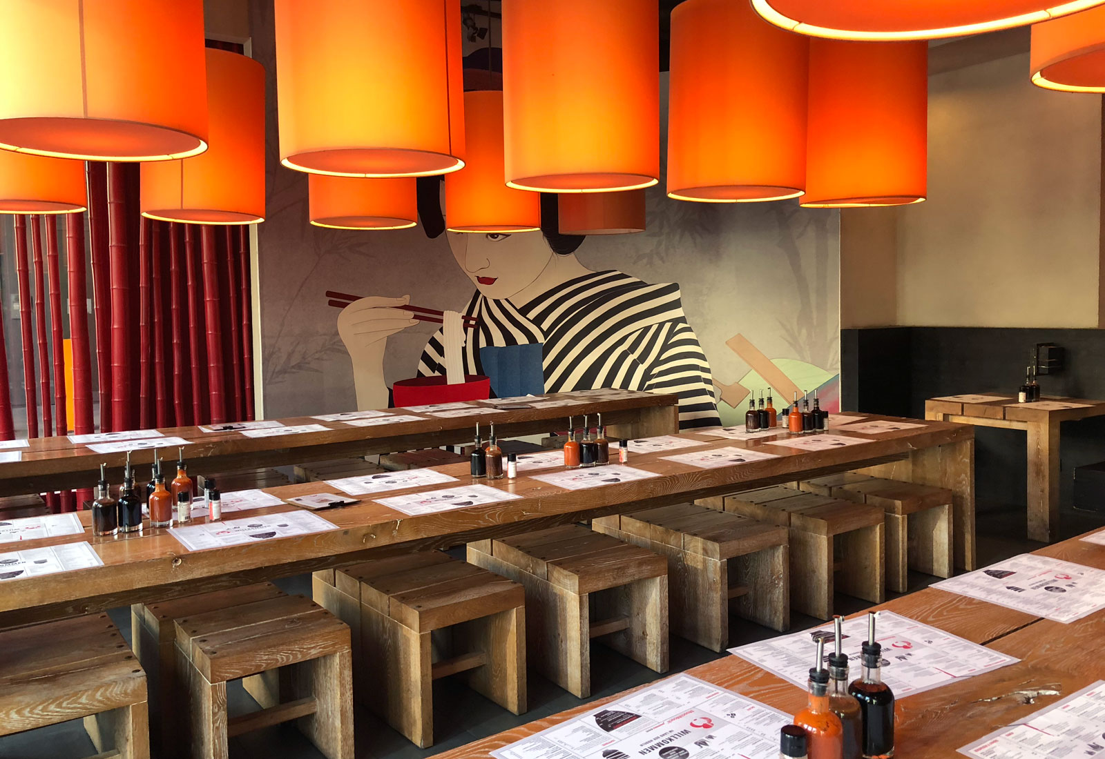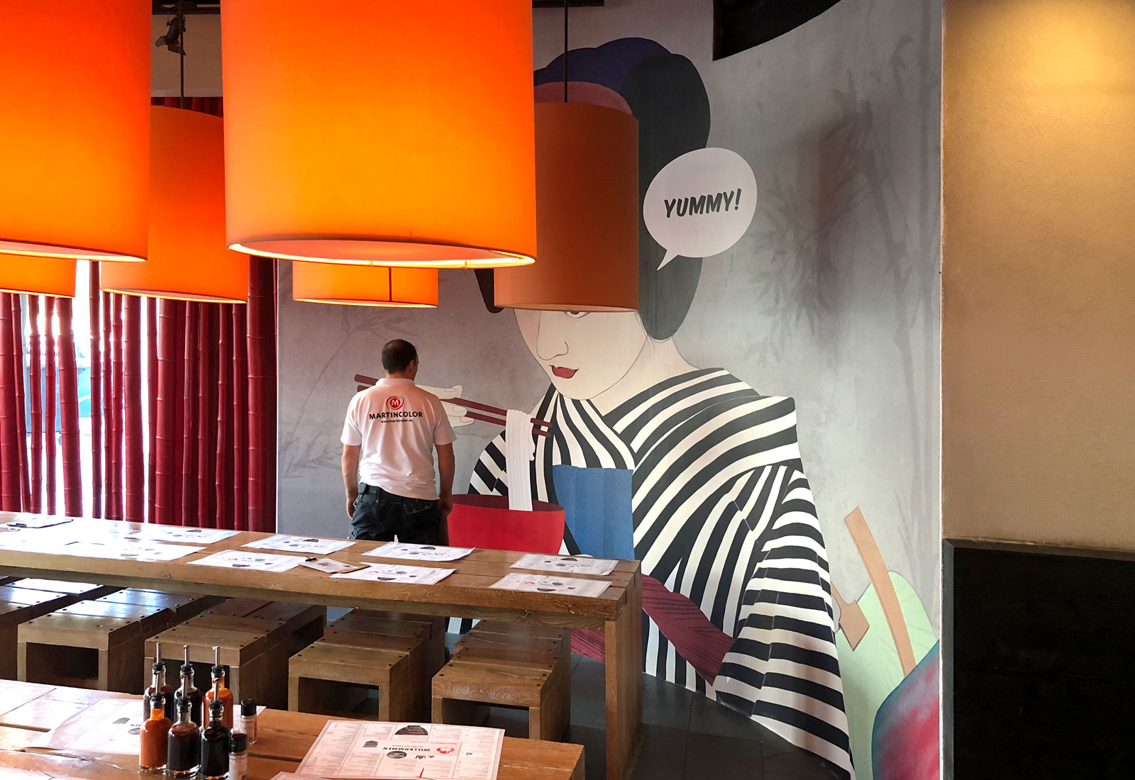 In addition to the production and manufacture of exhibition stands, another core competence of MARTINCOLOR is the equipment of living, restaurant and office space. Et al we print individual room wallpapers in any desired format. For the Nudelbar MoschMosch, with several restaurants, MARTINCOLOR made large-area wallpapers and installed them on site. Our assembly team specializes in projects such as office furniture, signage, office management systems and everything about the individualization of interiors. Of course, we offer our installation services throughout Germany. For more information, contact our specialist at +49 (0) 69 756080-0.