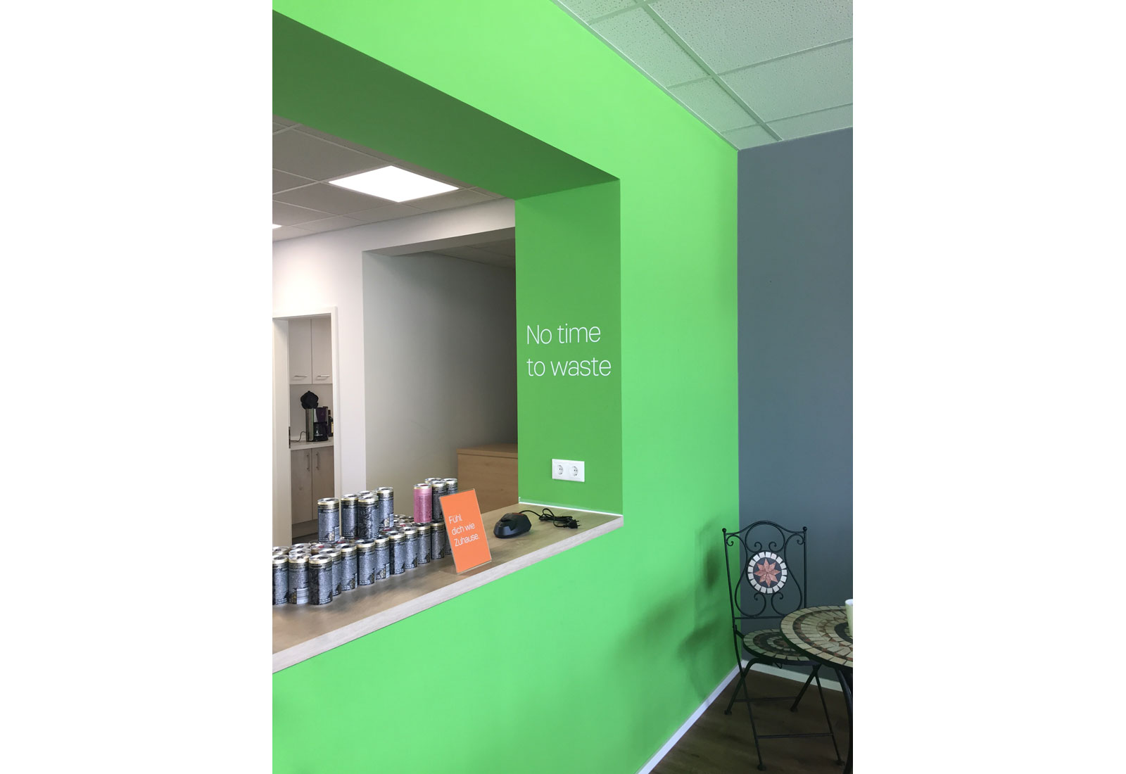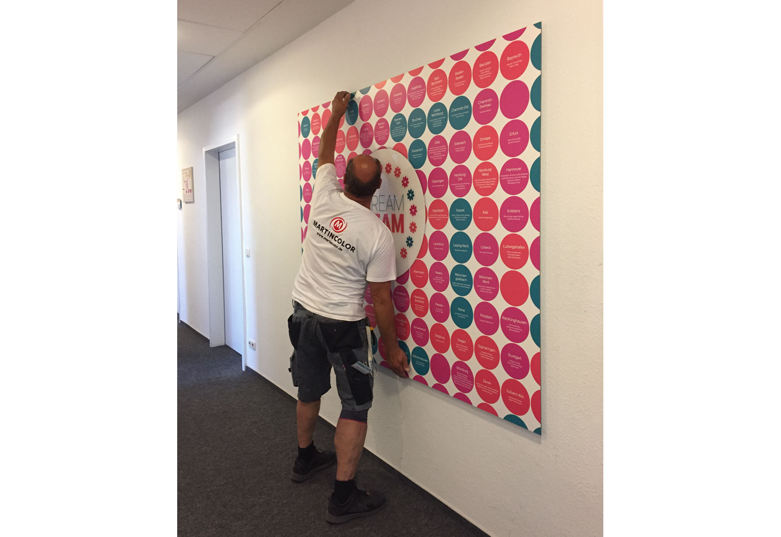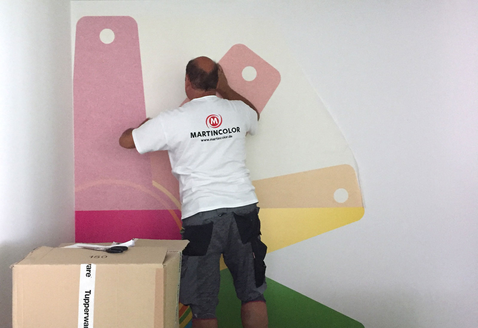 MARTINCOLOR produced the interior decoration of the wall surfaces for various district branches of Tupperware Deutschland GmbH. The designs specified by Tupperware GmbH were transferred to our data processing, vectorized and transferred to different colored adhesive films. Using our patented Print & Cut process, we can cut out individual print motifs precisely, transfer them to foils and stick on the areas specified on site. Our MC assembly team installs appropriate office brandings, wall tattoos, large-format wall papers, lettering and signs throughout Germany.