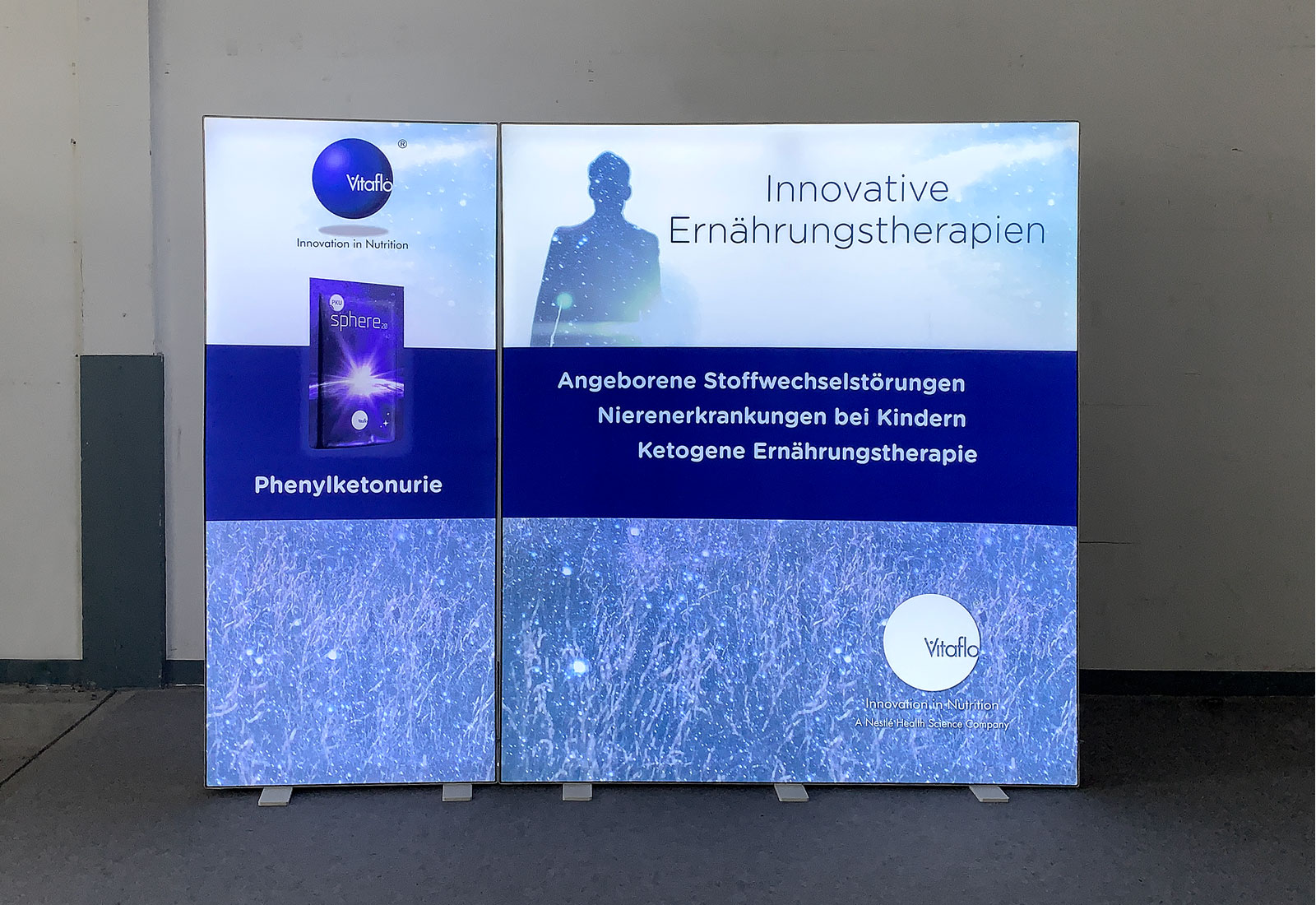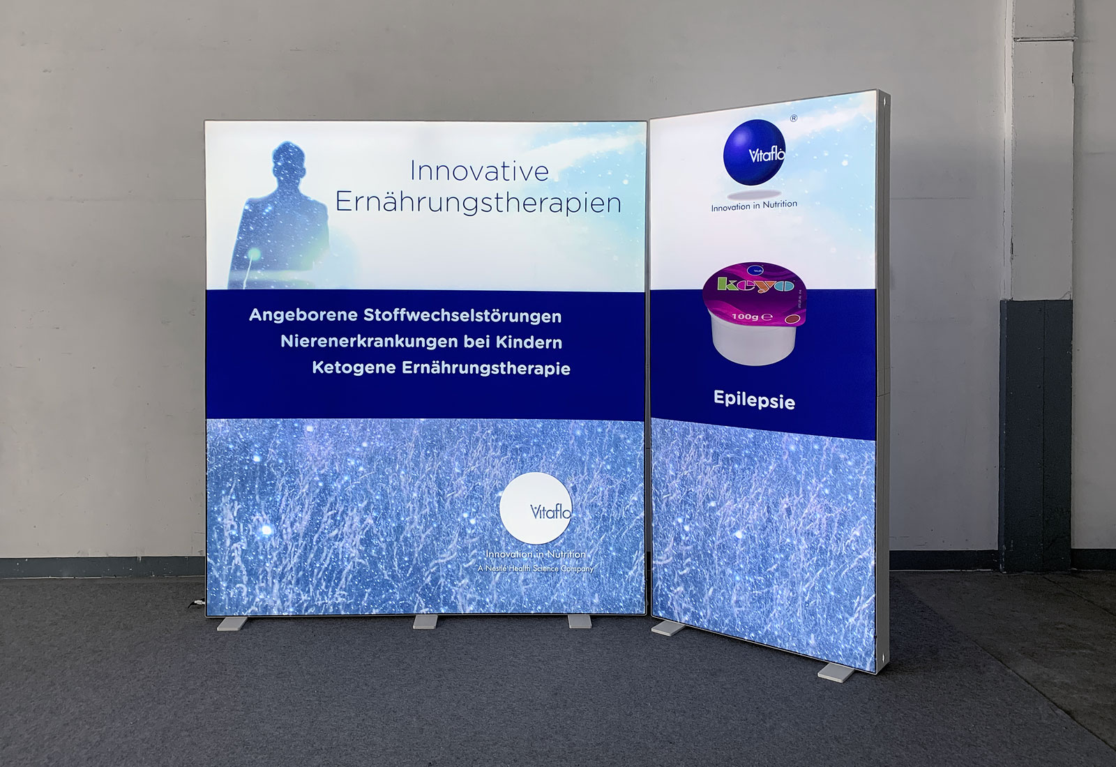 Our customer Vitaflo specializes in the development of innovative products for the dietary therapy of disease-related malnutrition. For the presentation of the products at fairs and exhibitions, Vitaflo decided to use an LED exhibition stand and visited numerous light walls in our showroom. The decision was made on the LED exhibition wall PIXLIP GO. This lighting system is particularly fast and easy to install and transport. Even inexperienced people get along wonderfully with the simple plug-in technology. The individual Diadruck, which is stretched on the light frame, is foldable and brilliant in the effect. All PIXLIP GO LED exhibition walls are equipped with practical transport bags. A normal car can be used for transport. More information can be found here or call us at Tel. +49 (0) 69 756080-0.