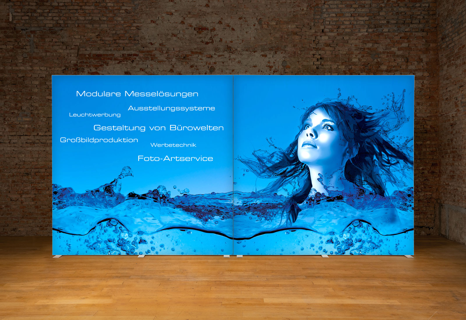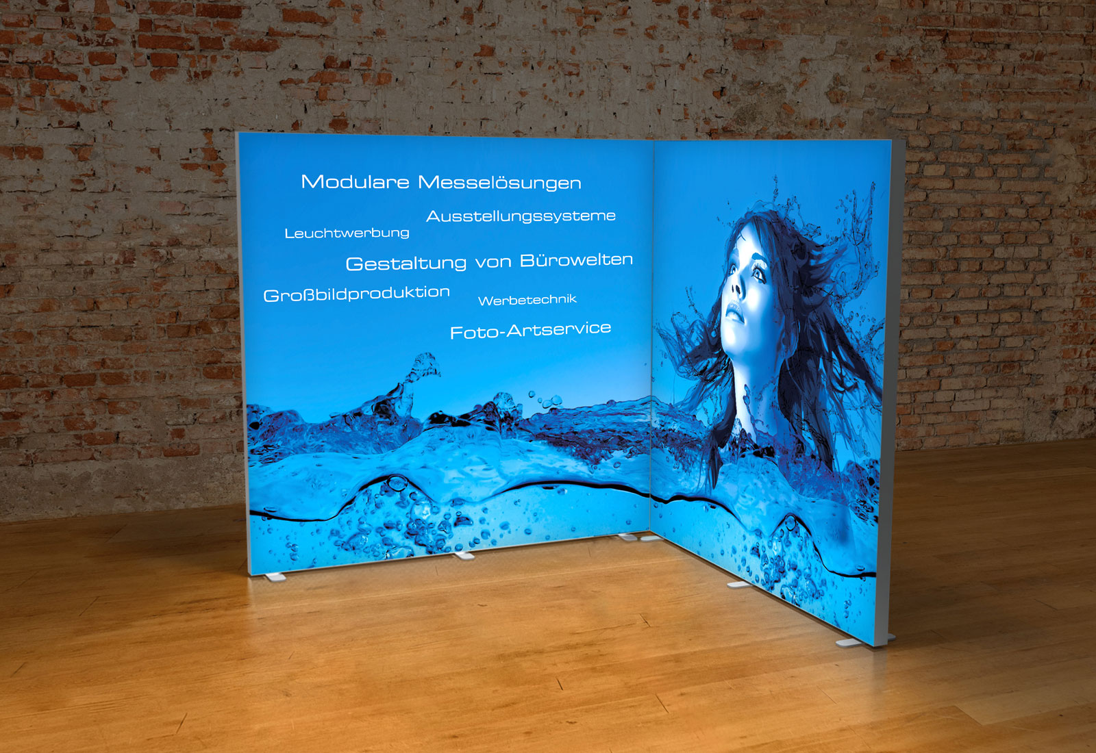 One of our most impressive room dividers is the ALU STAR illuminated wall. Made of high-quality aluminum, the robust illuminated frame is a "stand alone" solution that can be installed in the middle of a room or in an "open space" office concept. The illuminated wall can be covered on both sides with an individually printed slide motif, creating an impressive spatial effect. ALU STAR illuminated walls are available in widths of 100 cm, 200 cm, 300 cm, 400 cm and 500 cm and in system heights of 230 cm, 250 cm and 300 cm. If several ALU STAR illuminated walls are placed next to each other, the result is a luminous wall development or luminous partitioned room concepts.
