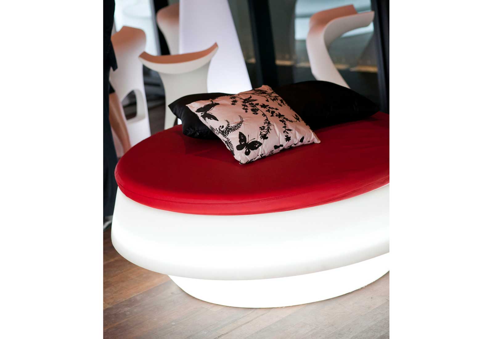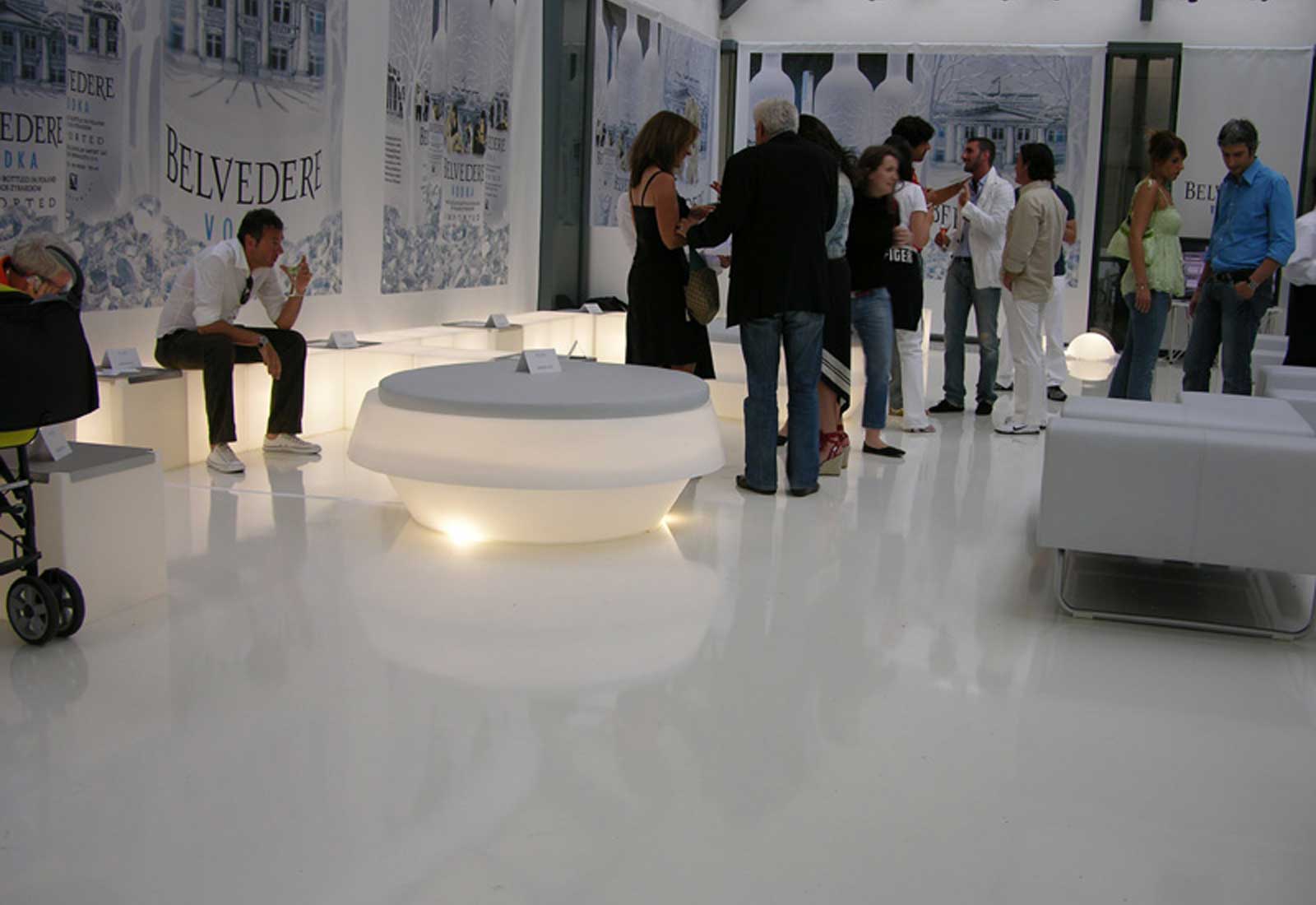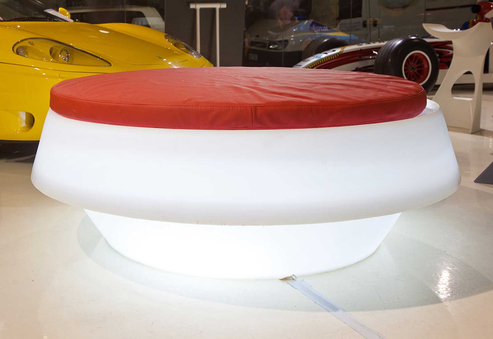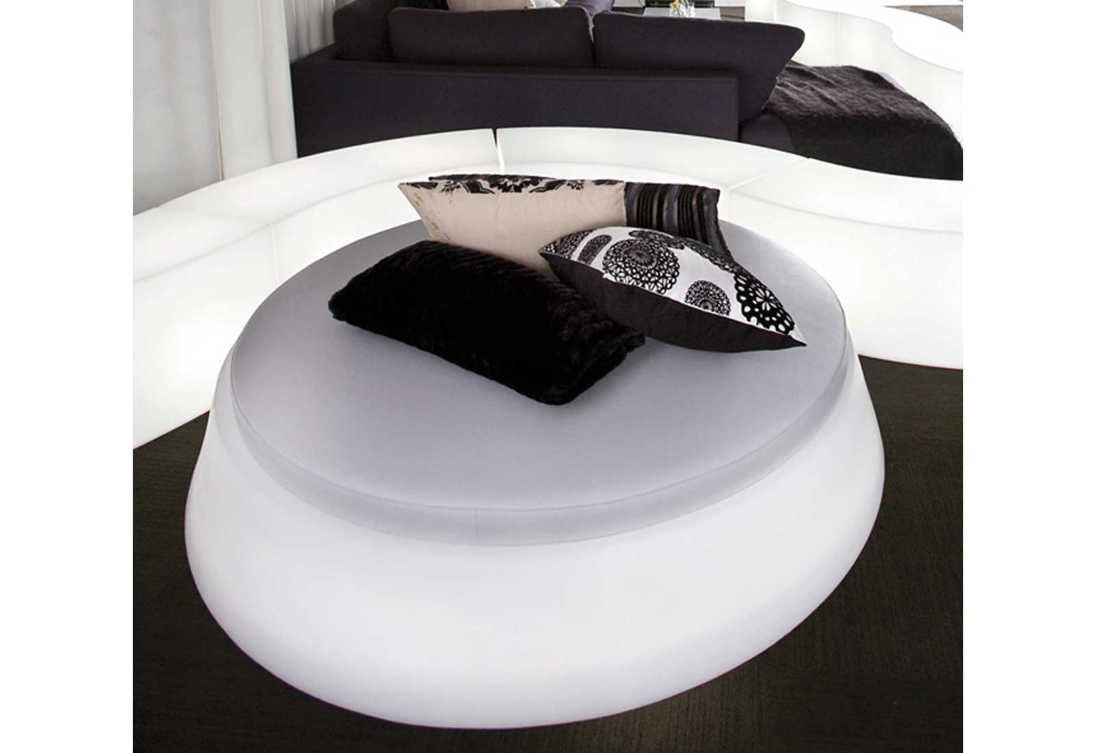 The designer sofa Giò Pouf enriches the seating possibilities at your fair, your event, exhibition or event. It offers maximum seating comfort and is usable "all around". Due to the illuminated body made of weatherproof polyethylene, the luminous sofa Giò Pouf comes into its own. The luminous seat island Giò Pouf is also suitable for outdoor use. Only in the rain we recommend to remove the gray seat cushion. The Giò Pouf is 53 cm high and has a diameter of 145 cm.