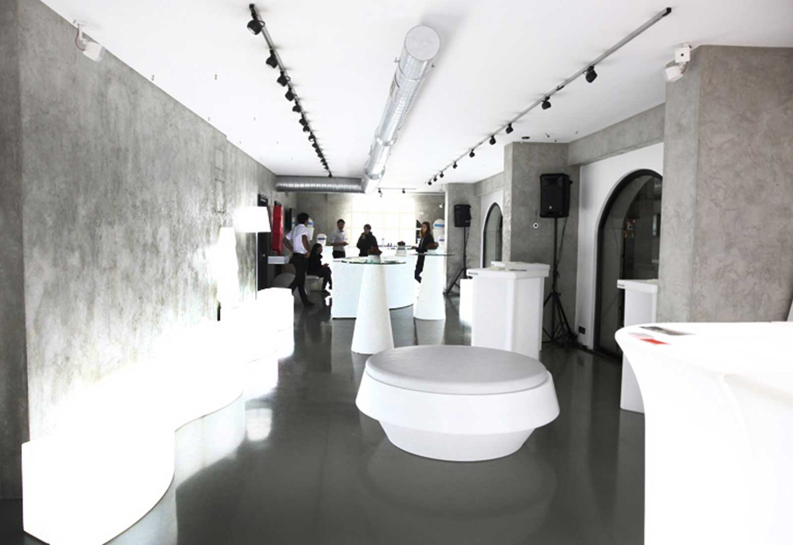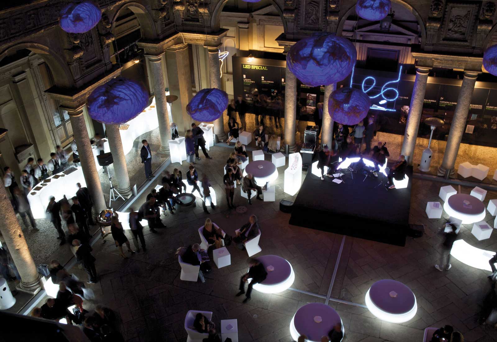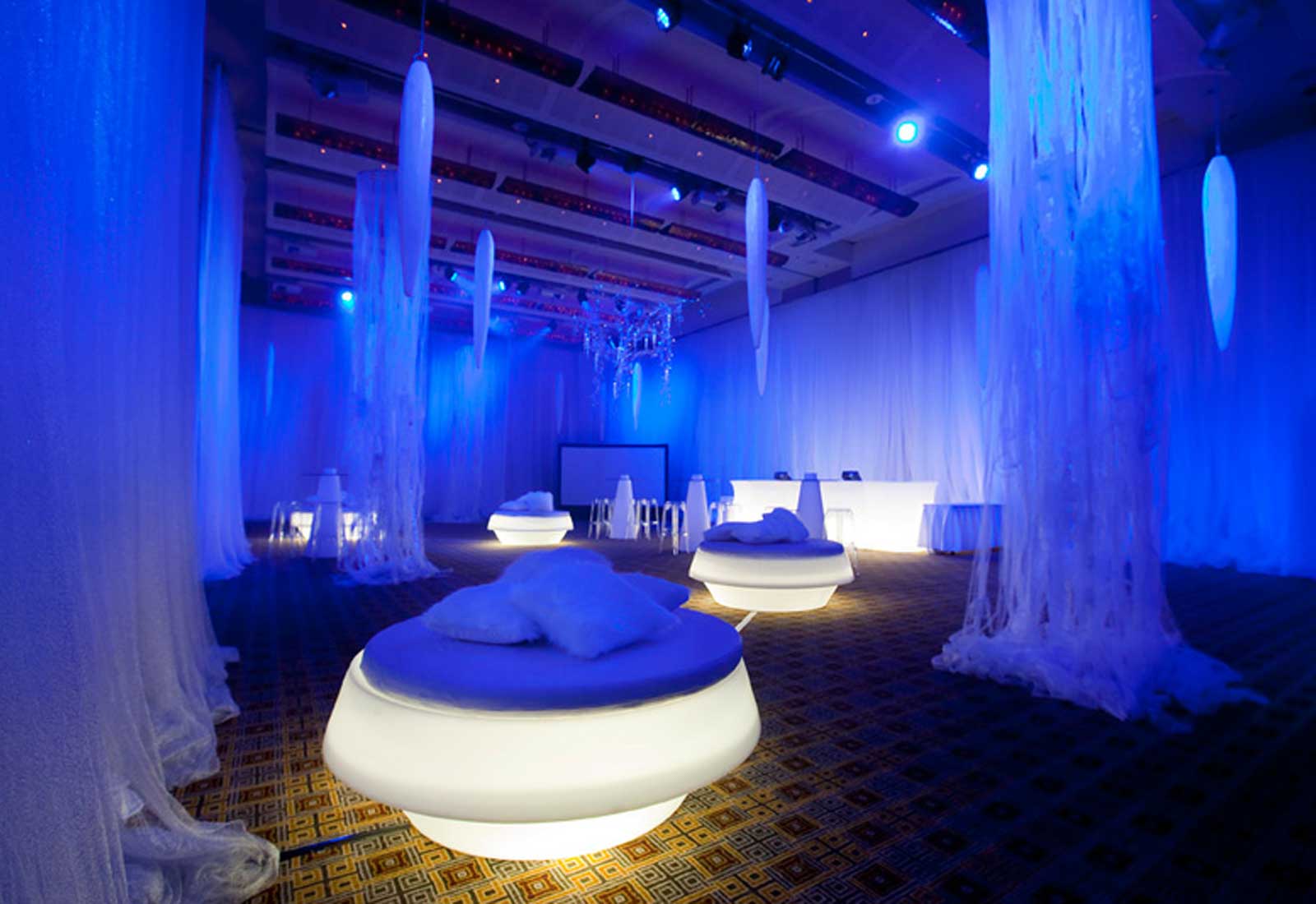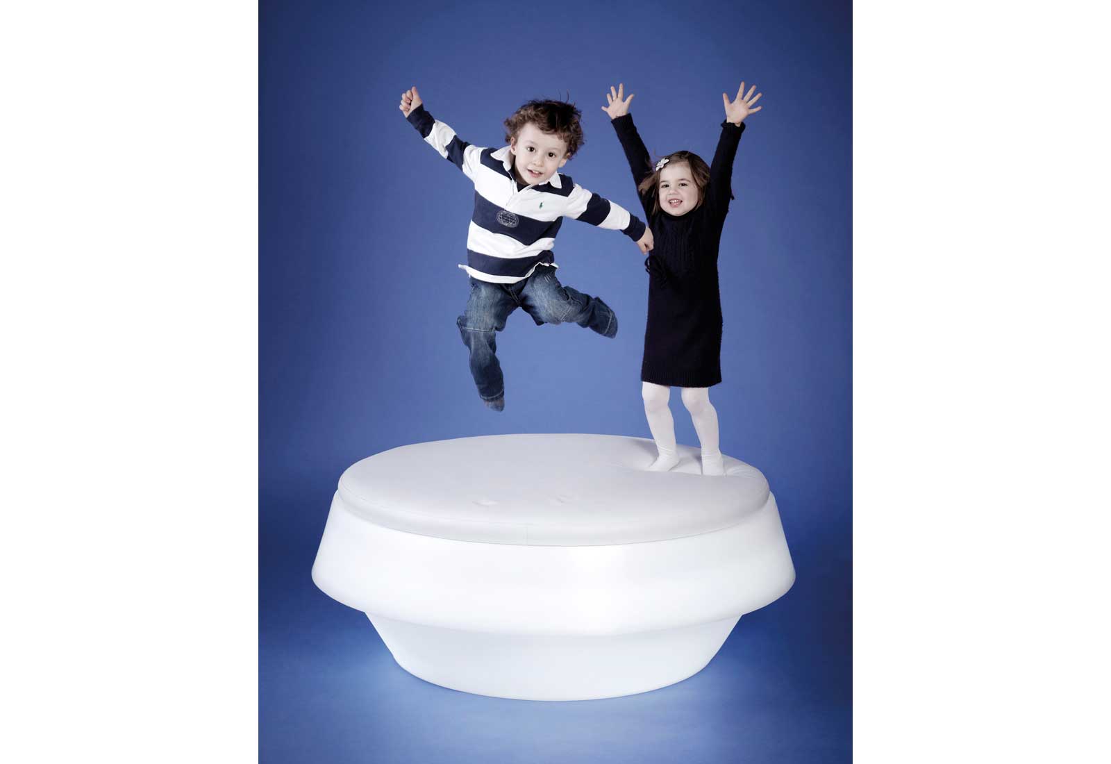 The designer sofa Giò Pouf enriches the seating possibilities at your fair, your event, exhibition or event. It offers maximum seating comfort and is usable "all around". Due to the illuminated body made of weatherproof polyethylene, the luminous sofa Giò Pouf comes into its own. The luminous seat island Giò Pouf is also suitable for outdoor use. Only in the rain we recommend to remove the gray seat cushion. The Giò Pouf is 53 cm high and has a diameter of 145 cm.