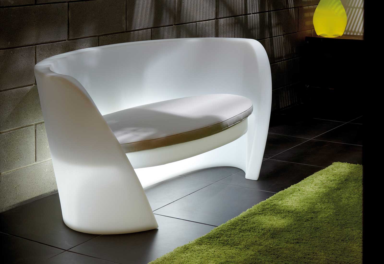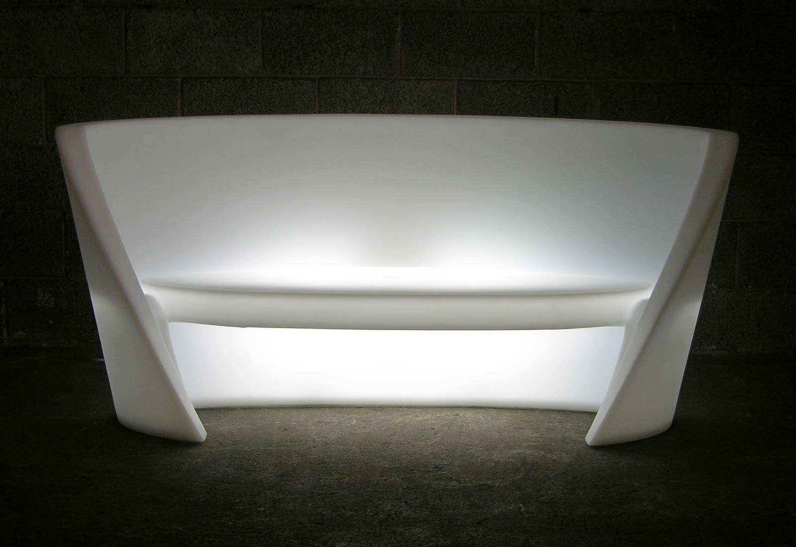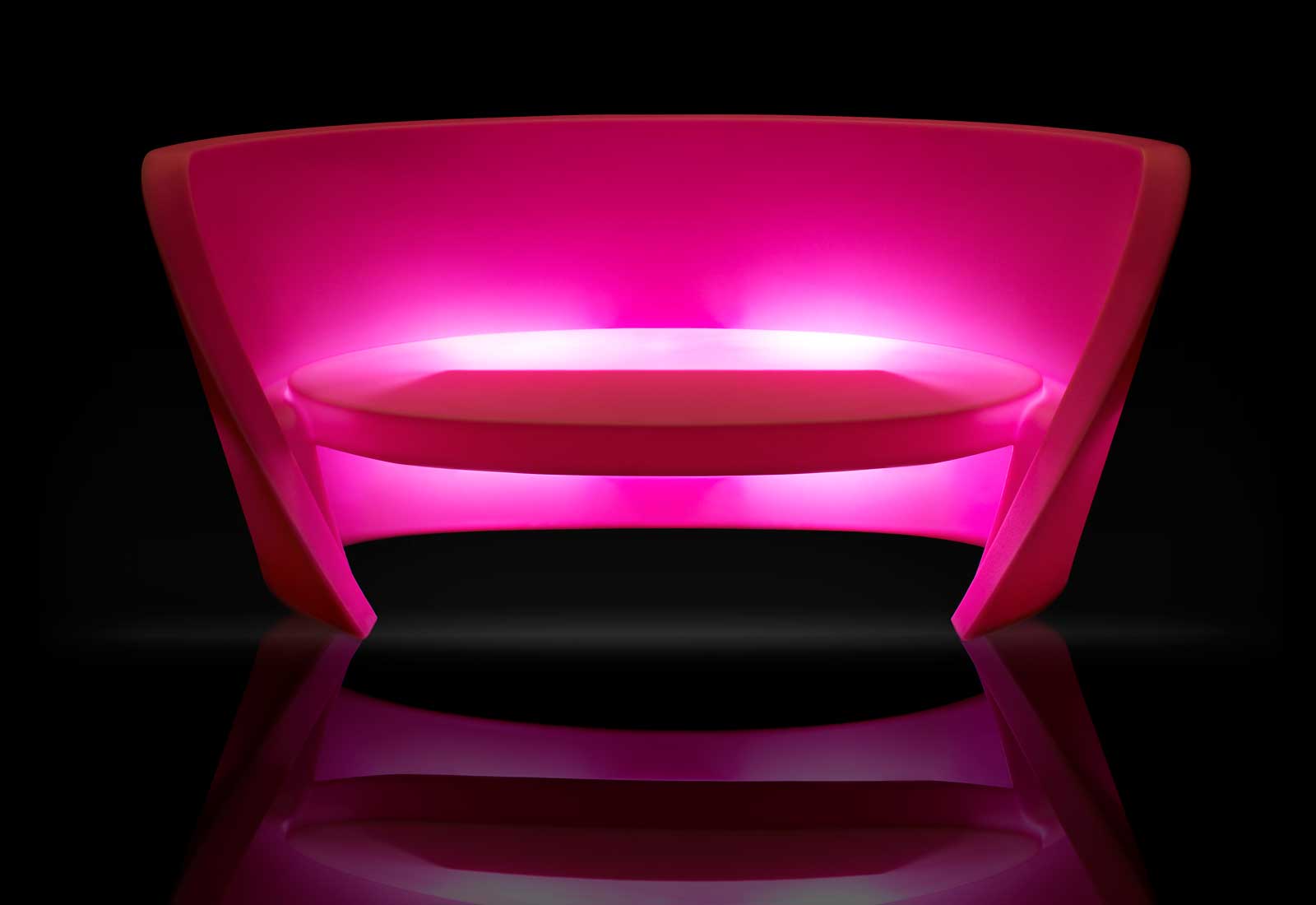 Brand new and an eye-catcher at every event, exhibition or in the in- and outdoor launch area is the decorative, glowing sofa RAP. The designer sofa was created by Karim Rashid and can comfortably accommodate two people. The seat height is 36 cm, the weight 35 kg. The sofa RAP is also available in special lacquered colors in addition to the illuminated version. The luminous sofa RAP is made of 100% recyclable polyethylene, is weatherproof and equipped with two sockets for E27 energy-saving lamps. The bulbs are not included. The indoor version has a white cable, the outdoor version has a black cable. Upon request, a soft seat made of soft polyurethane, available in white, gray or dark gray, can be ordered in addition to the RAP light sofa.