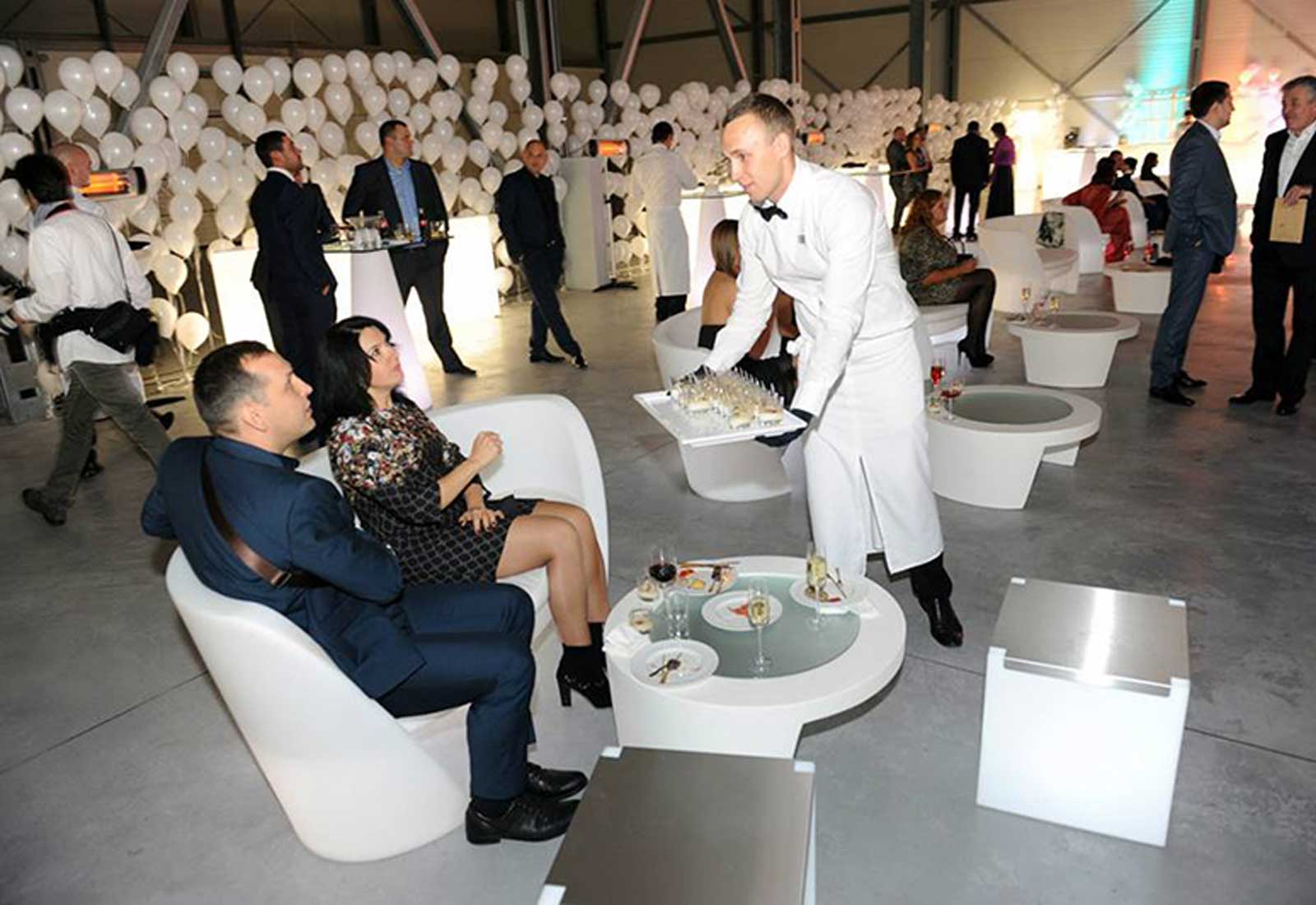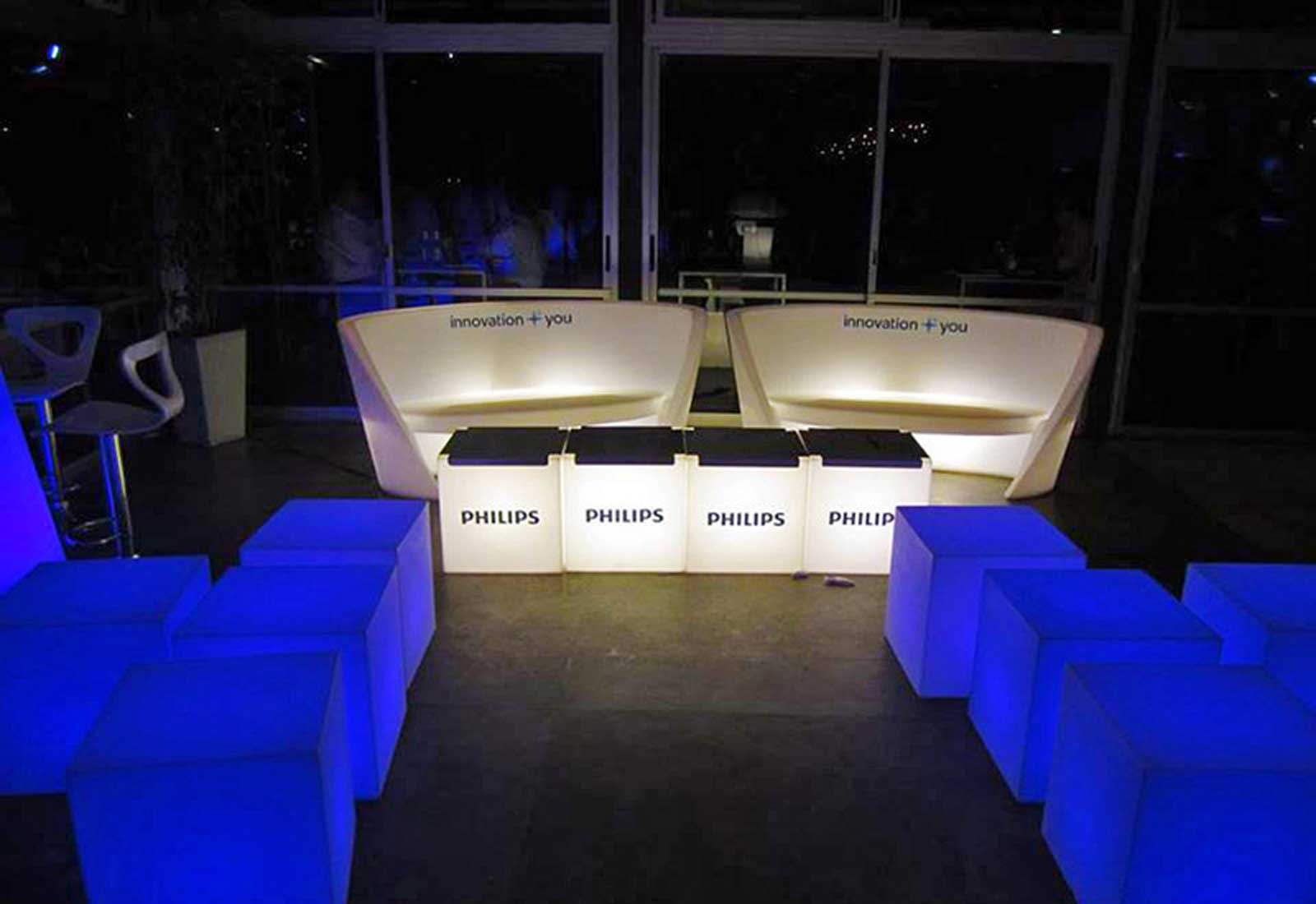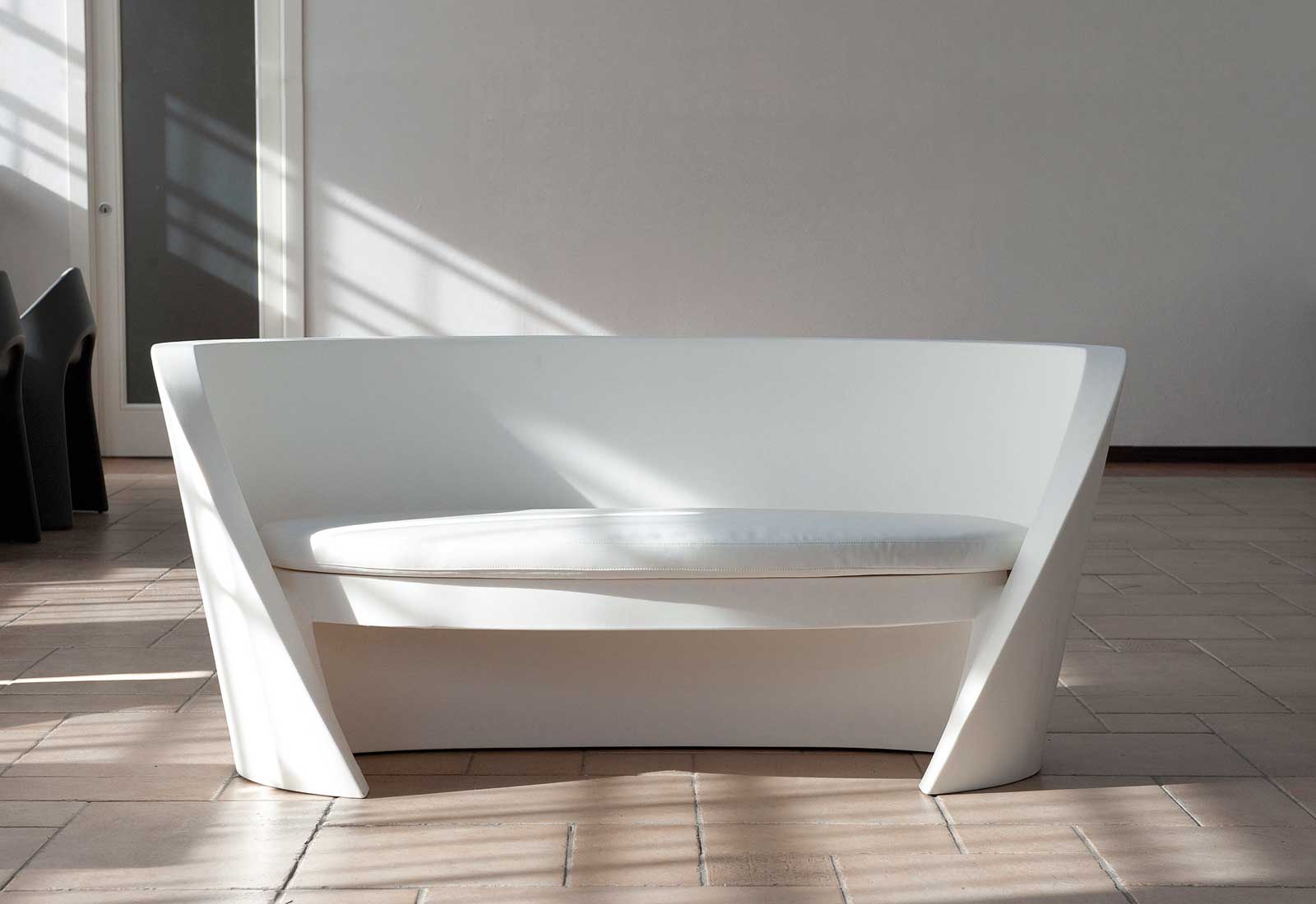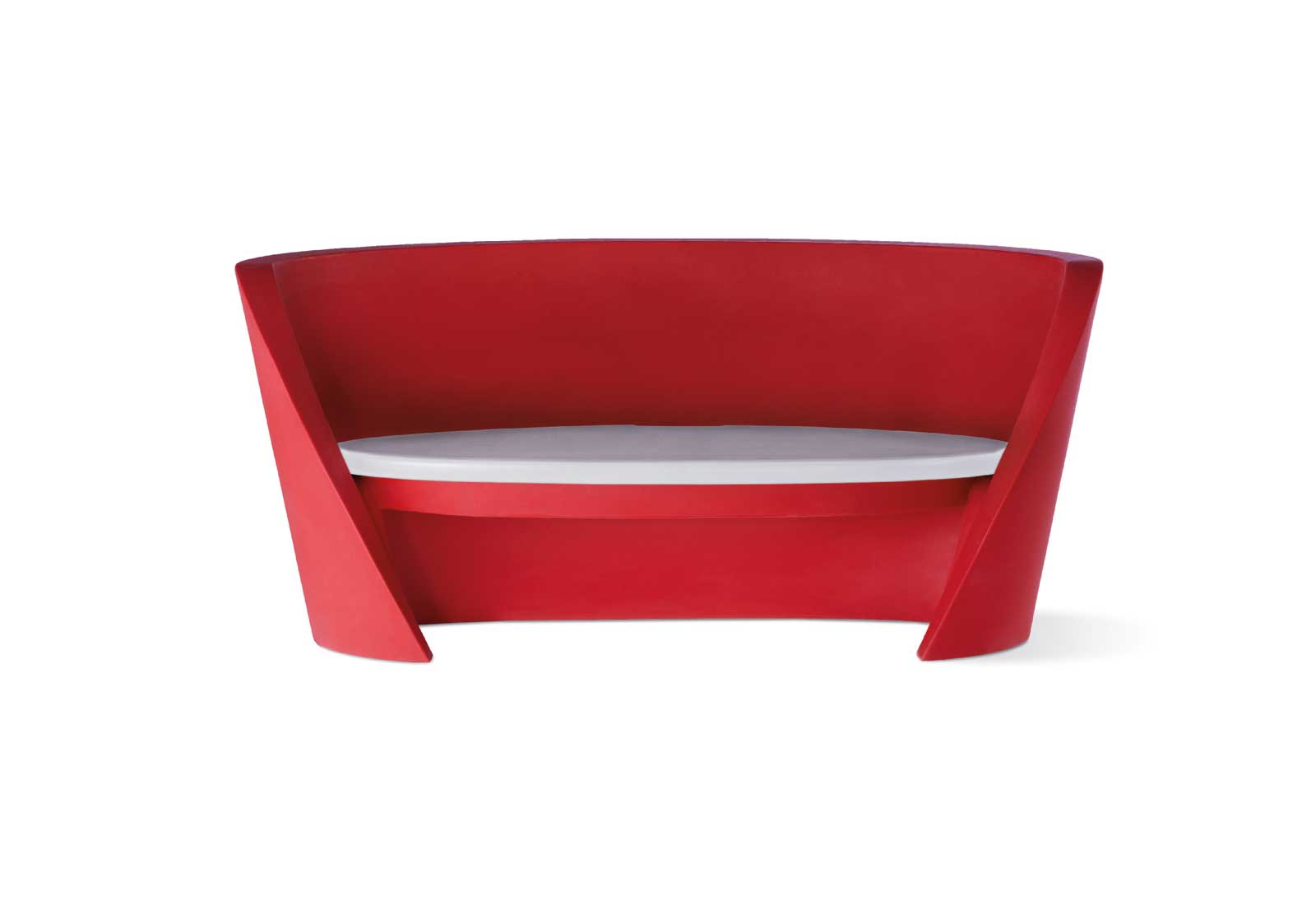 Brand new and an eye-catcher at every event, exhibition or in the in- and outdoor launch area is the decorative, glowing sofa RAP. The designer sofa was created by Karim Rashid and can comfortably accommodate two people. The seat height is 36 cm, the weight 35 kg. The sofa RAP is also available in special lacquered colors in addition to the illuminated version. The luminous sofa RAP is made of 100% recyclable polyethylene, is weatherproof and equipped with two sockets for E27 energy-saving lamps. The bulbs are not included. The indoor version has a white cable, the outdoor version has a black cable. Upon request, a soft seat made of soft polyurethane, available in white, gray or dark gray, can be ordered in addition to the RAP light sofa.