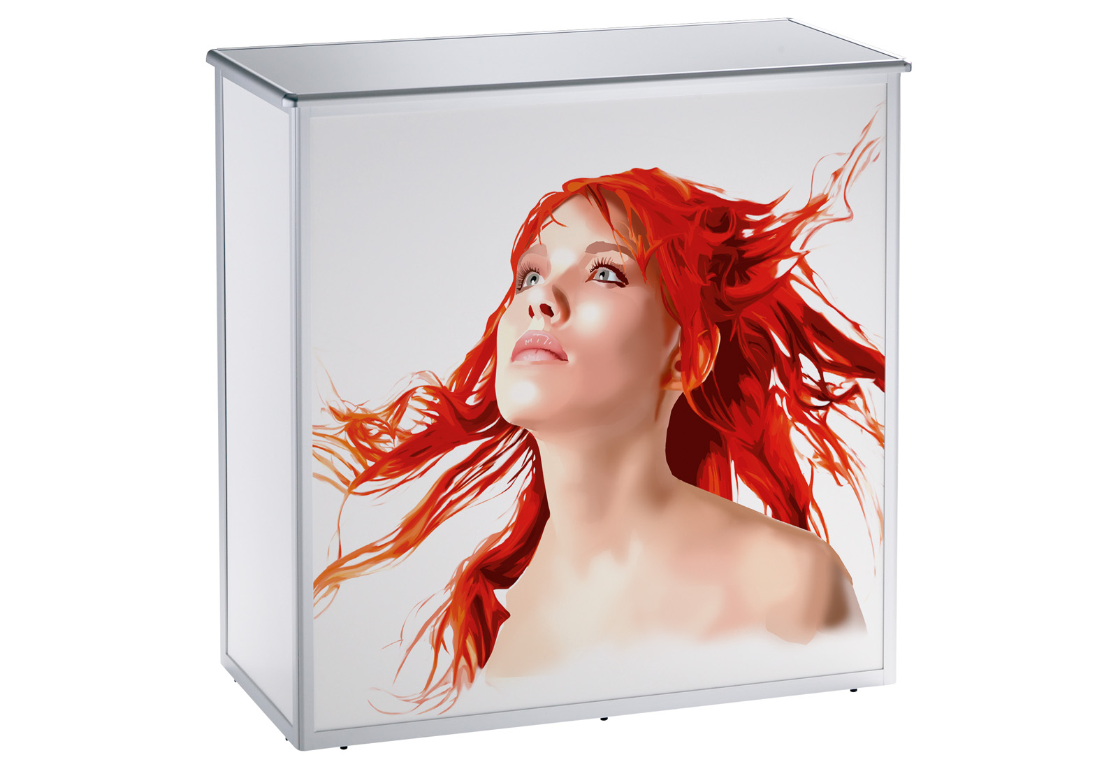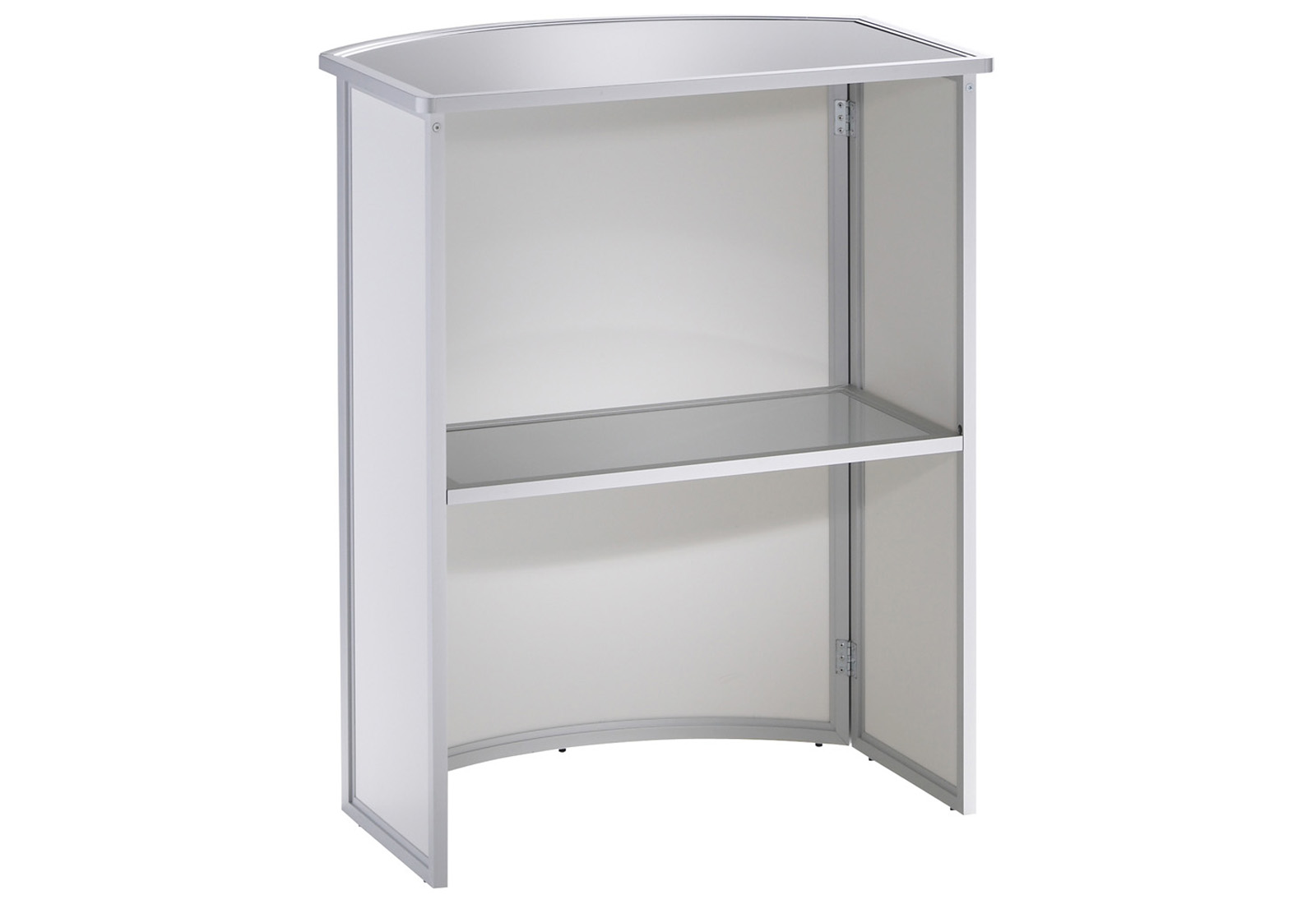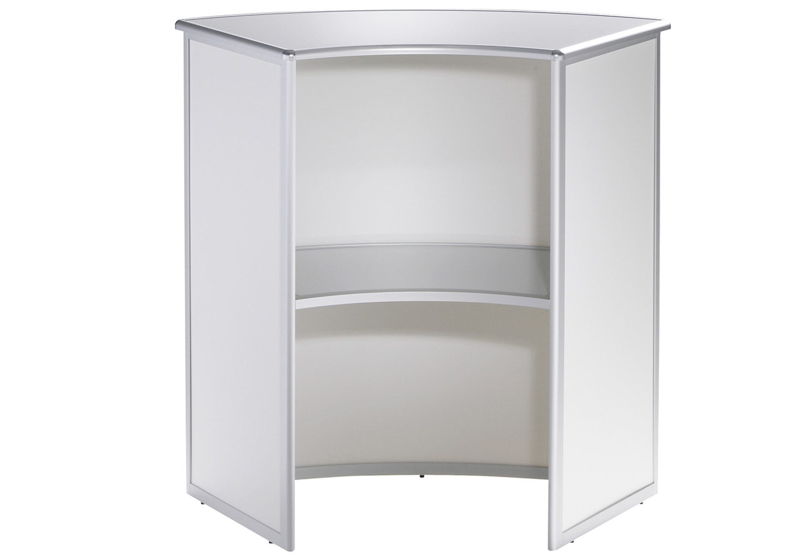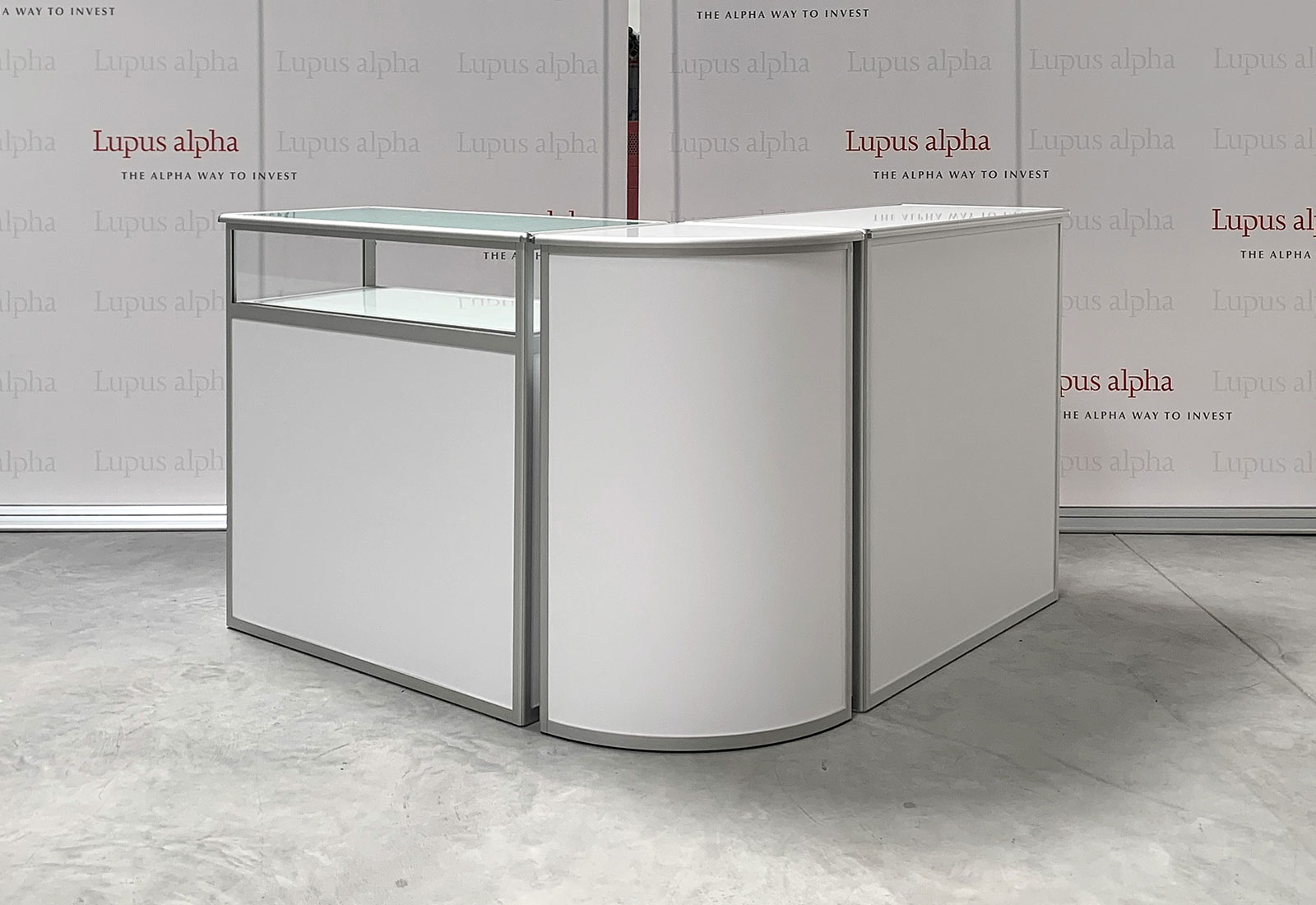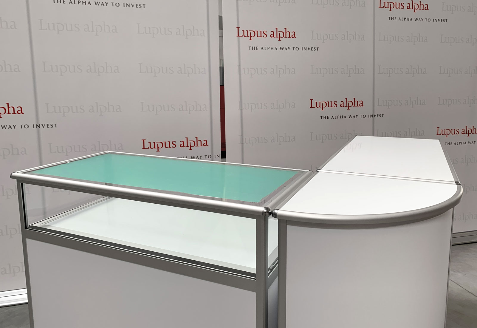 ALU-PRO counters are high-quality, design-responsive, foldable countertops that come in a variety of shapes and sizes. The simple folding technique makes it easy to fold all models to a transportable size. High-quality aluminum profiles with rounded edges, framed shelves and continuous hinges make no compromises. All models have an intigrated storage shelf. The systems with straight rear wall can be additionally provided with lockable doors on request. Counter ALU-PRO counters are easy to build by one person, of course, without any tools. Front and side panels can be individually equipped with graphic print. Ideal for events, fairs and sales area.