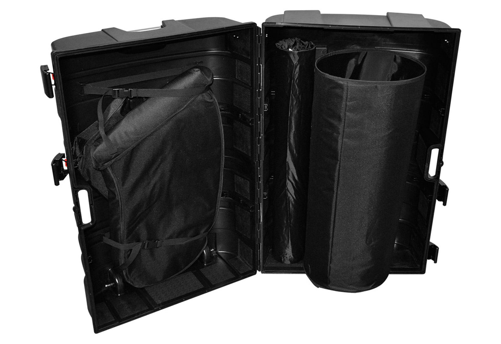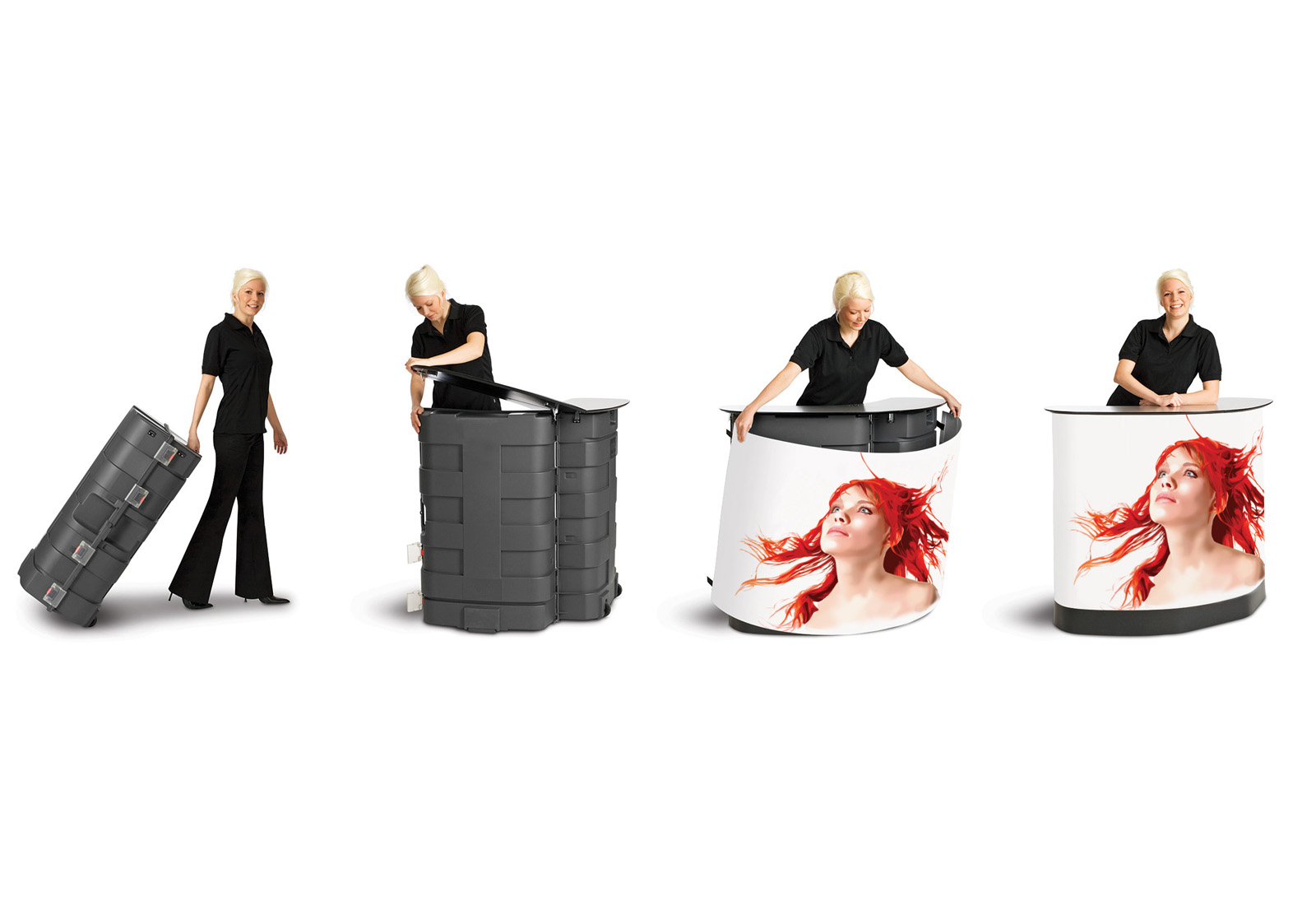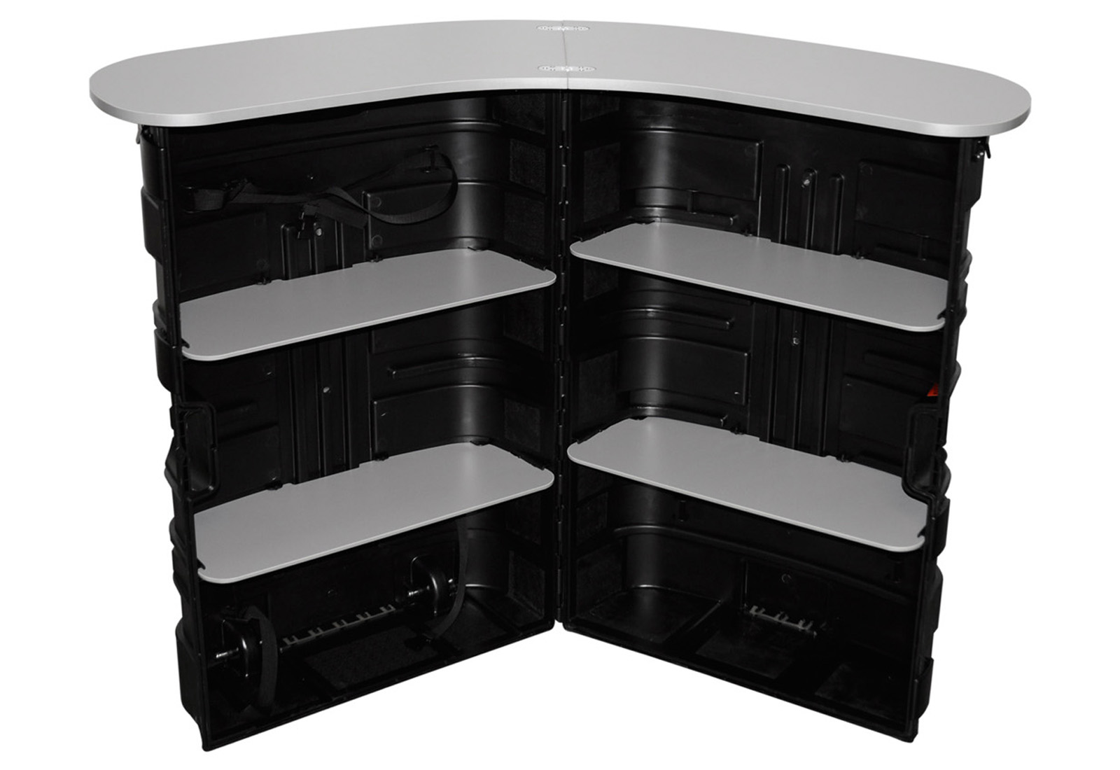 The new, cost-effective counter case is a rollable transport case and counter in one. The opening of the transport box creates a spacious bar. The front of the counter is available for your advertising graphic. This is simply pulled around the box and fixed with Velcro fasteners. The package comes as standard with a silver counter cover plate and a shelf insert set for the back of the counter. The graphic train and the shelves also find safe place in the closed box during transport. The counter is ideal for use at trade shows and events where there is not enough storage space available.