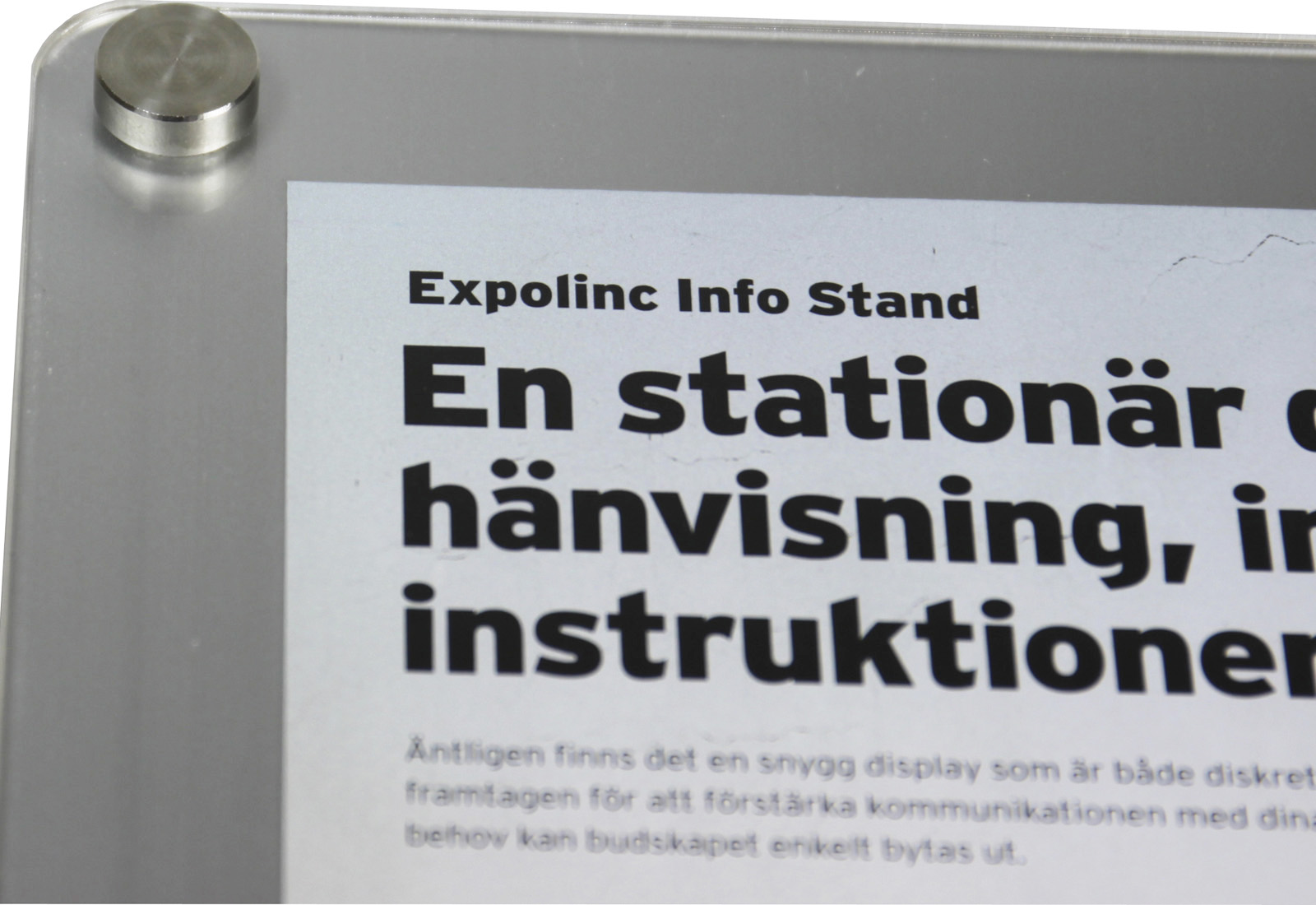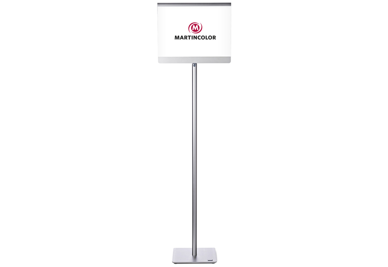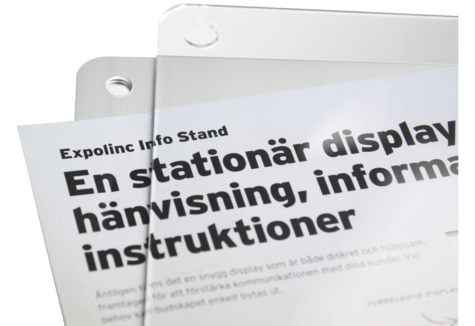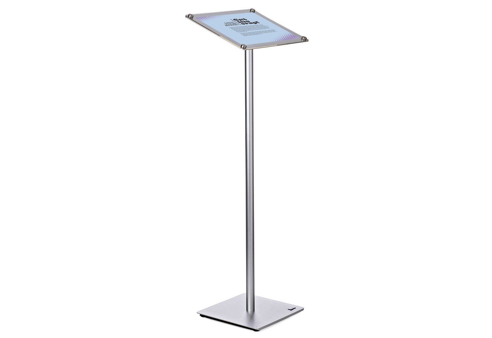 Info stand is a professional and elegant display for any signage such as signposts, information or instructions. Info stand is the stylish helper to show visitors the right way in objects, at events, trade fairs, in the showroom or at exhibitions, or to present facts and technical information. The angled version has a perfect reading position and the straight is ideal for double-sided guidance systems.