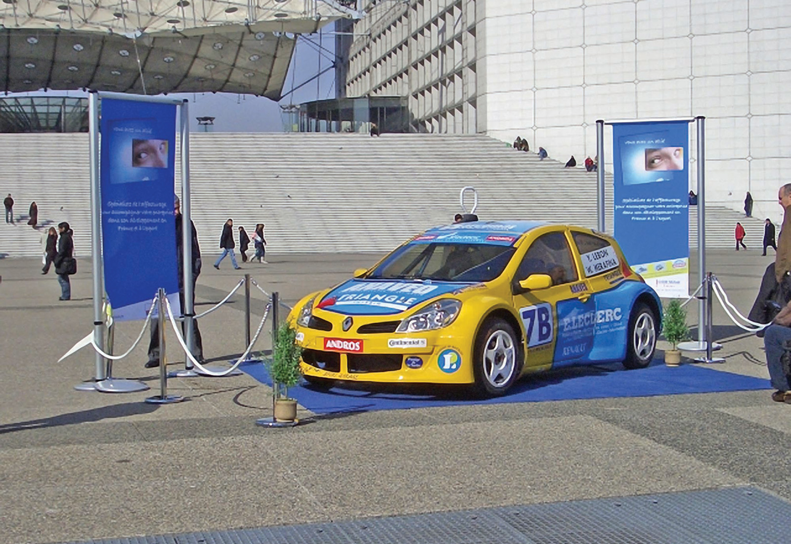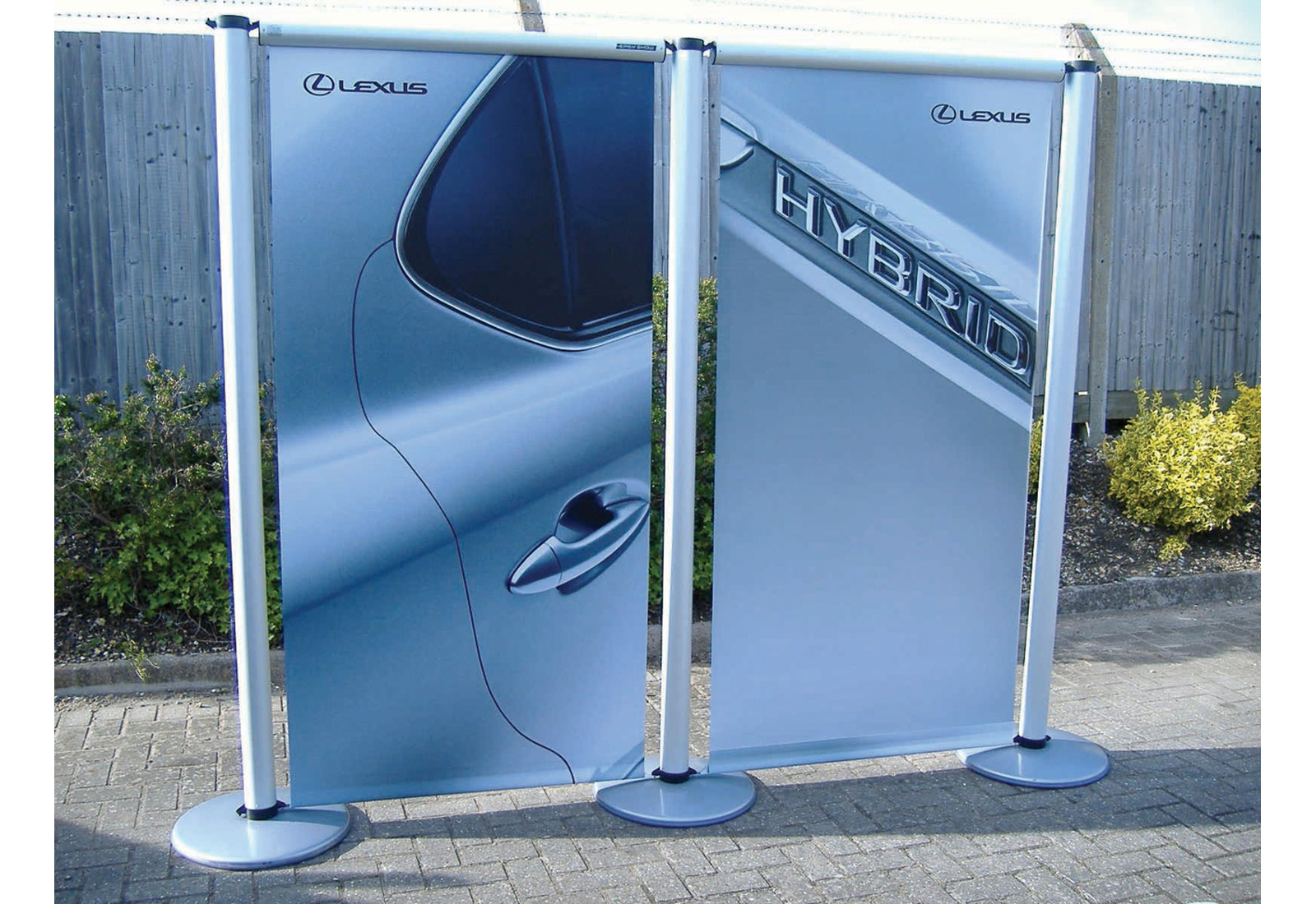 The RollWall EASY SHOW, originally designed for motorsports, is used both outdoors and indoors. EASY SHOW can be set up within a few minutes without tools. The high-quality system is made of aluminum and has special corrosion protection. The weather and UV resistant graphic is securely rolled into the connector between the columns and can be displayed by simply pulling it down. The system's base plates weigh 5 kg and have been tested up to wind force 6. For more demanding climates, foot plates with an individual weight of up to 15 kg are available. EASY SHOW offers a wide range of graphic formats, each of which can be enlarged in height and width in 0.5 m increments. Here are the print formats at a glance: H: 93 x W: 98 cm, 93 x 148 cm, 93 x 198 cm, 93 x 268 cm, 193 x 98 cm, 193 x 148 cm, 193 x 198 cm, 193 x 268 cm , 243 x 98 cm, 243 x 148 cm, 243 x 198 cm and 243 x 263 cm. The maximum size is H: 2.5 m x W: 2.7 m. Transport bags are available for the system supports and base plates upon request.